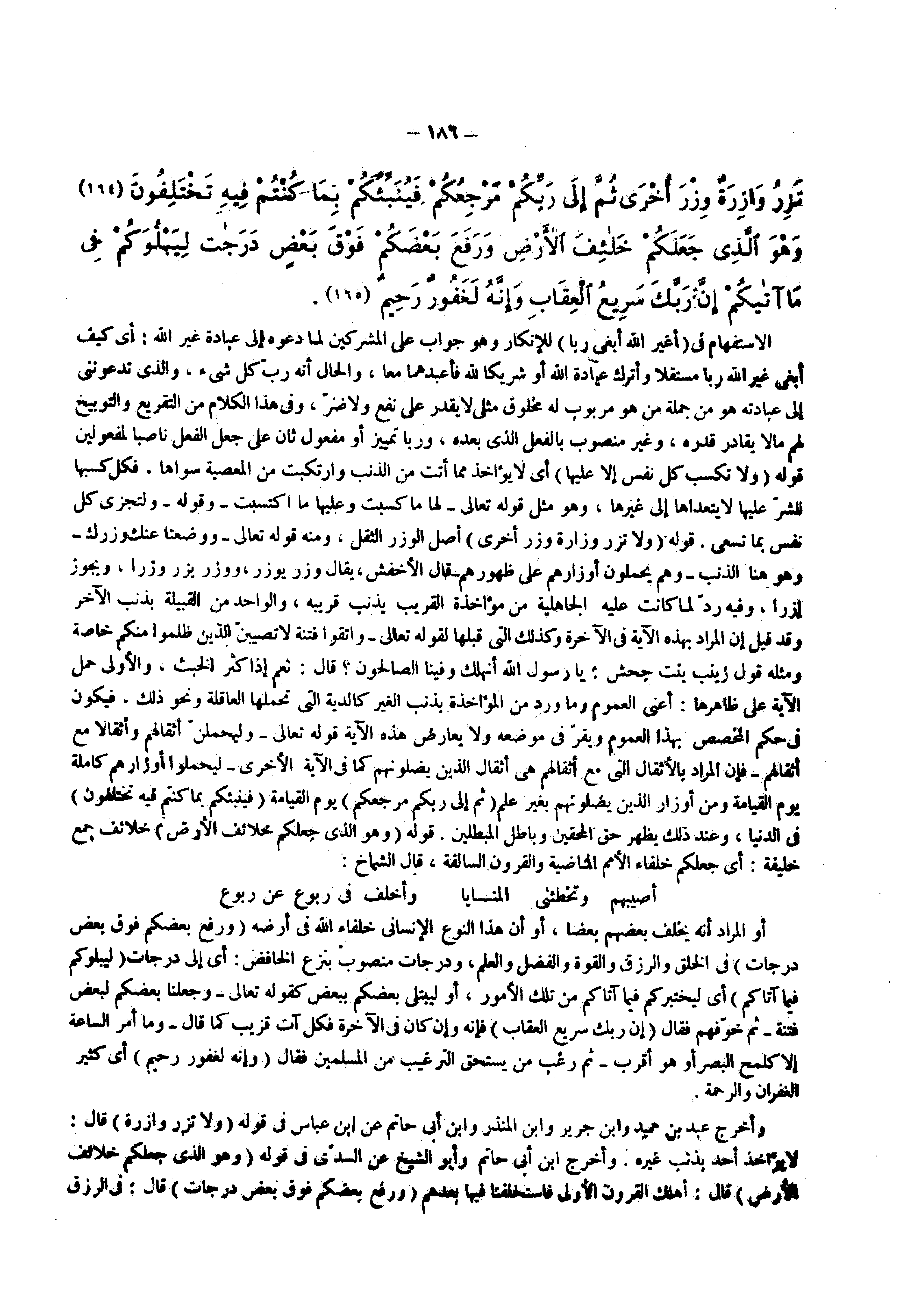 وأخرج عبد بن حميد وابن جرير وابن المنذر وابن أبي حاتم عن ابن عباس فى قوله ) ولا تزر وازرة ( قال لا يؤاخذ أحد بذنب غيره وأخرج ابن أبي حاتم وأبو الشيخ عن السدي فى قوله ) وهو الذي جعلكم خلائف الأرض ( قال أهلك القرون الأولى فاستخلفنا فيها بعدهم ) ورفع بعضكم فوق بعض درجات ( قال في الرزق