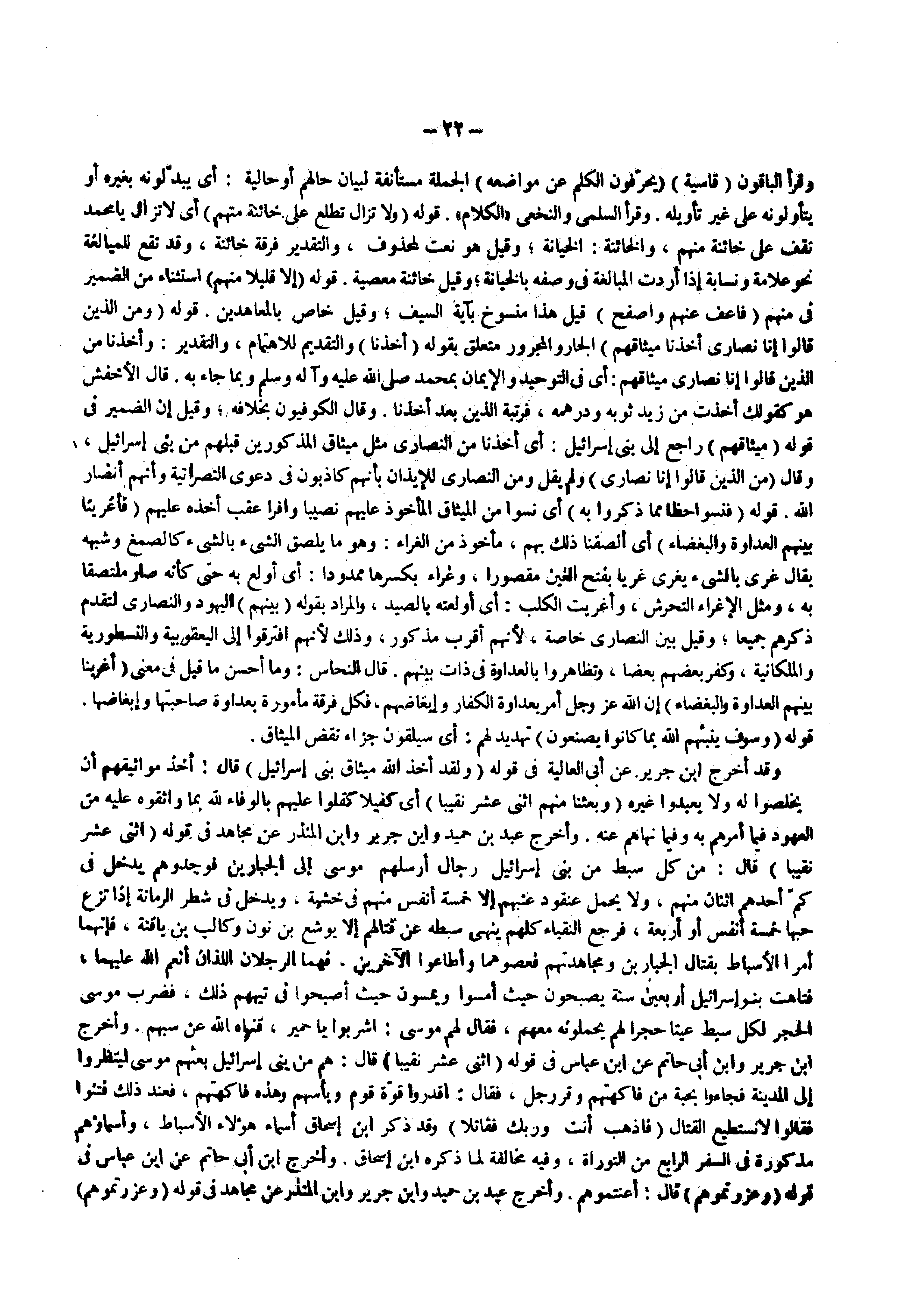 وقد أخرج ابن جرير عن أبي العالية فى قوله ) ولقد أخذ الله ميثاق بني إسرائيل ( قال أخذ مواثيقهم أن يخلصوا له ولا يعبدوا غيره ) وبعثنا منهم اثني عشر نقيبا ( أي كفيلا كفلوا عليهم بالوفاء لله بما واثقوه عليه من العهود فيما أمرهم به وفيما نهاهم عنه وأخرج عبد بن حميد وابن جرير وابن المنذر عن مجاهد في قوله ) اثني عشر نقيبا ( قال من كل سبط من بنى إسرائيل رجال أرسلهم موسى إلى الجبارين فوجدوهم يدخل فى كم أحدهم اثنان منهم ولا يحمل عنقود عنبهم إلا خمسة أنفس منهم في خشبة ويدخل في شطر الرمانة إذا نزع حبها خمسة أنفس أو أربعة فرجع النقباء كلهم ينهى سبطه عن قتالهم إلا يوشع بن نون وكالب بن يافنة فإنهما أمرا الأسباط بقتال الجبارين ومجاهدتهم فعصوهما وأطاعوا الآخرين فهما الرجلان اللذان أنعم الله عليهما فتاهت بنو إسرائيل أربعين سنة يصبحون حيث أمسوا ويمسون حيث أصبحوا فى تيههم ذلك فضرب موسى الحجر لكل سبط عينا حجرا لهم يحملونه معهم فقال لهم موسى اشربوا يا حمير فنهاه الله عن سبهم وأخرج ابن جرير وابن أبي حاتم عن ابن عباس في قوله ) اثني عشر نقيبا ( قال هم من بنى إسرائيل بعثهم موسى لينظروا إلى المدينة فجاءوا بحبه من فاكهتهم وقر رجل فقال اقدروا قوة قوم وبأسهم وهذه فاكهتهم فعند ذلك فتنوا فقالوا لا نستطيع القتال ) فاذهب أنت وربك فقاتلا ( وقد ذكر ابن إسحاق أسماء هؤلاء الأسباط وأسماؤهم مذكورة فى السفر الرابع من التوراة وفيه مخالفة لما ذكره ابن إسحاق وأخرج ابن أبي حاتم عن ابن عباس في قوله ) وعزرتموهم ( قال أعنتموهم وأخرج عبد بن حميد وابن جرير وابن المنذر عن مجاهد في قوله ) وعزرتموهم (