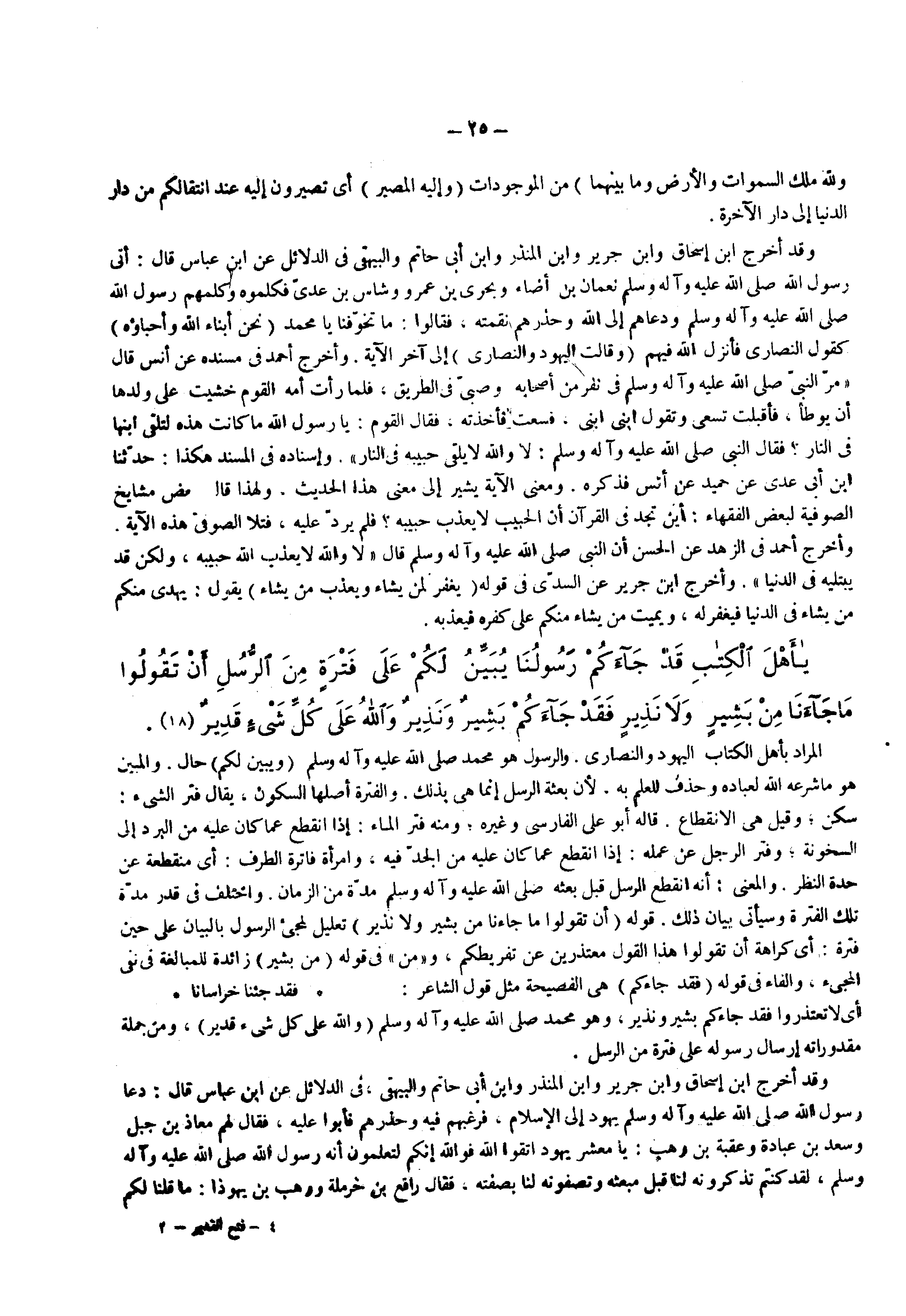 المراد بأهل الكتاب اليهود والنصارى والرسول هو محمد ( صلى الله عليه وسلم ) ويبين لكم حال والمبين هو ما شرعه الله لعباده وحذف للعلم به لأن بعثة الرسل إنما هي بذلك والفترة أصلها السكون يقال فتر الشيء سكن وقيل هي الانقطاع قاله أبو علي الفارسي وغيره ومنه فتر الماء إذا انقطع عما كان عليه من البرد إلى السخونة وفتر الرجل عن عمله إذا انقطع عما كان عليه من الجد فيه وامرأة فاترة الطرف أي منقطعة عن حدة النظر والمعنى أنه انقطع الرسل قبل بعثه ( صلى الله عليه وسلم ) مدة من الزمان واختلف في قدر مدة تلك الفترة وسيأتى بيان ذلك قوله ) أن تقولوا ما جاءنا من بشير ولا نذير ( تعليل لمجيء الرسول بالبيان على حين فترة أي كراهة أن تقولوا هذا القول معتذرين عن تفريطكم ومن في قوله ) من بشير ( زائدة للمبالغة في نفى المجئ والفاء في قوله ) فقد جاءكم ( هي الفصيحة مثل قول الشاعر فقد جئنا خراسانا
