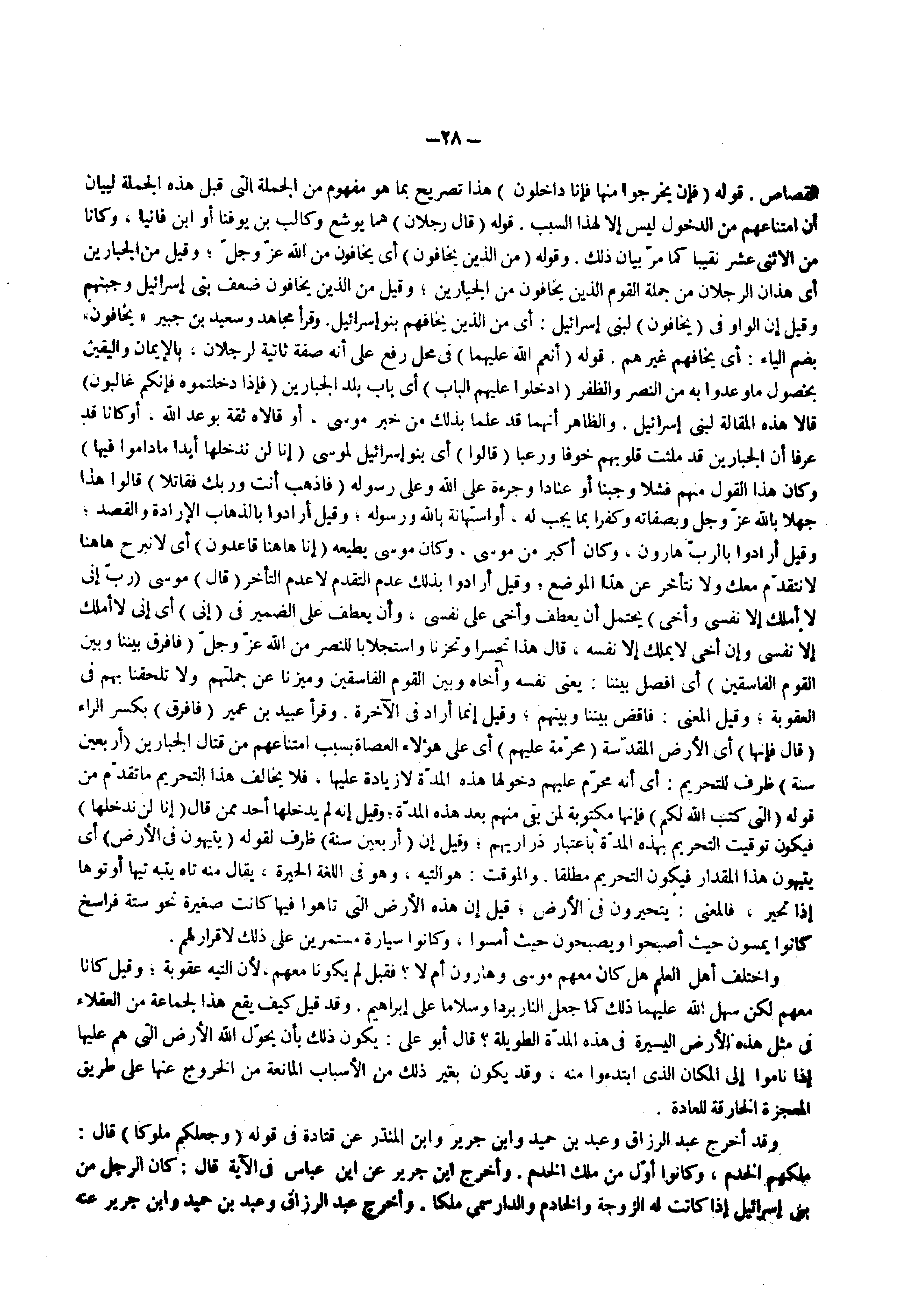 القصاص قوله ) فإن يخرجوا منها فإنا داخلون ( هذا تصريح بما هو مفهوم من الجملة التى قبل هذه الجملة لبيان أن امتناعهم من الدخول ليس إلا لهذا السبب