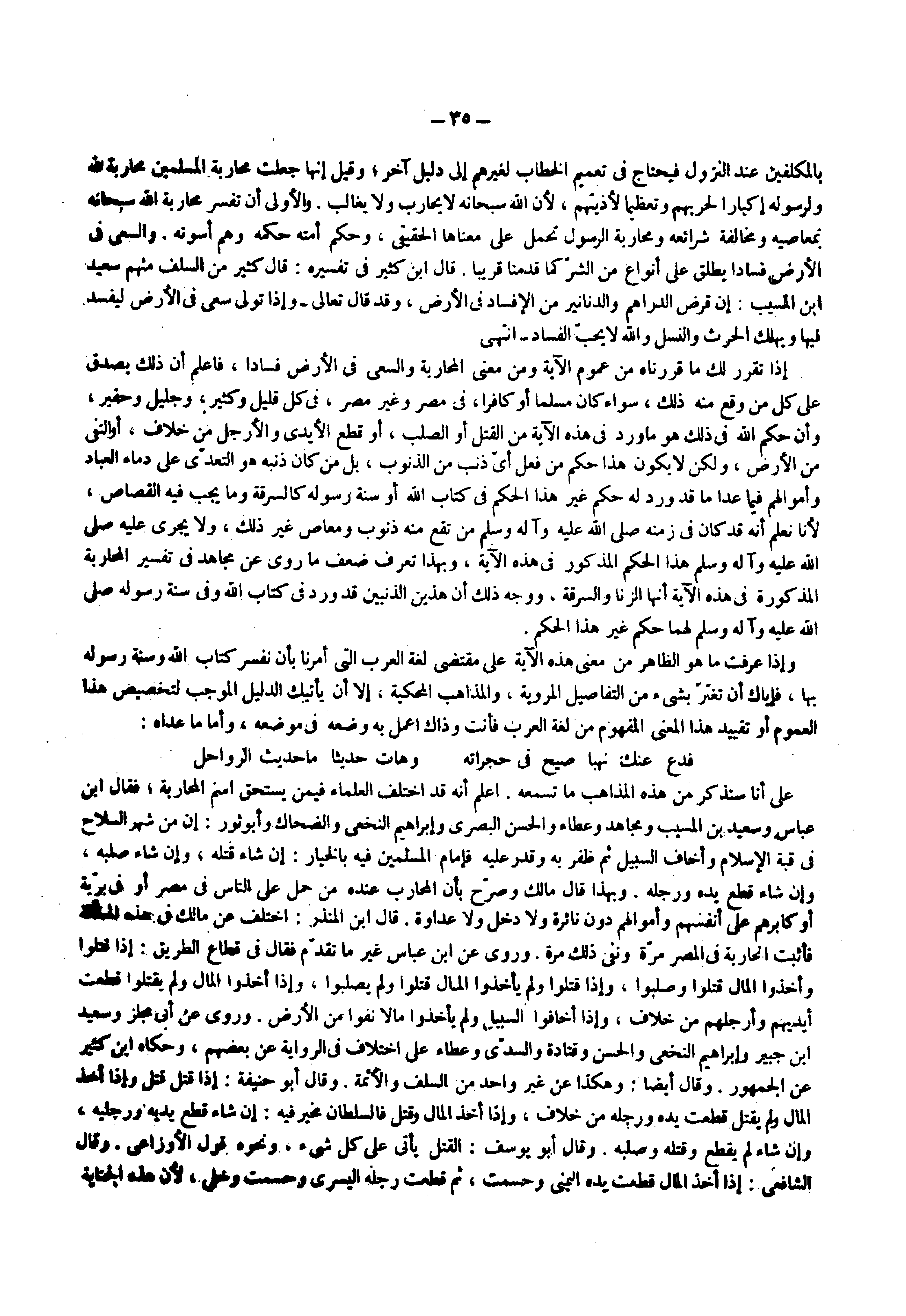 إذا تقرر لك ما قررناه من عموم الآية ومن معنى المحاربة والسعي فى الأرض فسادا فاعلم أن ذلك يصدق على كل من وقع منه ذلك سواء كان مسلما أو كافرا في مصر وغير مصر فى كل قليل وكثير وجليل وحقير وأن حكم الله فى ذلك هو ما ورد فى هذه الآية من القتل أو الصلب أو قطع الأيدي والأرجل من خلاف أو النفي من الأرض ولكن لا يكون هذا حكم من فعل أي ذنب من الذنوب بل من كان ذنبه هو التعدي على دماء العباد وأموالهم فيما عدا ما قد ورد له حكم غير هذا الحكم فى كتاب الله أو سنة رسوله كالسرقة وما يجب فيه القصاص لأنا نعلم أنه قد كان فى زمنه ( صلى الله عليه وسلم ) من تقع منه ذنوب ومعاص غير ذلك ولا يجري عليه ( صلى الله عليه وسلم ) هذا الحكم المذكور فى هذه الآية وبهذا تعرف ضعف ما روى عن مجاهد فى تفسير المحاربة المذكورة فى هذه الآية أنها الزنا والسرقة ووجه ذلك أن هذين الذنبين قد ورد فى كتاب الله وفى سنة رسوله ( صلى الله عليه وسلم ) لهما حكم غير هذا الحكم