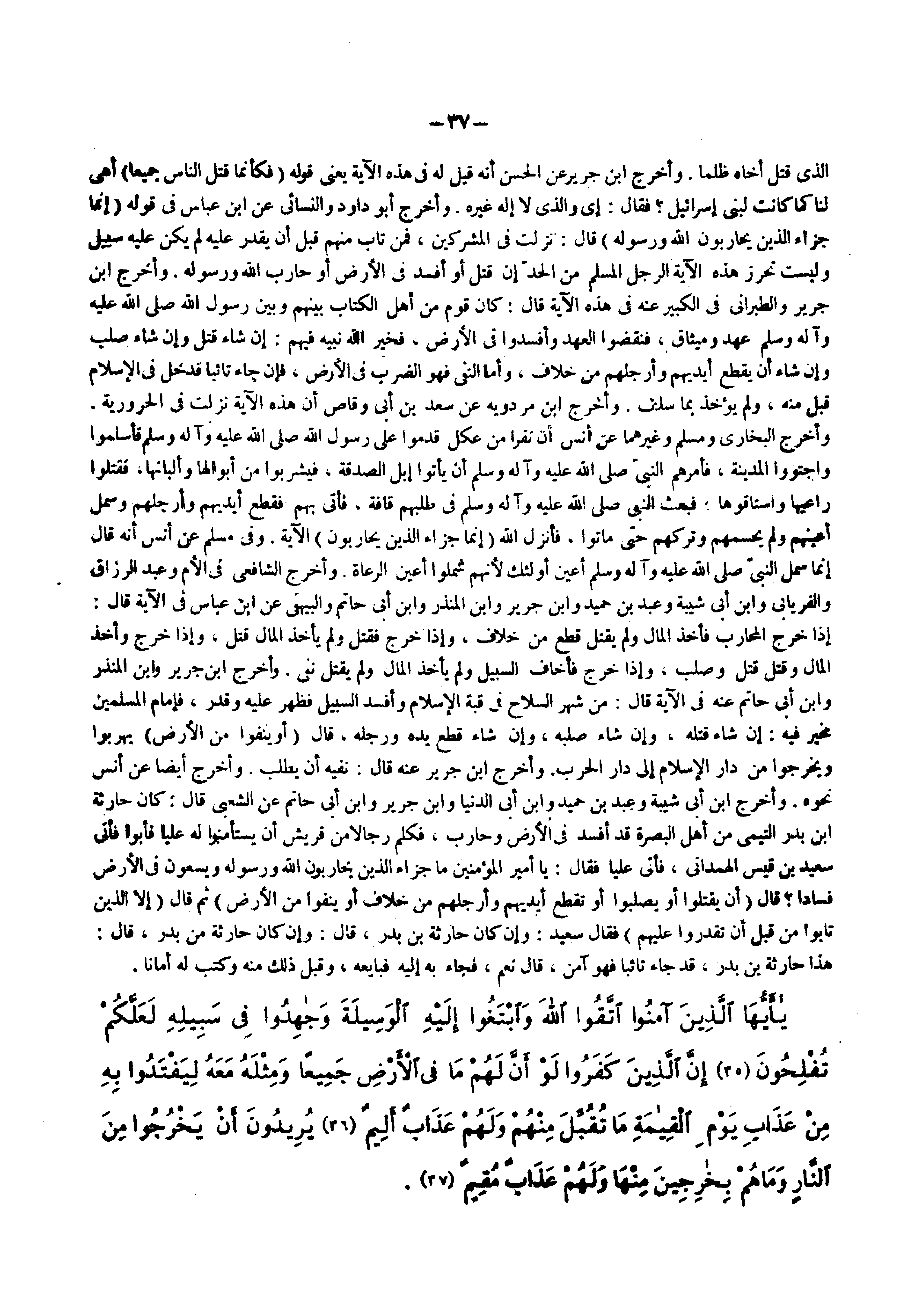 الذى قتل أخاه ظلما وأخرج ابن جرير عن الحسن أنه قيل له في هذه الآية يعنى قوله ) فكأنما قتل الناس جميعا ( أهى لنا كما كانت لبنى إسرائيل فقال إي والذى لا إله غيره وأخرج أبو داود والنسائي عن ابن عباس فى قوله ) إنما جزاء الذين يحاربون الله ورسوله ( قال نزلت فى المشركين فمن تاب منهم قبل أن يقدر عليه لم يكن عليه سبيل وليست تحرز هذه الآية الرجل المسلم من الحد إن قتل أو أفسد فى الأرض أو حارب الله ورسوله وأخرج ابن جرير والطبري فى الكبير عنه في هذه الآية قال كان قوم من أهل الكتاب بينهم وبين رسول الله ( صلى الله عليه وسلم ) عهد ميثاق فنقضوا العهد وأفسدوا في الأرض فخير الله نبيه فيهم إن شاء قتل وإن شاء صلب وإن شاء أن يقطع أيديهم وأرجلهم من خلاف وأما النفى فهو الضرب في الأرض فإن جاء تائبا فدخل فى الإسلام قبل منه ولم يؤخذ بما سلف وأخرج ابن مردويه عن سعد بن أبي وقاص أن هذه الآية نزلت فى الحرورية وأخرج البخاري ومسلم وغيرهما عن أنس أن نفرا من عكل قدموا على رسول الله ( صلى الله عليه وسلم ) فأسلموا واجتووا المدينة فأمرهم النبي ( صلى الله عليه وسلم ) أن يأتوا إبل الصدقة فيشربوا من أبوالها وألبانها فقتلوا راعيها واستاقوها فبعث النبي ( صلى الله عليه وسلم ) فى طلبهم قافة فأتى بهم فقطع أيديهم وأرجلهم وسمل أعينهم ولم يحسمهم وتركهم حتى ماتوا فأنزل الله ) إنما جزاء الذين يحاربون ( الآية وفى مسلم عن أنس أنه قال إنما سمل النبي ( صلى الله عليه وسلم ) أعين أولئك لأنهم سملوا أعين الرعاة وأخرج الشافعي فى الأم وعبد الرزاق والفرياني وابن أبي شيبة وعبد بن حميد وابن جرير وابن المنذر وابن أبي حاتم والبيهقي عن ابن عباس في الآية قال إذا خرج المحارب فأخذ المال ولم يقتل قطع مع خلاف وإذا خرج فقتل ولم يأخذ المال قتل وإذا خرج وأخذ المال وقتل قتل وصلب وإذا خرج فأخاف السبيل ولم يأخذ المال ولم يقتل نفى وأخرج ابن جرير وابن المنذر وابن أبي حاتم عنه في الآية قال من شهر السلاح فى قبة الإسلام وأفسد السبيل فظهر عليه وقدر فإمام المسلمين مخير فيه إن شاء قتله وإن شاء صلبه وإن شاء قطع يده ورجله قال ) أو ينفوا من الأرض ( يهربوا ويخرجوا من دار الإسلام إلى دار الحرب وأخرج ابن جرير عنه قال نفيه أن يطلب وأخرج أيضا عن أنس نحوه وأخرج ابن أبي شيبة وعبد بن حميد وابن أبي الدنيا وابن جرير وابن أبي حاتم عن الشعبي قال كان حارثة ابن بدر التيمي من أهل البصرة قد أفسد في الأرض وحارب فكلم رجالا من قريش أن يستأمنوا له عليا فأبوا فأتى سعيد بن قيس الهمداني فأتى عليا فقال يا أمير المؤمنين ما جزاء الذين يحاربون الله ورسوله ويسعون في الأرض فسادا قال ) أن يقتلوا أو يصلبوا أو تقطع أيديهم وأرجلهم من خلاف أو ينفوا من الأرض ( ثم قال ) إلا الذين تابوا من قبل أن تقدروا عليهم ( فقال سعيد وإن كان حارثة بن بدر قال وإن كان حارثة بن بدر قال هذا حارثة بن بدر قد جاء تائبا فهو آمن قال نعم فجاء به إليه فبايعه وقبل ذلك منه وكتب له أمانا
