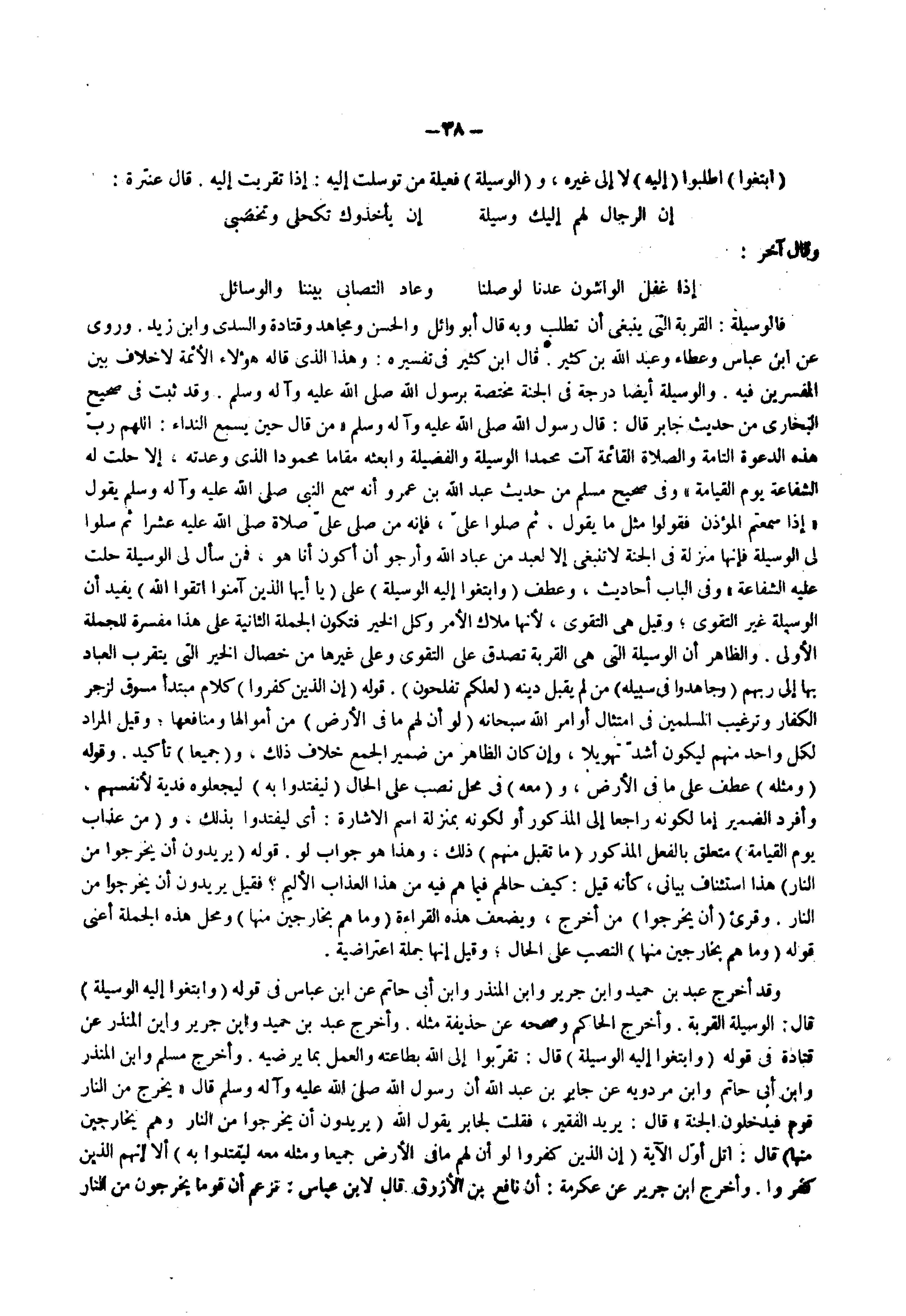 وقد أخرج عبد بن حميد وابن جرير وابن المنذر وابن أبي حاتم عن ابن عباس فى قوله ) وابتغوا إليه الوسيلة ( قال الوسيلة القربة وأخرج الحاكم وصححه عن حذيفة مثله وأخرج عبد بن حميد وابن جرير وابن المنذر عن قتادة في قوله ) وابتغوا إليه الوسيلة ( قال تقربوا إلى الله بطاعته والعمل بما يرضيه وأخرج مسلم وابن المنذر وابن أبي حاتم وابن مردويه عن جابر بن عبد الله أن رسول الله ( صلى الله عليه وسلم ) قال يخرج من النار قوم فيدخلون الجنة قال يريد الفقير فقلت لجابر يقول الله ) يريدون أن يخرجوا من النار وما هم بخارجين منها ( قال اتل أول الآية ) إن الذين كفروا لو أن لهم ما في الأرض جميعا ومثله معه ليفتدوا به ( ألا إنهم الذين كفروا وأخرج ابن جرير عن عكرمة أن نافع بن الأزرق قال لابن عباس تزعم أن قوما يخرجون من النار