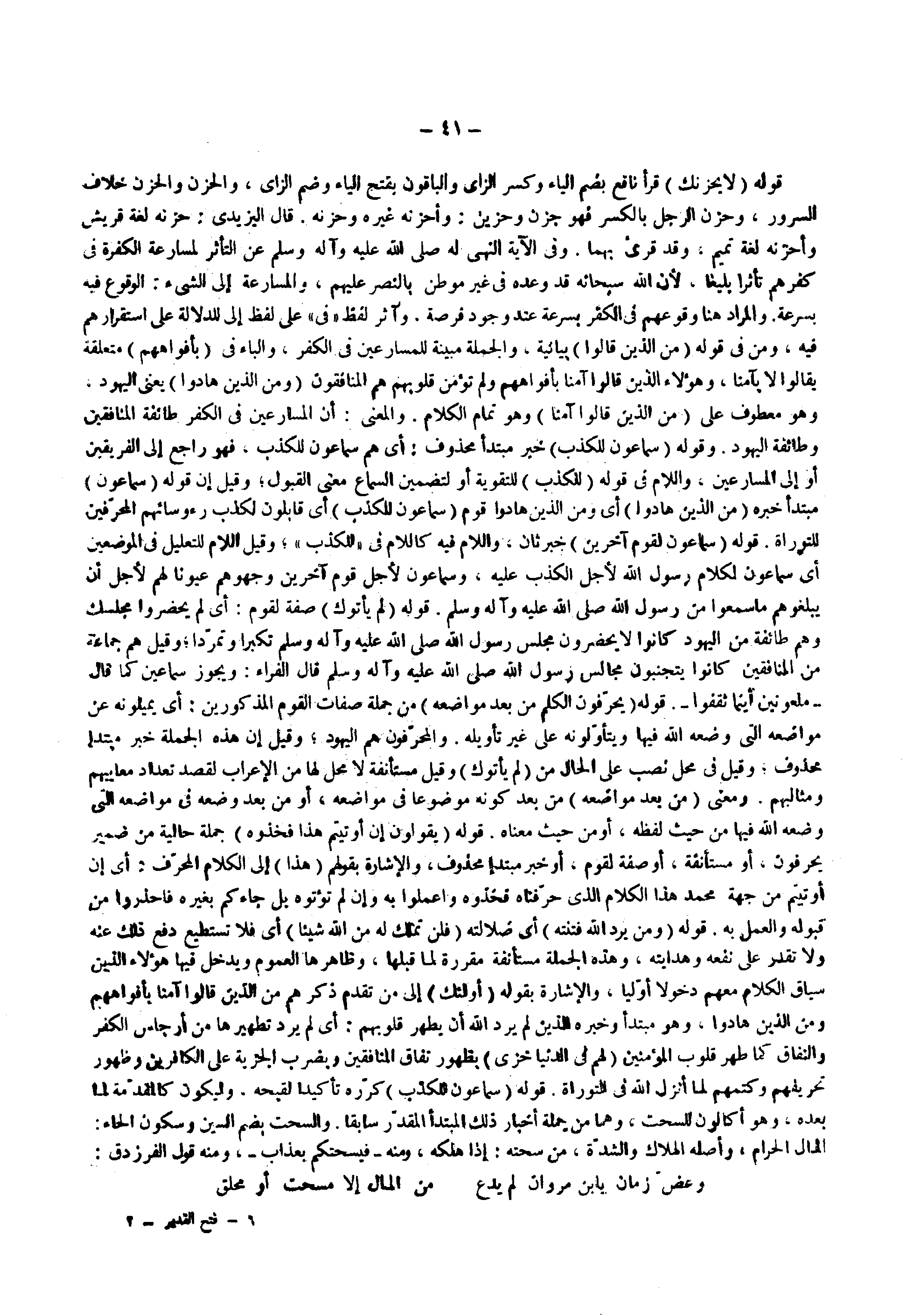 قوله ) لا يحزنك ( قرأ نافع بضم الياء وكسر الزاي والباقون بفتح الياء وضم الزاي والحزن والحزن خلاف السرور وحزن الرجل بالكسر فهو حزن وحزين وأحزنه غيره وحزنه قال اليزيدى حزنه لغة قريش وأحزنه لغة تميم وقد قرئ بهما وفى الآية النهى له ( صلى الله عليه وسلم ) عن التأثر لمسارعة الكفرة فى كفرهم تأثرا بليغا لأن الله سبحانه قد وعده فى غير موطن بالنصر عليهم والمسارعة إلى الشيء الوقوع فيه بسرعة والمراد هنا وقوعهم فى الكفر بسرعة عند وجود فرصة وآثر لفظ فى على لفظ إلى للدلالة على استقرارهم فيه ومن فى قوله ) من الذين قالوا ( بيانية والجملة مبينة للمسارعين فى الكفر والباء فى ) بأفواههم ( متعلقه بقالوا لا بآمنا وهؤلاء الذين قالوا آمنا بأفواههم ولم تؤمن قلوبهم هم المنافقون ) ومن الذين هادوا ( يعنى اليهود وهو معطوف على ) من الذين قالوا آمنا ( وهو تمام الكلام والمعنى أن المسارعين في الكفر طائفة المنافقين وطائفة اليهود وقوله ) سماعون للكذب ( خبر مبتدأ محذوف أي هم سماعون للكذب فهو راجع إلى الفريقين أو إلى المسارعين واللام فى قوله ) للكذب ( للتقوية أو لتضمين السماع معنى القبول وقيل إن قوله ) سماعون ( مبتدأ خبره ) من الذين هادوا ( أي ومن الذين هادوا قوم ) سماعون للكذب ( أي قابلون لكذب رءوسائهم المحرفين للتوراة قوله ) سماعون لقوم آخرين ( خبر ثان واللام فيه كاللام في للكذب وقيل اللام للتعليل فى الموضعين أي سماعون لكلام رسول الله لأجل الكذب عليه وسماعون لأجل قوم آخرين وجهوهم عيونا لهم لأجل أن يبلغوهم ما سمعوا من رسول الله ( صلى الله عليه وسلم ) قوله ) لم يأتوك ( صفة لقوم أي لم يحضروا مجلسك وهم طائفة من اليهود كانوا لا يحضرون مجلس رسول الله ( صلى الله عليه وسلم ) تكبرا وتمردا وقيل هم جماعة من المنافقين كانوا يتجنبون مجالس رسول الله ( صلى الله عليه وسلم ) قال الفراء ويجوز سماعين كما قال ) ملعونين أينما ثقفوا ( قوله ) يحرفون الكلم من بعد مواضعه ( من جملة صفات القوم المذكورين أي يميلونه عن مواضعه التى وضعه الله فيها ويتأولونه على غير تأويله والمحرفون هم اليهود وقيل إن هذه الجملة خبر مبتدأ محذوف وقيل في محل نصب على الحال من ) لم يأتوك ( وقيل مستأنفة لا محل لها من الإعراب لقصد تعداد معايبهم ومثالبهم ومعنى ) من بعد مواضعه ( من بعد كونه موضوعا في مواضعه أو من بعد وضعه في مواضعه التى وضعه الله فيها من حيث لفظه أو من حيث معناه قوله ) يقولون إن أوتيتم هذا فخذوه ( جملة حالية من ضمير يحرفون أو مستأنفة أو صفة لقوم أو خبر مبتدأ محذوف والإشارة بقولهم ) هذا ( إلى الكلام المحرف أي إن أوتيتم من جهة محمد هذا الكلام الذى حرفناه فخذوه واعملوا به وإن لم تؤتوه بل جاءكم بغيره فاحذروا من قبوله والعمل به قوله ) ومن يرد الله فتنته ( أي ضلالته ) فلن تملك له من الله شيئا ( أي فلا تستطيع دفع ذلك عنه ولا تقدر على نفعه وهدايته وهذه الجملة مستأنفة مقررة لما قبلها وظاهرها العموم ويدخل فيها هؤلاء الذين سياق الكلام معهم دخولا أوليا والإشارة بقوله ) أولئك ( إلى من تقدم من ذكرهم من الذين قالوا آمنا بأفواههم ومن الذين هادوا وهو مبتدأ وخبره الذين لم يرد الله أن يطهر قلوبهم أي لم يرد تطهيرها من أرجاس الكفر والنفاق كما طهر قلوب المؤمنين ) لهم في الدنيا خزي ( بظهور نفاق المنافقين وبضرب الجزية على الكافرين وظهور تحريفهم وكتمهم لما أنزل الله في التوراة