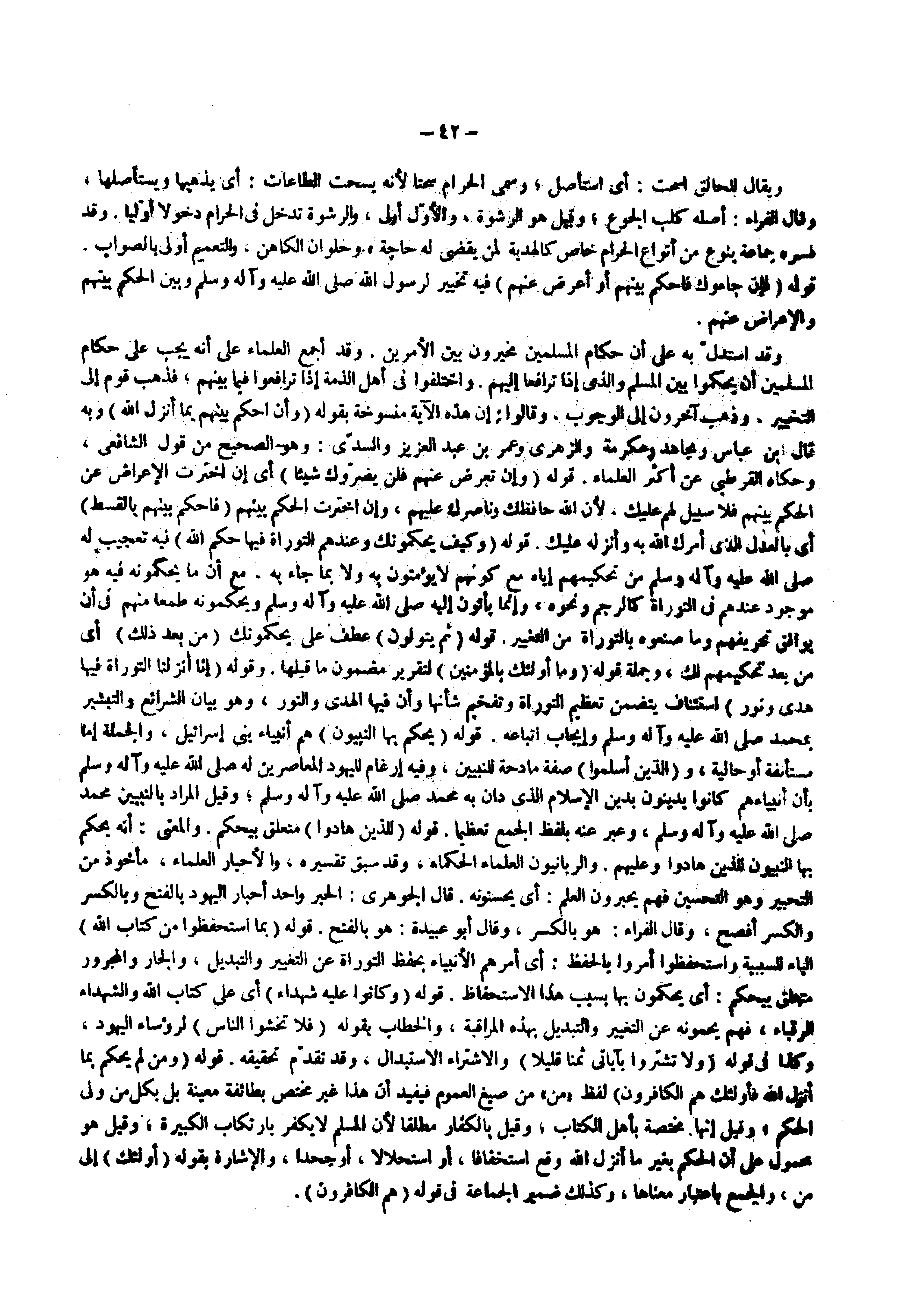 وقوله ) إنا أنزلنا التوراة فيها هدى ونور ( استئناف يتضمن تعظيم التوراة وتفخيم شأنها وأن فيها الهدى والنور وهو بيان الشرائع والتبشير بمحمد ( صلى الله عليه وسلم ) وإيجاب اتباعه قوله ) يحكم بها النبيون ( هم أنبياء بنى إسرائيل والجملة إما مستأنفة أو حالية و ) الذين أسلموا ( صفة مادحة للنبيين وفيه إرغام لليهود المعاصرين له ( صلى الله عليه وسلم ) بأن أنبياءهم كانوا يدينون بدين الإسلام الذى دان به محمد ( صلى الله عليه وسلم ) وقيل المراد بالنبيين محمد ( صلى الله عليه وسلم ) وعبر عنه بلفظ الجمع تعظيما قوله ) للذين هادوا ( متعلق بيحكم والمعنى أنه يحكم بها النبيون للذين هادوا وعليهم والربانيون العلماء الحكماء وقد سبق تفسيره والأحبار العلماء مأخوذ من التحبير وهو التحسين فهم يحبرون العلم أي يحسنونه قال الجوهري الحبر واحد أحبار اليهود بالفتح وبالكسر والكسر أفصح وقال الفراء هو بالكسر وقال أبو عبيدة هو بالفتح قوله ) بما استحفظوا من كتاب الله ( الباء للسببية واستحفظوا أمروا بالحفظ أي أمرهم الأنبياء بحفظ التوراة عن التغيير والتبديل والجار والمجرور متعلق بيحكم أي يحكمون بها بسبب هذا الاستحفاظ قوله ) وكانوا عليه شهداء ( أي على كتاب الله والشهداء الرقباء فهم يحمونه عن التغيير والتبديل بهذه المراقبة والخطاب بقوله ) فلا تخشوا الناس ( لرؤساء اليهود وكذا في قوله ) ولا تشتروا بآياتي ثمنا قليلا ( والاشتراء والاستبدال وقد تقدم تحقيقه قوله ) ومن لم يحكم بما أنزل الله فأولئك هم الكافرون ( لفظ من من صيغ العموم فيفيد أن هذا غير مختص بطائفة معينة بل بكل من ولى الحكم وقيل إنها مختصة بأهل الكتاب وقيل بالكفار مطلقا لأن المسلم لا يكفر بارتكاب الكبيرة وقيل هو محمول على أن الحكم بغير ما أنزل الله وقع استخفافا أو استحلالا أو جحدا والإشارة بقوله ) أولئك ( إلى من والجمع باعتبار معناها وكذلك ضمير الجماعة في قوله ) هم الكافرون (