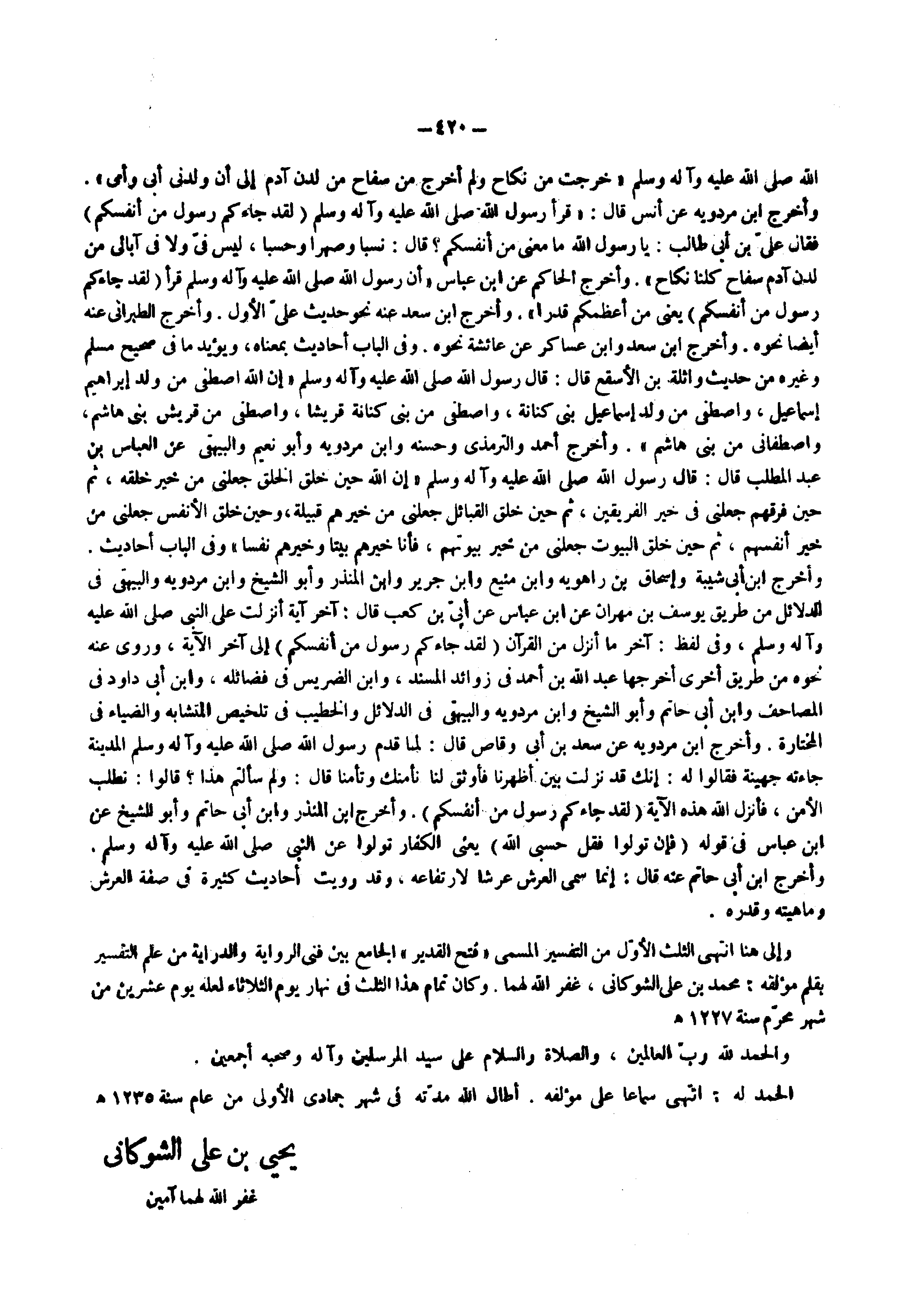 وإلى هنا انتهى الثلث الأول من التفسير المسمى فتح القدير الجامع بين فني الرواية والدراية من علم التفسير بقلم مؤلفه محمد بن علي الشوكاني غفر الله لهما وكان تمام هذا الثلث في نهار الثلاثاء لعله يوم عشرين من شهر محرم سنة 1227 ه