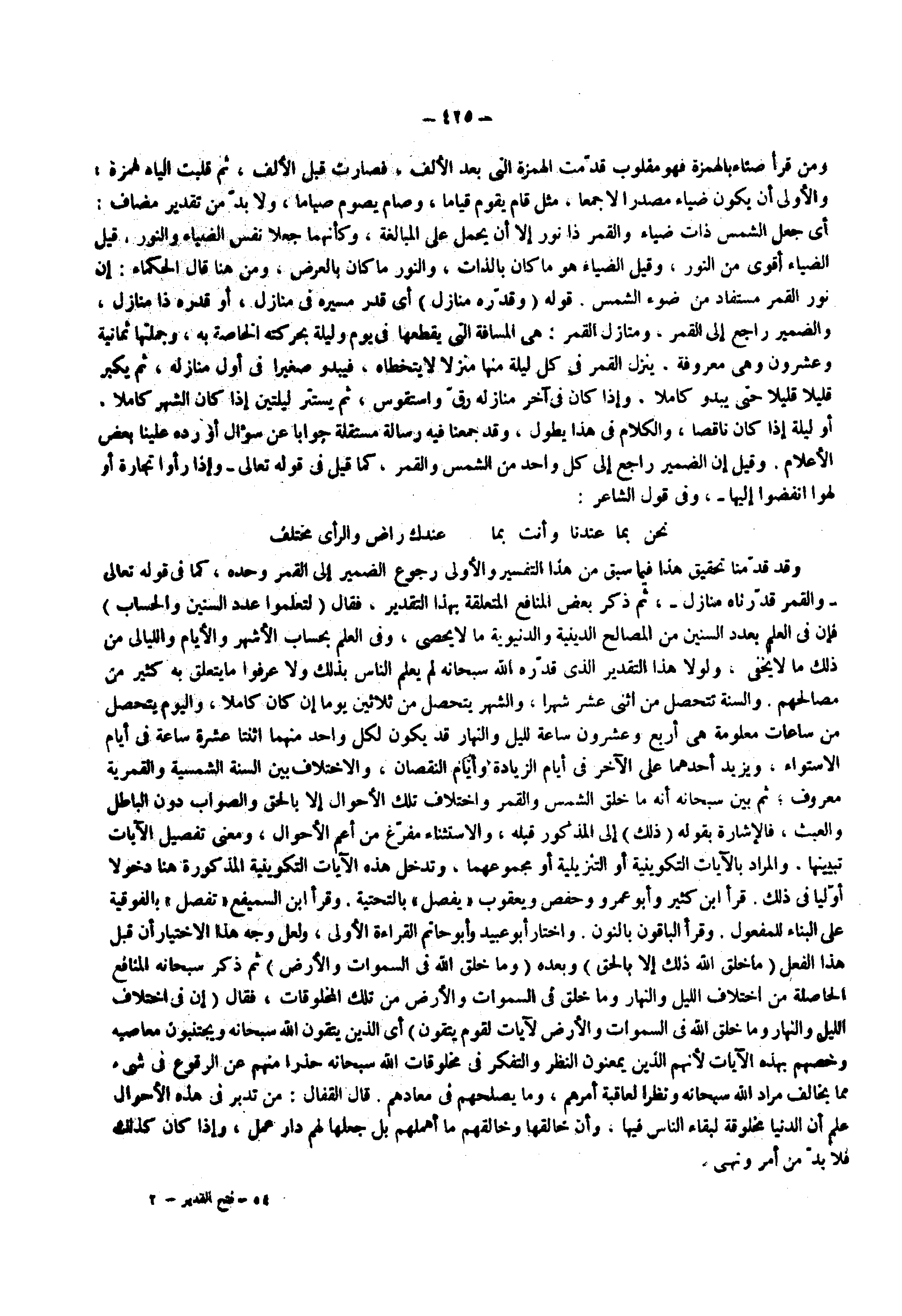 ومن قرأ ضئاء بالهمزة فهو مقلوب قدمت الهمزة التى بعد الألف فصارت قبل الألف ثم قلبت الياء همزة والأولى أن يكون ضياء مصدرا لا جمعا مثل قام يقوم قياما وصام يصوم صياما ولا بد من تقدير مضاف أي جعل الشمس ذات ضياء والقمر ذا نور إلا أنه يحمل على المبالغة وكأنهما جعلا نفس الضياء والنور قيل الضياء أقوى من النور وقيل الضياء هو ما كان بالذات والنور ما كان بالعرض ومن هنا قال الحكماء إن نور القمر مستفاد من ضوء الشمس قوله ) وقدره منازل ( أي قدر مسيره في منازل أو قدره ذا منازل والضمير راجع إلى القمر ومنازل القمر هى المسافة التى يقطعها في يوم وليلة بحركته الخاصة به وجملتها ثمانية وعشرون وهى معروفة ينزل القمر في كل ليلة منها منزل لا يتخطاه فيبدو صغيرا في أول منازله ثم يكبر قليلا قليلا حتى يبدو كاملا وإذا كان في آخر منازله رق واستقوس ثم يستتر ليلتين إذا كان الشهر كاملا أو ليلة إذا كان ناقصا والكلام في هذا يطول وقد جمعنا فيه رساله مستقلة جوابا عن سؤال أو رده علينا بعض الأعلام وقيل إن الضمير راجع إلى كل واحد من الشمس والقمر كما قيل في قوله تعالى ) وإذا رأوا تجارة أو لهوا انفضوا إليها ( وفي قول الشاعر نحن بما عندنا وأنت بما
