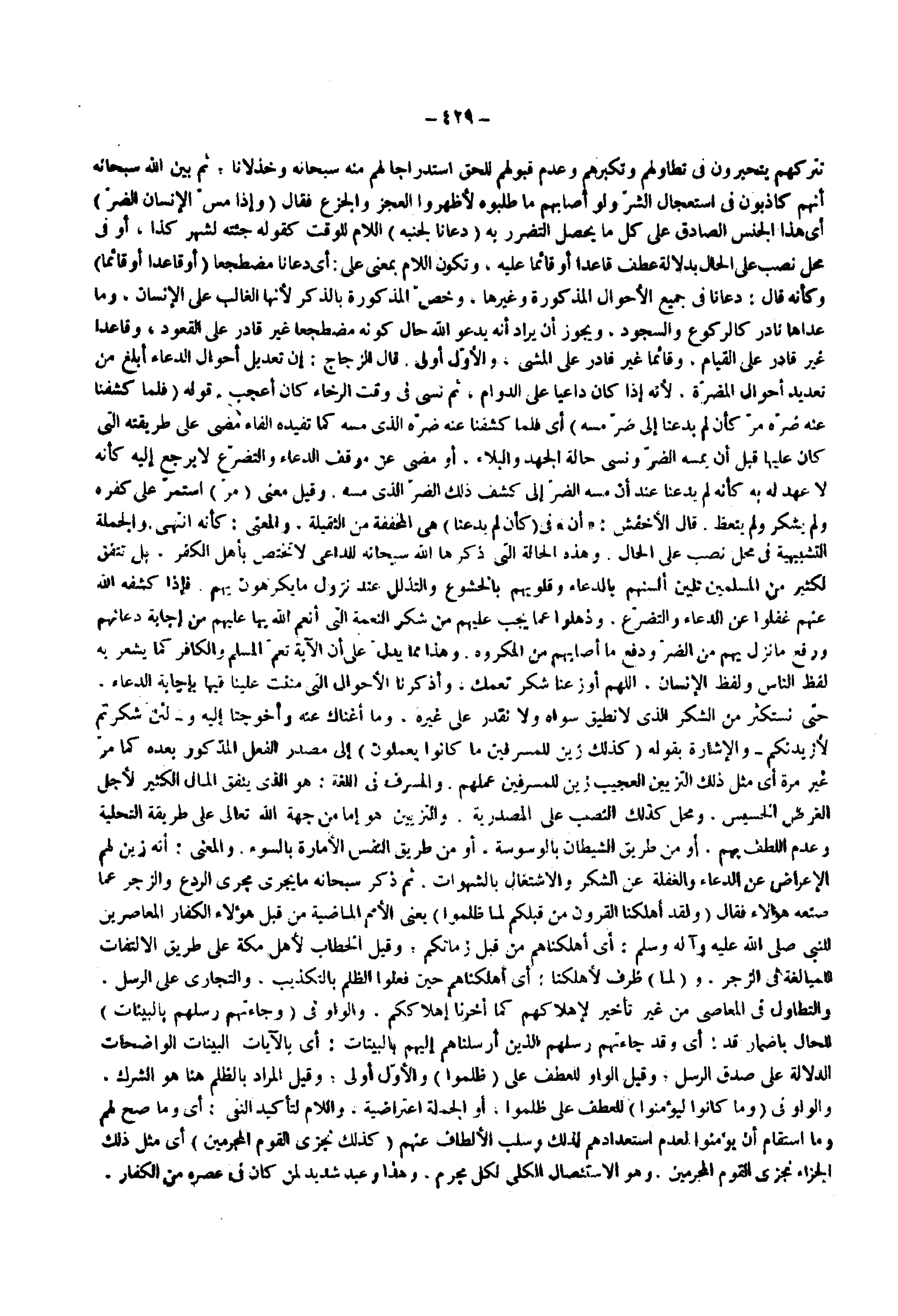 ثم بين الله سبحانه أنهم كاذبون في استعجال الشر ولو أصابهم ما طلبوه لأظهروا العجز والجزع فقال ) وإذا مس الإنسان الضر ( أي هذا الجنس الصادق على كل ما يحصل التضرر به ) دعانا لجنبه ( اللام للوقت كقوله جئته لشهر كذا أو في محل نصب على الحال بدلالة عطف قاعدا أو قائما عليه وتكون اللام بمعنى على أي دعانا مضطجعا ) أو قاعدا أو قائما ( وكأنه قال دعانا في جميع الأحوال المذكورة وغيرها وخص المذكورة بالذكر لأنها الغالب على الإنسان وما عداها نادر كالركوع والسجود ويجوز أن يراد أنه يدعو الله حال كونه مضطجعا غير قادر على القعود وقاعدا غير قادر على القيام وقائما غير قادر على المشي والأول أولى قال الزجاج إن تعديل أحوال الدعاء أبلغ من تعديد أحوال المضرة لأنه إذا كان داعيا على الدوام ثم نسى في وقت الرخاء كان أعجب قوله ) فلما كشفنا عنه ضره مر كأن لم يدعنا إلى ضر مسه ( أي فلما كشفنا عنه ضره الذى مسه كما تفيده الفاء مضى على طريقته التى كان عليها قبل أن يمسه الضر ونسى حالة الجهد والبلاء أو مضى عن موقف الدعاء والتضرع لا يرجع إليه كأنه لا عهد له به كأنه لم يدعنا عند أن مسه الضر إلى كشف ذلك الضر الذى مسه وقيل معنى ) مر ( استمر على كفره ولم يشكر ولم يتعظ قال الأخفش ) إن ( في ) كأن لم يدعنا ( هى المخففة من الثقيلة والمعنى كأنه انتهى والجملة التشبيهية في محل نصب على الحال وهذه الحالة التى ذكرها الله سبحانه للداعي لا تختص بأهل الكفر بل تتفق لكثير من المسلمين تلين ألسنهم بالدعاء وقلوبهم بالخشوع والتذلل عند نزول ما يكرهون بهم فإذا كشفه الله عنهم غفلوا عن الدعاء والتضرع وذهلوا عما يجب عليهم من شكر النعمة التى أنعم الله بها عليهم من إجابة دعائهم ورفع ما نزل بهم من الضر ودفع ما أصابهم من المكروه وهذا مما يدل على أن الآية تعم المسلم والكافر كما يشعر به لفظ الناس ولفظ الإنسان اللهم أوزعنا شكر نعمك وأذكرنا الأحوال التى مننت علينا فيها بإجابة الدعاء حتى نستكثر من الشكر الذى لا نطيق سواه ولا نقدر على غيره وما أغناك عنه وأحوجنا إليه و ) لئن شكرتم لأزيدنكم ( والإشارة بقوله ) كذلك زين للمسرفين ما كانوا يعملون ( إلى مصدر الفعل المذكور بعده كما مر غير مرة أي مثل ذلك التزيين العجيب زين للمسرفين عملهم والمسرف في اللغة هو الذى ينفق المال الكثير لأجل الغرض الخسيس ومحل كذلك النصب على المصدرية والتزيين هو إما من جهة الله تعالى على طريقة التحلية وعدم اللطف بهم أو من طريق الشيطان بالوسوسة أو من طريق النفس الأمارة بالسوء والمعنى أنه زين لهم الإعراض عن الدعاء والغفلة عن الشكر والاشتغال بالشهوات