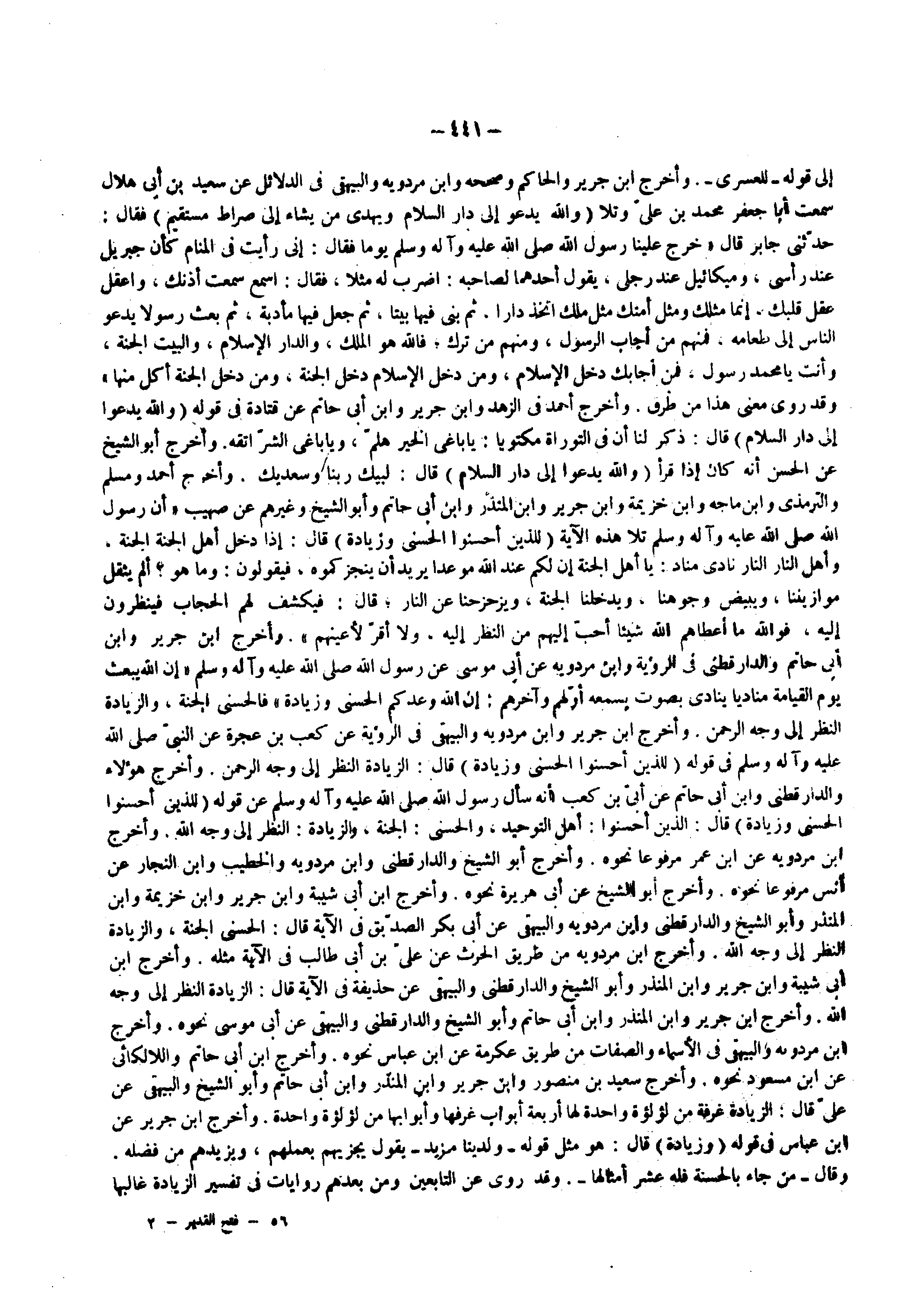 وقد روى معنى هذا من طرق وأخرج أحمد في الزهد وابن جرير وابن أبي حاتم عن قتادة في قوله ) والله يدعو إلى دار السلام ( قال ذكر لنا أن في التوراة مكتوبا يا باغي الخير هلم ويا باغي الشر اتقه وأخرج أبو الشيخ عن الحسن أنه كان إذا قرأ ) والله يدعو إلى دار السلام ( قال لبيك ربنا وسعديك وأخرج أحمد ومسلم والترمذي وابن ماجه وابن خزيمة وابن جرير وابن المنذر وابن أبي حاتم وأبو الشيخ وغيرهم عن صهيب أن رسول الله ( صلى الله عليه وسلم ) تلا هذه الآية ) للذين أحسنوا الحسنى وزيادة ( قال إذا دخل أهل الجنة الجنة وأهل النار النار نادى مناد يا أهل الجنة إن لكم عند الله موعدا يريد أن ينجزكموه فيقولون وما هو ألم يثقل موازيننا ويبيض وجوهنا ويدخلنا الجنة ويزحزحنا عن النار قال فيكشف لهم الحجاب فينظرون إليه فوالله ما أعطاهم الله شيئا أحب إليهم من النظر إليه ولا أقر لأعينهم وأخرج ابن جرير وابن أبي حاتم والدارقطني في الرؤية وابن مردويه عن أبي موسى عن رسول الله ( صلى الله عليه وسلم ) إن الله يبعث يوم القيامة مناديا ينادي بصوت يسمعه أولهم وآخرهم إن الله وعدكم الحسنى وزيادة فالحسنى الجنة والزيادة النظر إلى وجه الرحمن وأخرج ابن جرير وابن مردويه والبيهقي في الرؤية عن كعب عن عجرة عن النبي ( صلى الله عليه وسلم ) في قوله ) للذين أحسنوا الحسنى وزيادة ( قال الزيادة النظر إلى وجه الرحمن وأخرج هؤلاء والدارقطني وابن أبي حاتم عن أبي بن كعب أنه سأل رسول الله صلى الله عليه وآله سلم عن قوله ) للذين أحسنوا الحسنى وزيادة ( قال الذين أحسنوا أهل التوحيد والحسنى الجنة والزيادة النظر إلى وجه الله وأخرج ابن مردويه عن ابن عمر مرفوعا نحوه وأخرج أبو الشيخ والدارقطني وابن مردويه والخطيب وابن النجار عن أنس مرفوعا نحوه وأخرج أبو الشيخ عن أبي هريرة نحوه وأخرج ابن أبي شيبة وابن جرير وابن خزيمة وابن المنذر وأبو الشيخ والدارقطني وابن مردويه والبيهقي عن أبي بكر الصديق في الآية قال الحسنى الجنة والزيادة النظر إلى وجه الله وأخرج ابن مردويه من طريق الحرث عن علي بن أبي طالب في الآية مثله وأخرج ابن أبي شيبة وابن جرير وابن المنذر وأبو الشيخ والدارقطني والبيهقي عن حذيفة في الآية قال الزيادة النظر إلى وجه الله وأخرج ابن جرير وابن المنذر وابن أبي حاتم وأبو الشيخ والدارقطني والبيهقي عن أبي موسى نحوه وأخرج ابن مردويه والبيهقي في الأسماء والصفات من طريق عكرمة عن ابن عباس نحوه وأخرج ابن أبي حاتم واللالكائي عن ابن مسعود نحوه وأخرج سعيد بن منصور وابن جرير وابن المنذر وابن أبي حاتم وأبو الشيخ والبيهقي عن علي قال الزيادة غرفة من لؤلؤة واحدة لها أربعة أبواب غرفها وأبوابها من لؤلؤة واحدة وأخرج ابن جرير عن ابن عباس في قوله ) وزيادة ( قال هو مثل قوله ) ولدينا مزيد ( يقول يخزيهم بعملهم ويزيدهم من فضله