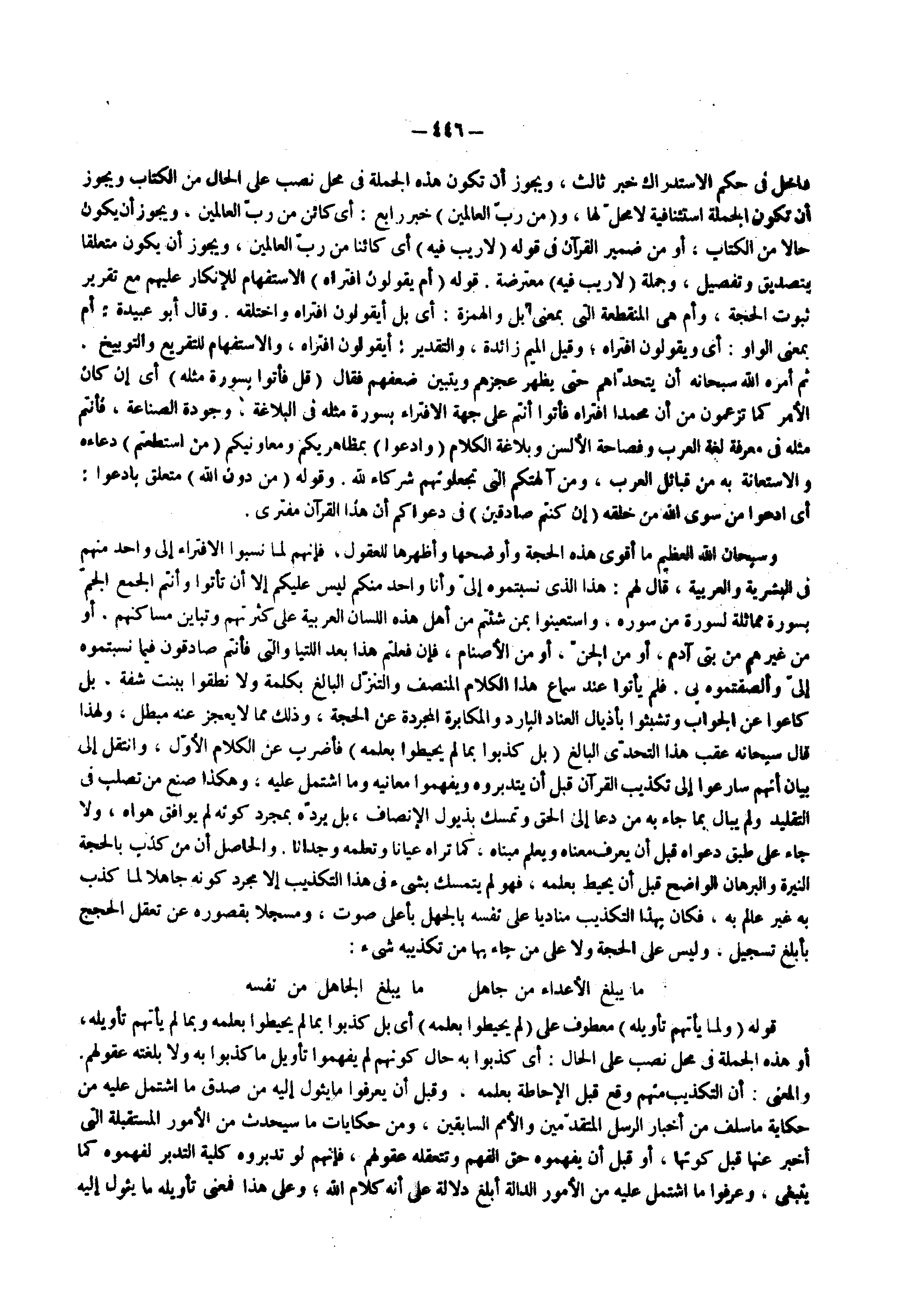 وسبحان الله العظيم ما أقوى هذه الحجة وأوضحها وأظهرها للعقول فإنهم لما نسبوا الافتراء إلى واحد منهم في البشرية والعربية قال لهم هذا الذى نسبتموه إلي وأنا واحد منكم ليس عليكم إلا أن تأتوا وأنتم الجمع الجم بسورة مماثلة لسورة من سوره واستعينوا بمن شئتم من أهل هذه اللسان العربية على كثرتهم وتباين مساكنهم أو من غيرهم من بني آدم أو من الجن أو من الأصنام فإن فعلتم هذا بعد اللتيا والتى فأنتم صادقون فيما نسبتموه إلي وألصقتموه بي فلم يأتوا عند سماع هذا الكلام المنصف والتنزل البالغ بكلمة ولا نطقوا ببنت شفة بل كاعوا عن الجواب وتشبثوا بأذيال العناد البارد والمكابرة المجردة عن الحجة وذلك مما لا يعجز عنه مبطل ولهذا قال سبحانه عقب هذا التحدي البالغ