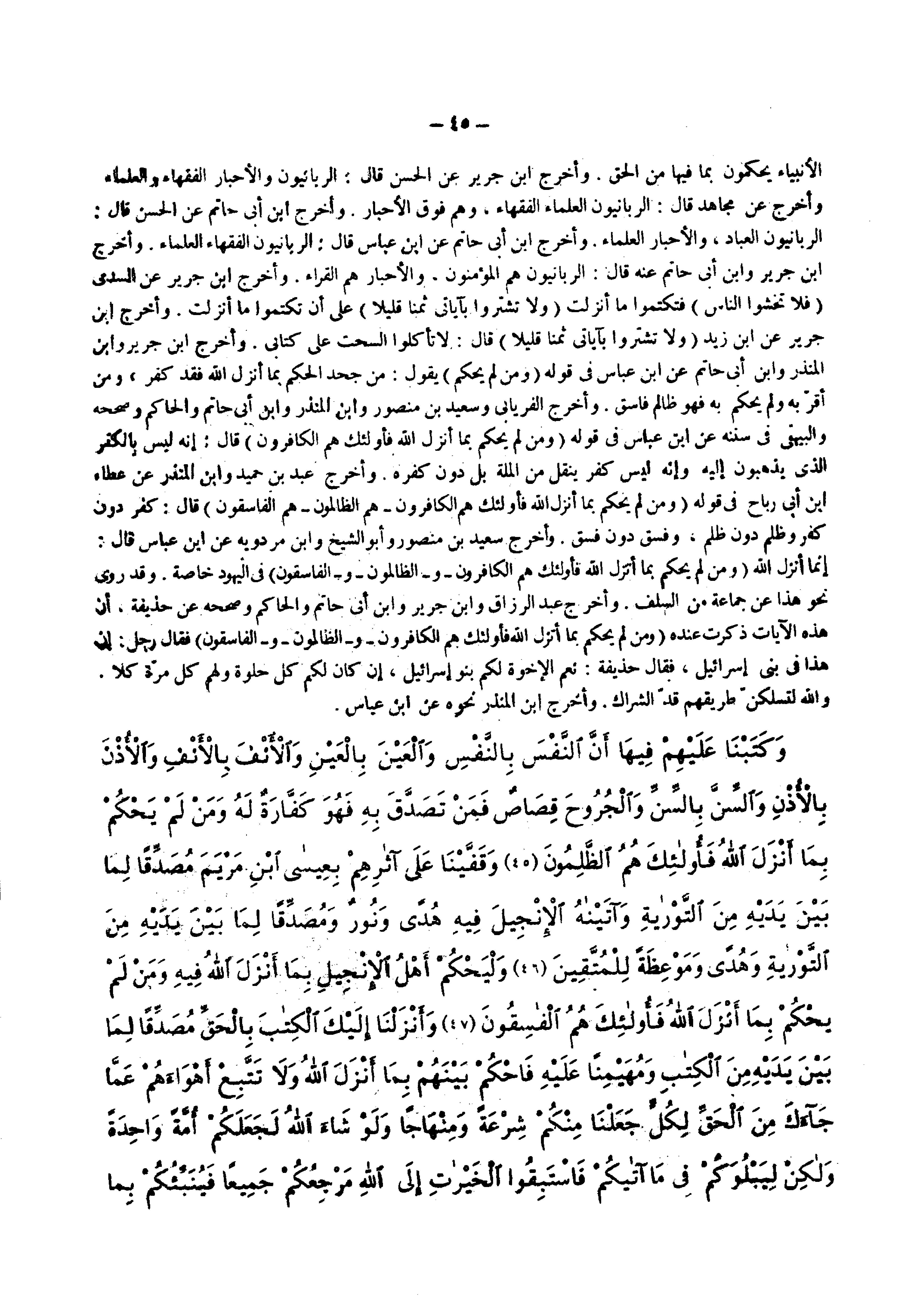 الأنبياء يحكمون بما فيها من الحق وأخرج ابن جرير عن الحسن قال الربانيون والأحبار الفقهاء والعلماء وأخرج عن مجاهد قال الربانيون العلماء والفقهاء وهم فوق الأحبار وأخرج ابن أبي حاتم عن الحسن قال الربانيون العباد والأحبار العلماء وأخرج ابن أبي حاتم عن ابن عباس قال الربانيون الفقهاء والعلماء وأخرج ابن جرير وابن أبي حاتم عنه قال الربانيون هم المؤمنون والأحبار هم القراء وأخرج ابن جرير عن السدى ) فلا تخشوا الناس ( فتكتموا ما أنزلت ) ولا تشتروا بآياتي ثمنا قليلا ( على أن تكتموا ما أنزلت وأخرج ابن جرير عن ابن زيد ) ولا تشتروا بآياتي ثمنا قليلا ( قال لا تأكلوا السحت على كتابي وأخرج ابن جرير وابن المنذر وابن أبي حاتم عن ابن عباس فى قوله ) ومن لم يحكم ( يقول من جحد الحكم بما أنزل الله فقد كفر ومن أقر به ولم يحكم به فهو ظالم فاسق وأخرج الفريابي وسعيد بن منصور وابن المنذر وابن أبي حاتم والحاكم وصححه والبيهقي فى سننه عن ابن عباس فى قوله ) ومن لم يحكم بما أنزل الله فأولئك هم الكافرون ( قال إنه ليس بالكفر الذي يذهبون إليه وإنه ليس كفر ينقل من الملة بل دون كفره وأخرج عبد بن حميد وابن المنذر عن عطاء ابن أبي رباح في قوله ) ومن لم يحكم بما أنزل الله فأولئك هم الكافرون ( هم الظالمون ) هدى ونور يحكم بها النبيون الذين أسلموا للذين هادوا والربانيون والأحبار بما استحفظوا ( هم الفاسقون قال كفر دون كفر وظلم دون ظلم وفسق دون فسق وأخرج سعيد بن منصور وأبو الشيخ وابن مردويه عن ابن عباس قال إنما أنزل الله ) ومن لم يحكم بما أنزل الله فأولئك هم الكافرون ( و الظالمون ) الفاسقون ( فى اليهود خاصة وقد روى نحو هذا عن جماعة من السلف وأخرج عبد الرزاق وابن جرير وابن أبي حاتم والحاكم وصححه عن حذيفة أن هذه الآيات ذكرت عنده ) ومن لم يحكم بما أنزل الله فأولئك هم الظالمون ( والظالمون و الفاسقون فقال رجل إن هذا فى بنى إسرائيل فقال حذيفة نعم الإخوة لكم بنو إسرائيل إن كان لكم كل حلوة ولهم كل مرة كلا والله لتسلكن طريقهم قد الشراك وأخرج ابن المنذر نحوه عن ابن عباس
