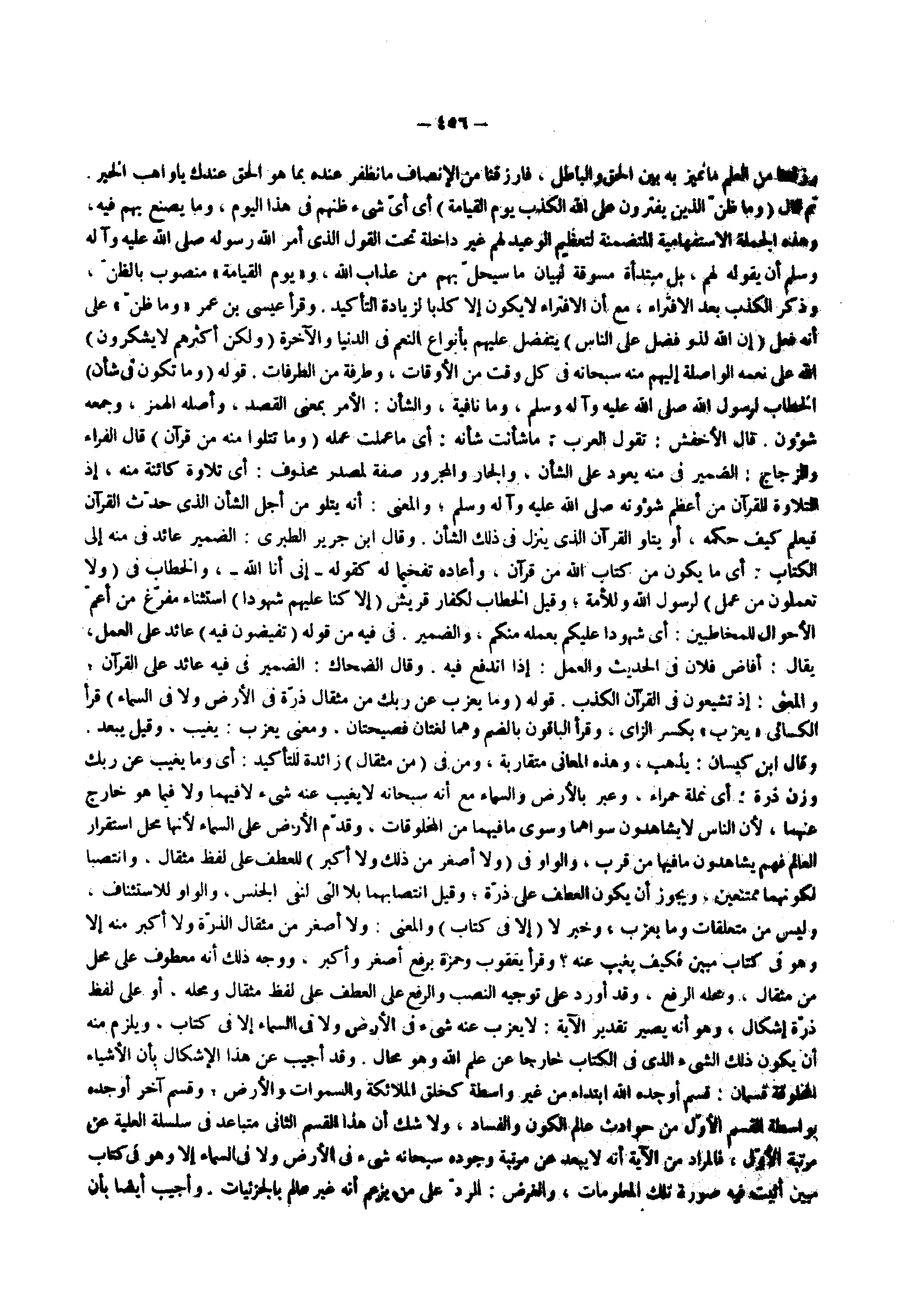 وقال ابن كيسان يذهب وهذه المعاني متقاربة ومن في ) من مثقال ( زائدة للتأكيد أي وما يغيب عن ربك وزن ذرة أي نملة حمراء وعبر بالأرض والسماء مع أنه سبحانه لا يغيب عنه شيء لا فيهما ولا فيما هو خارج عنهما لأن الناس لا يشاهدون سواهما وسوى ما فيهما من المخلوقات وقدم الأرض على السماء لأنها محل استقرار العالم فهم يشاهدون ما فيها من قرب والواو في ) ولا أصغر من ذلك ولا أكبر ( للعطف على لفظ مثقال وانتصبا لكونهما ممتنعين ويجوز أن يكون العطف على ذرة وقيل انتصابهما بلا التى لنفي الجنس والواو للاستئناف وليس من متعلقات وما يعزب وخبر لا ) إلا في كتاب ( والمعنى ولا أصغر من مثقال الذرة ولا أكبر منه إلا وهو في كتاب مبين فكيف يغيب عنه وقرأ يعقوب وحمزة برفع أصغر وأكبر ووجه ذلك أنه معطوف على محل من مثقال ومحله الرفع وقد أورد على توجيه النصب والرفع على العطف على لفظ مثقال ومحله أو على لفظ ذرة إشكال وهو أنه يصير تقدير الآية لا يعزب عنه شيء في الأرض ولا في السماء إلا في كتاب ويلزم منه أن يكون ذلك الشيء الذى في الكتاب خارجا عن علم الله وهو محال وقد أجيب عن هذا الإشكال بأن الأشياء المخلوقة قسمان قسم أوجده الله ابتداء من غير واسطة كخلق الملائكة والسموات والأرض وقسم آخر أوجده بواسطة القسم الأول من حوادث عالم الكون والفساد ولا شك أن هذا القسم الثاني متباعد في سلسلة العلية عن مرتبة الأول فالمراد من الآية أنه لا يبعد عن مرتبة وجوده سبحانه شيء في الأرض ولا في السماء إلا وهو في كتاب مبين أثبت فيه صورة تلك المعلومات والغرض الرد على من يزعم أنه غير عالم بالجزئيات وأجيب أيضا بأن