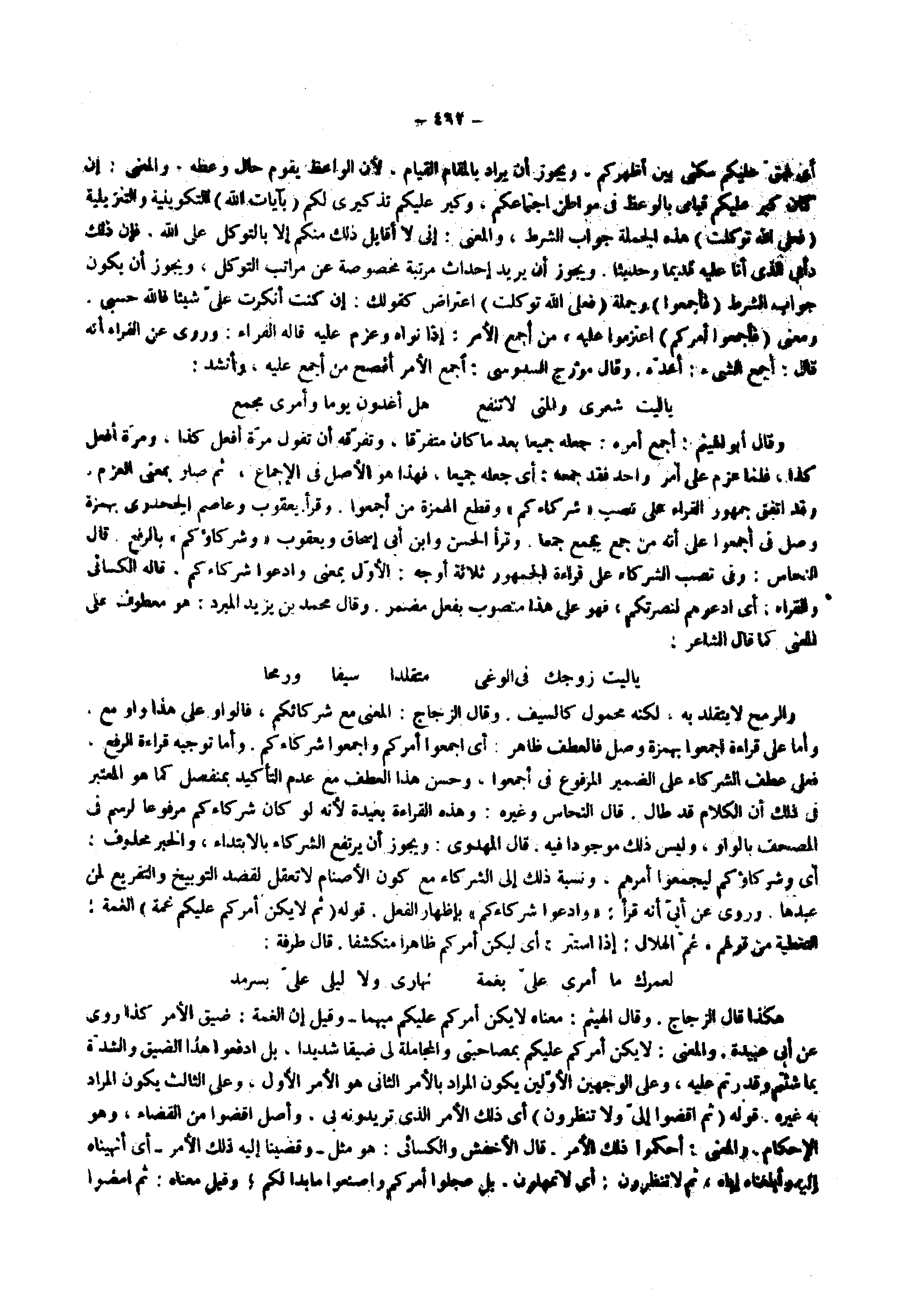 وقد اتفق جمهور القراء على نصب ) شركاءكم ( وقطع الهمزة من أجمعوا وقرأ يعقوب وعاصم الجحدري بهمزة وصل في أجمعوا على أنه من جمع يجمع جمعا وقرأ الحسن وابن أبي إسحاق ويعقوب ) وشركاؤكم ( بالرفع قال النحاس وفي نصب الشركاء على قراءة الجمهور ثلاثة أوجه الأول بمعنى وادعوا شركاءكم قاله الكسائي والفراء أي ادعوهم لنصرتكم فهو على هذا منصوب بفعل مضمر وقال محمد بن يزيد المبرد هو معطوف على المعنى كما قال الشاعر يا ليت زوجك في الوغى