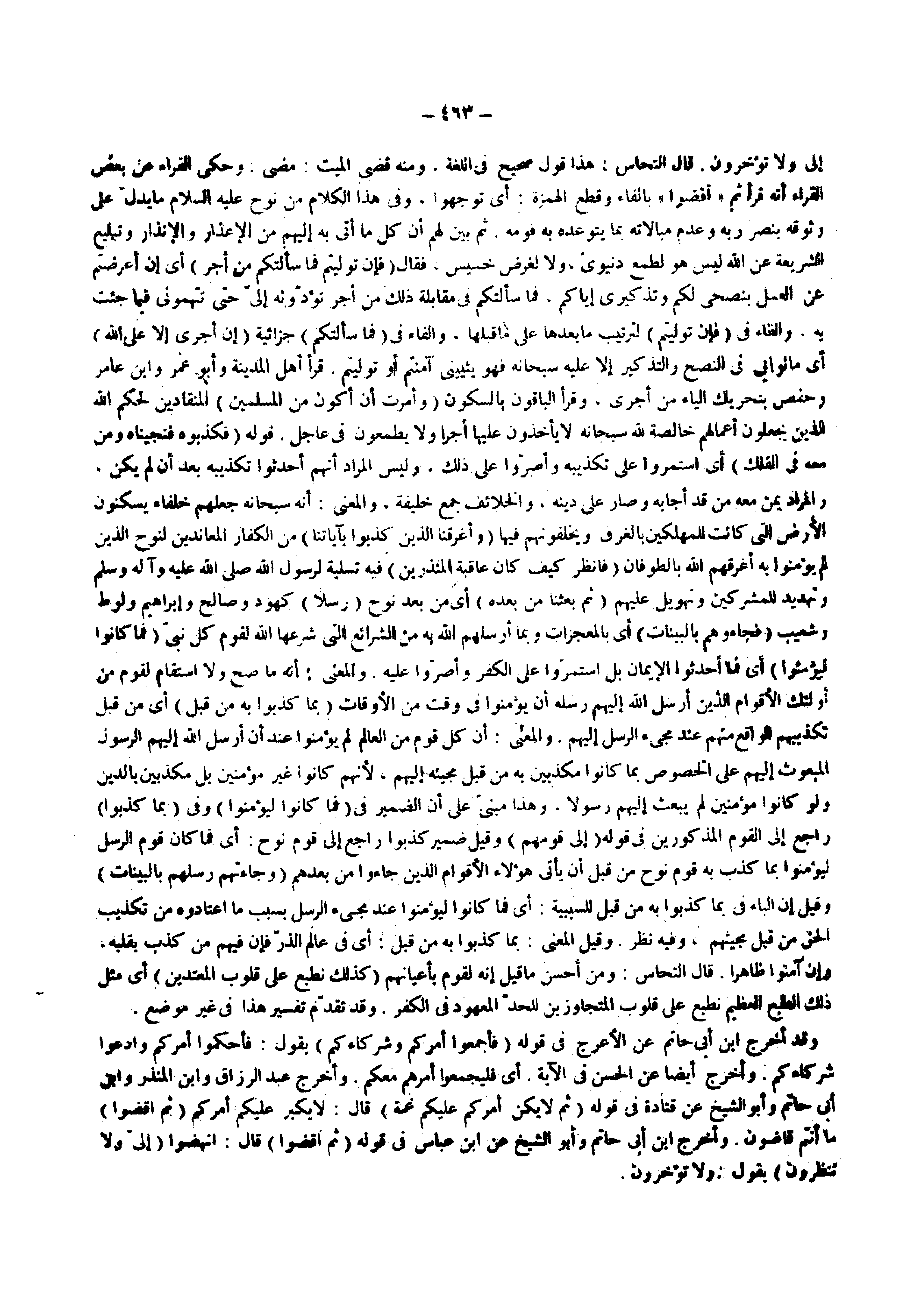 إلي ولا تؤخرون قال النحاس هذا قول صحيح في اللغة ومنه قضى الميت مضى وحكى الفراء عن بعض القراء أنه قرأ ثم ? أفضوا ? بالفاء وقطع الهمزة أي توجهوا وفي هذا الكلام من نوح عليه السلام ما يدل على وثوقه بنصر ربه وعدم مبالاته بما يتوعده به قومه