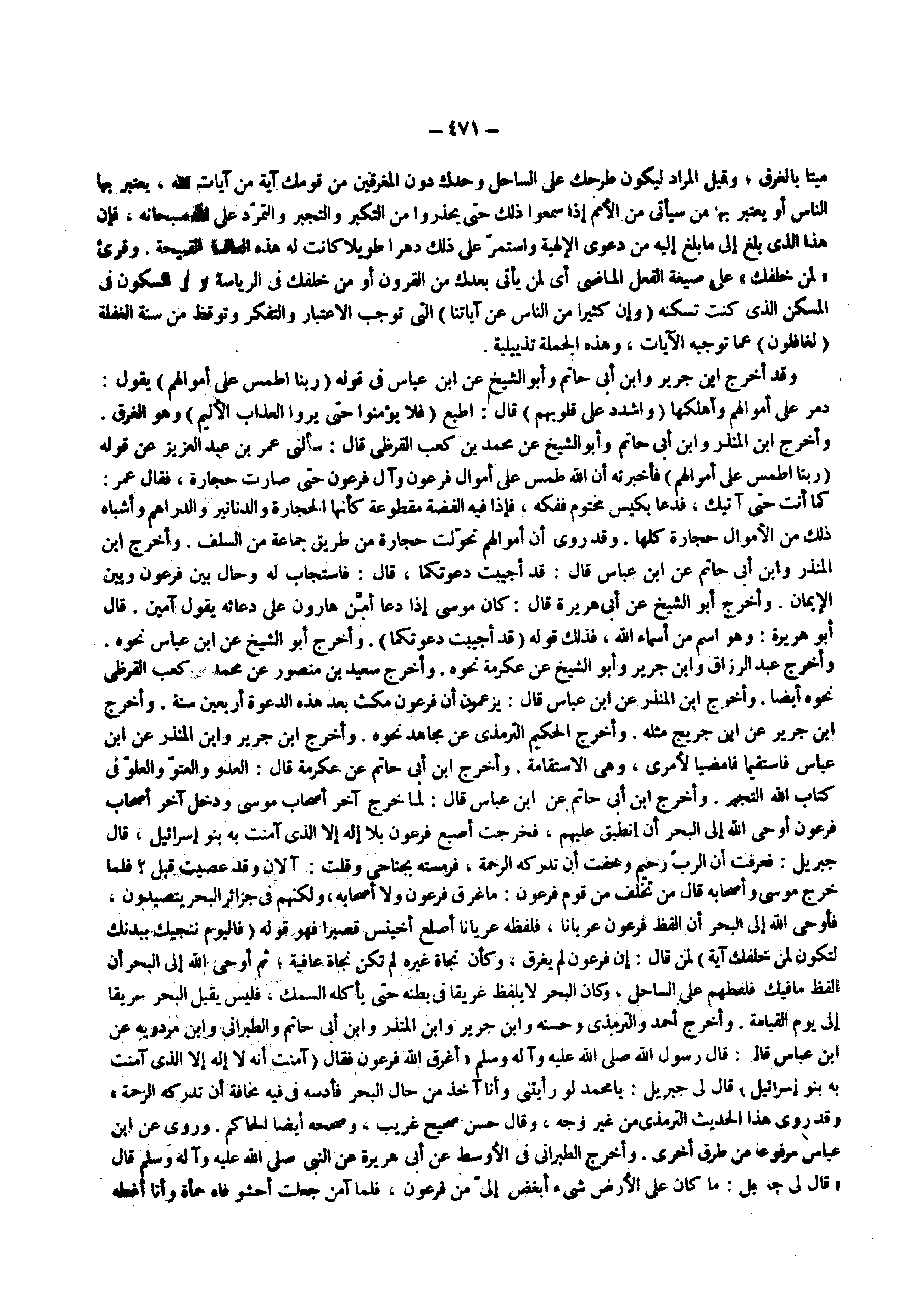 وقد أخرج ابن جرير وابن أبي حاتم وأبو الشيخ عن ابن عباس في قوله ربنا اطمس على أموالهم يقول دمر على أموالهم وأهلكها واشدد على قلوبهم قال اطبع فلا يؤمنوا حتى يروا العذاب الأليم وهو الغرق وأخرج ابن المنذر وابن أبي حاتم وأبو الشيخ عن محمد بن كعب القرظي قال سألني عمر بن عبد العزيز عن قوله ربنا اطمس على أموالهم فأخبرته أن الله طمس على أموال فرعون وآل فرعون حتى صارت حجارة فقال عمر كما أنت حتى آتيك فدعا بكيس مختوم ففكه فإذا فيه الفضة مقطوعة كأنها الحجارة والدنانير والدراهم وأشباه ذلك من الأموال حجارة كلها وقد روى أن أموالهم تحولت حجارة من طريق جماعة من السلف وأخرج ابن المنذر وابن أبي حاتم عن ابن عباس قال قد أجيبت دعوتكما قال فاستجاب له وحال بين فرعون وبين الإيمان وأخرج أبو الشيخ عن أبي هريرة قال كان موسى إذا دعا أمن هارون على دعائه يقول آمين قال أبو هريرة وهو اسم من أسماء الله فذلك قوله قد أجيبت دعوتكما وأخرج أبو الشيخ عن ابن عباس نحوه وأخرج عبد الرزاق وابن جرير وأبو الشيخ عن عكرمة نحوه وأخرج سعيد بن منصور عن محمد بن كعب القرضي نحوه أيضا وأخرج ابن المنذر عن ابن عباس قال يزعمون أن فرعون مكث بعد هذه الدعوة أربعين سنة وأخرج ابن جرير عن ابن جريج مثله وأخرج الحكيم الترمذي عن مجاهد نحوه وأخرج ابن جرير وابن المنذر عن ابن عباس فاستقيما فامضيا لأمري وهي الاستقامة وأخرج ابن أبي حاتم عن عكرمة قال العدو والعتو والعلو في كتاب الله التجبر وأخرج ابن أبي حاتم عن ابن عباس قال لما خرج آخر أصحاب موسى ودخل آخر أصحاب فرعون أوحى الله إلى البحر أن انطبق عليهم فخرجت أصبع فرعون بلا إله إلا الذي آمنت به بنو اسرائيل قال جبريل فعرفت أن الرب رحيم وخفت أن تدركه الرحمع فرمسته بجناحي وقلت آلان وقد عصيت قبل فلما خرج موسى وأصحابه قال من تخلف من قوم فرعون ما غرق فرعون ولا أصحابه ولكنهم في جزائر البحر يتصيدون فأوحى الله إلى البحر أن الفظ فرعون عريانا فلفظه عريانا أصلع أخينس قصيرا فهو قوله فاليوم ننجيك ببدنك لتكون لمن خلفك آية لمن قال إن فرعون لم يغرق وكأن نجاة غيره لم تكن نجاة عافية ثم أوحى الله إلى البحر أن الفظ ما فيك فلفظهم على الساحل وكان البحر لا يلفظ غريقا في بطنه حتى يأكله السمك فليس يقبل البحر غريقا إلى يوم القيامة وأخرج أحمد والترمذي وحسنه وابن جرير وابن المنذر وابن أبي حاتم والطبراني وابن مردويه عن ابن عباس قال قال رسول الله ( صلى الله عليه وسلم ) أغرق الله فرعون فقال آمنت أنه لا إله إلا الذي آمنت بنو اسرائيل قال لي جبريل يا محمد لو رأيتنى وأنا آخذ من حال البحر فأدسه في فيه مخافة أن تدركه الرحمة وقد روى هذا الحديث الترمذي من غير وجه وقال حسن صحيح غريب وصححه أيضا الحاكم وروى عن ابن عباس مرفوعا من طرق أخرى وأخرج الطبراني في الأوسط عن أبي هريرة عن النبي ( صلى الله عليه وسلم ) قال قال لي جبريل ما كان على الأرض شيء أبغض إلي من فرعون فلما آمن جعلت أحشو فاه حمأة وأنا أغطه