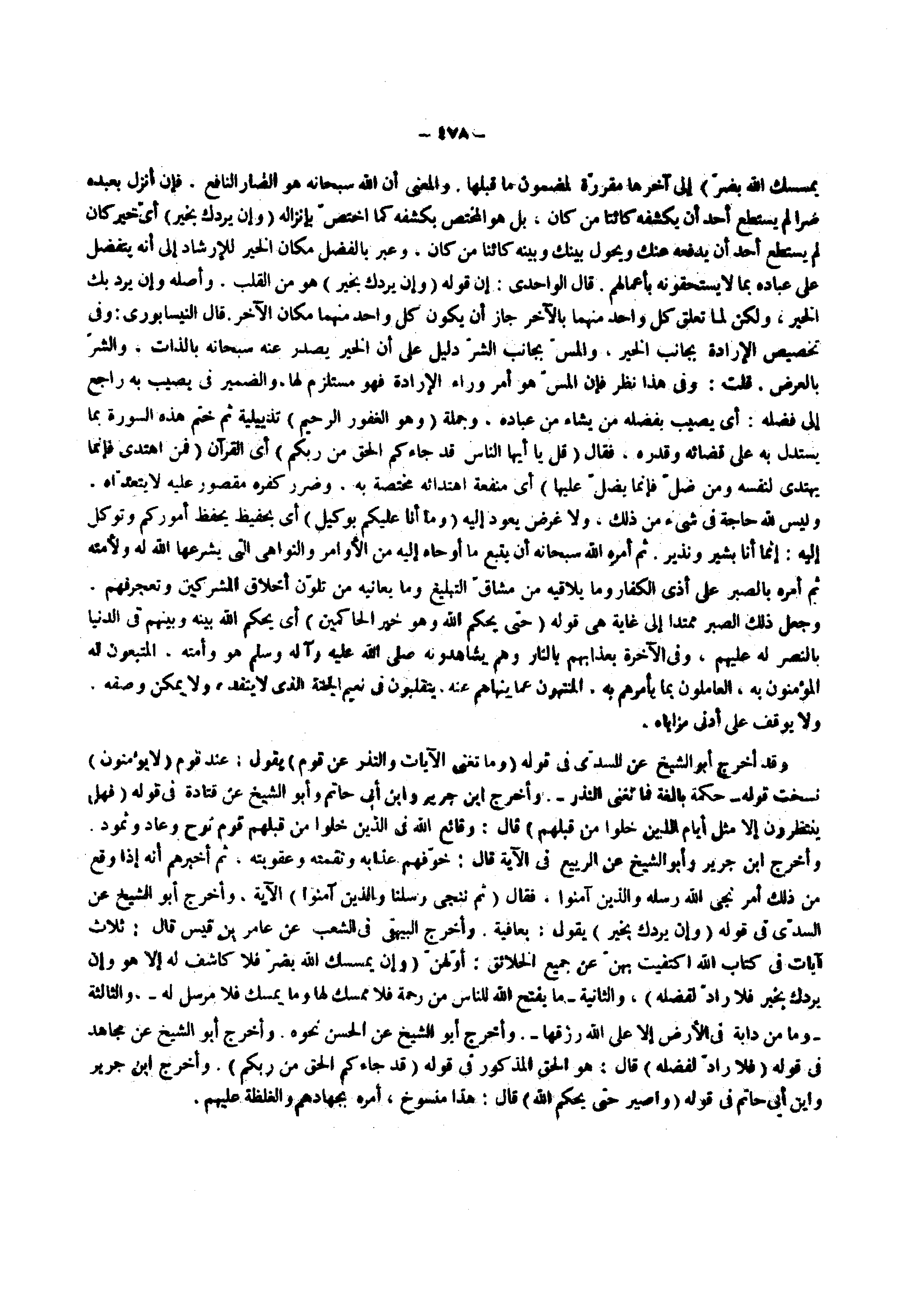 وأخرج ابن جرير وأبو الشيخ عن الربيع في الآية قال خوفهم عذابه ونقمته وعقوبته ثم أخبرهم أنه إذا وقع من ذلك أمر نجى الله رسله والذين آمنوا فقال ) ثم ننجي رسلنا والذين آمنوا ( الآية وأخرج أبو الشيخ عن السدي في قوله ) وإن يردك بخير ( يقول بعافية وأخرج البيهقي في الشعب عن عامر بن قيس قال ثلاث آيات في كتاب الله اكتفيت بهن عن جميع الخلائق أولهن ) وإن يمسسك الله بضر فلا كاشف له إلا هو وإن يردك بخير فلا راد لفضله ( والثانية ) ما يفتح الله للناس من رحمة فلا ممسك لها وما يمسك فلا مرسل له ( والثالثة ) وما من دابة في الأرض إلا على الله رزقها ( وأخرج أبو الشيخ عن الحسن نحوه وأخرج أبو الشيخ عن مجاهد في قوله ) فلا راد لفضله ( قال هو الحق المذكور في قوله ) قد جاءكم الحق من ربكم ( وأخرج ابن جرير وابن أبي حاتم في قوله ) واصبر حتى يحكم الله ( قال هذا منسوخ أمره بجهادهم والغلظة عليهم