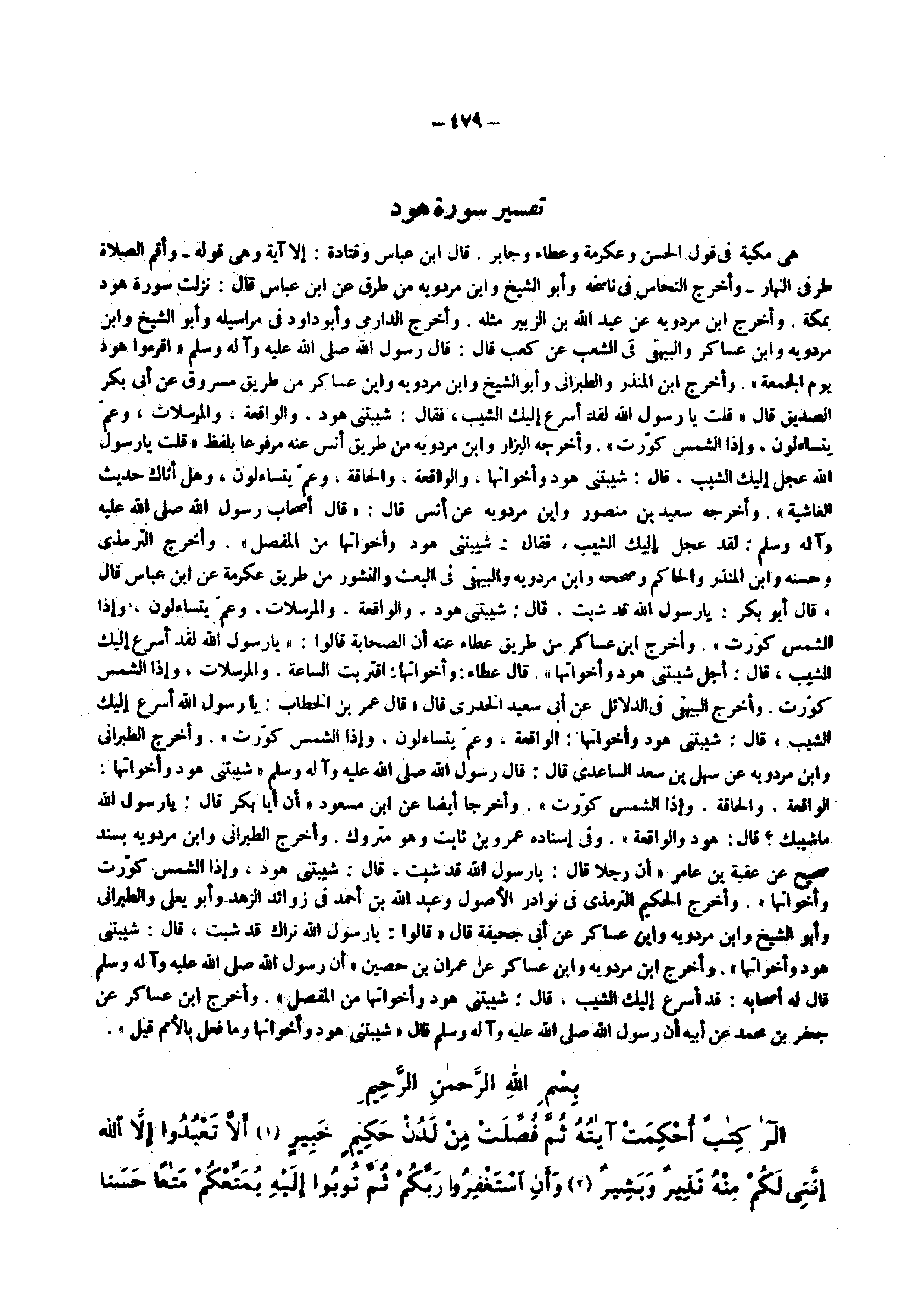 هى مكية في قول الحسن وعكرمة وعطاء وجابر قال ابن عباس وقتادة إلا آية وهى قوله ) وأقم الصلاة طرفي النهار ( وأخرج النحاس في ناسخه وأبو الشيخ وابن مردويه من طرق عن ابن عباس قال نزلت سورة هود بمكة وأخرج ابن مردويه عن عبد الله بن الزبير مثله وأخرج الدارمي وأبو داود في مراسيله وأبو الشيخ وابن مردويه وابن عساكر والبيهقي في الشعب عن كعب قال قال رسول الله ( صلى الله عليه وسلم ) اقرءوا هود يوم الجمعة وأخرج ابن المنذر والطبراني وأبو الشيخ وابن مردويه وابن عساكر من طريق مسروق عن أبي بكر الصديق قال قلت يا رسول الله لقد أسرع إليك الشيب فقال شيبتني هود والواقعة والمرسلات وعم يتساءلون وإذا الشمس كورت وأخرج البزار وابن مردويه من طريق أنس عنه مرفوعا بلفظ قلت يا رسول الله عجل إليك الشيب قال شيبتني هود وأخواتها والواقعة والحاقة وعم يتساءلون وهل أتاك حديث الغاشية وأخرجه سعيد بن منصور وابن مردويه عن أنس قال قال أصحاب رسول الله ( صلى الله عليه وسلم ) لقد عجل إليك الشيب فقال شيبتني هود وأخواتها من المفصل وأخرج الترمذي وحسنه وابن المنذر والحاكم وصححه وابن مردويه والبيهقي في البعث والنشور من طريق عكرمة عن ابن عباس قال قال أبو بكر يا رسول الله قد شبت قال شيبتني هود والواقعة والمرسلات وعم يتساءلون وإذا الشمس كورت وأخرج ابن عساكر من طريق عطاء عنه أن الصحابة قالوا يا رسول الله لقد أسرع إليك الشيب قال أجل شيبتني هود وأخواتها قال عطاء أخواتها اقتربت الساعة والمرسلات وإذا الشمس كروت وأخرج البيهقي في الدلائل عن أبي سعيد الخدري قال قال عمر بن الخطاب يا رسول الله أسرع إليك الشيب قال شيبتني هود وأخواتها الواقعة وعم يتساءلون وإذا الشمس كورت وأخرج الطبراني وابن مردويه عن سهل بن سعد الساعدي قال قال رسول الله ( صلى الله عليه وسلم ) شيبتني هود وأخواتها الواقعة والحاقة وإذا الشمس كورت وأخرجا أيضا عن ابن مسعود أن أبا بكر قال يا رسول الله ما شيبك قال هود والواقعة وفي إسناده عمرو بن ثابت وهو متروك وأخرج الطبراني وابن مردويه بسند صحيح عن عقبة بن عامر أن رجلا قال يا رسول الله قد شبت قال شيبتني هود وإذا الشمس كورت وأخواتها وأخرج الحكيم الترمذي في نوادر الأصول وعبد الله بن أحمد في زوائد الزهد وأبو يعلي والطبراني وأبو الشيخ وابن مردويه وابن عساكر عن أبي جحيفة قال قالوا يا رسول الله نراك قد شبت قال شيبتي هود وأخواتها وأخرج ابن مردويه وابن عساكر عن عمران بن حصين أن رسول الله ( صلى الله عليه وسلم ) قال له أصحابه قد أسرع إليك الشيب قال شيبتني هود وأخواتها من المفصل وأخرج ابن عساكر عن جعفر بن محمد عن أبيه أن رسول الله ( صلى الله عليه وسلم ) قال شيبتني هود وأخواتها وما فعل بالأمم قبل
