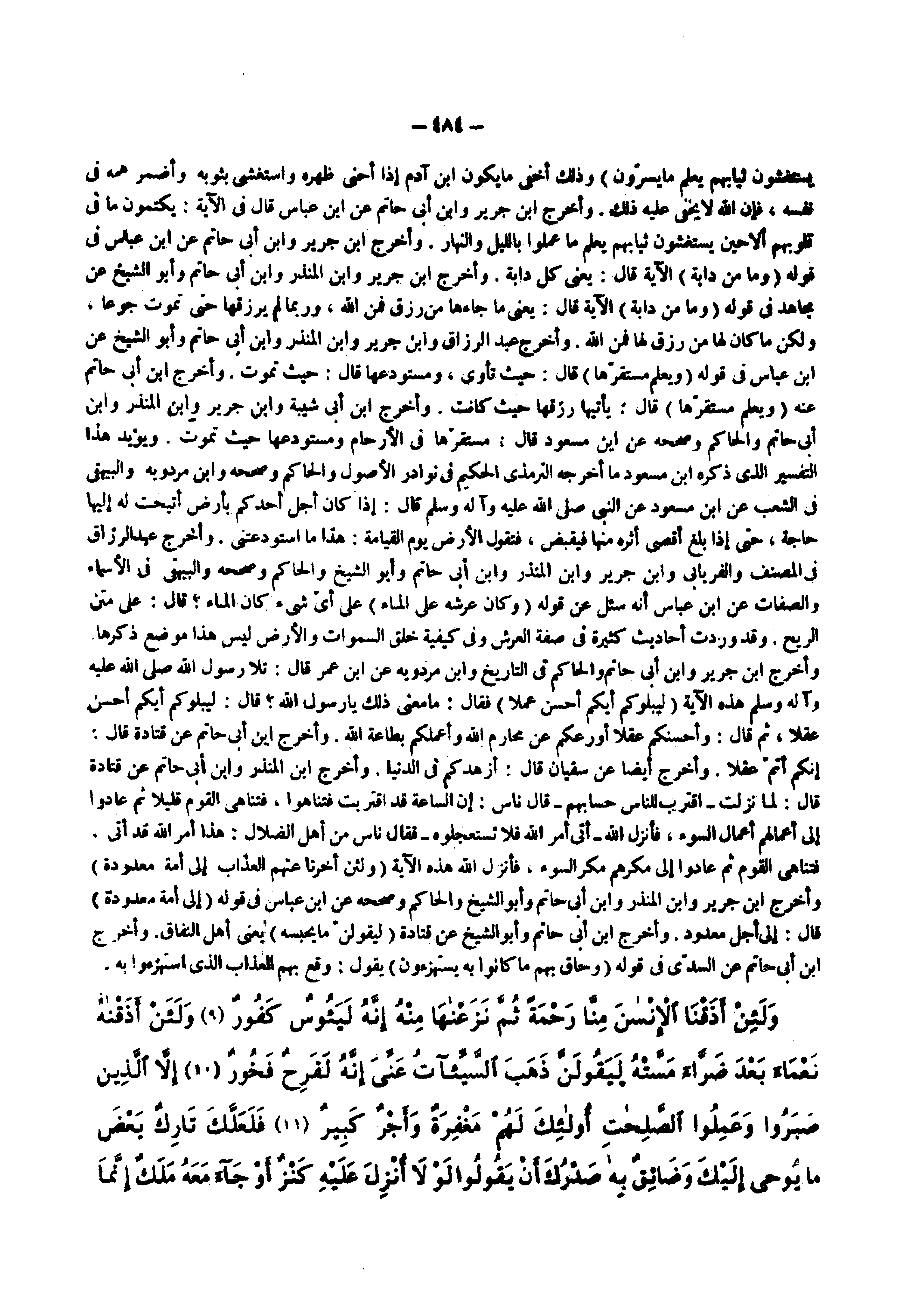وذلك أخفى ما يكون ابن آدم إذا أحنى ظهره واستغشى بثوبه وأضمر همه في نفسه فإن الله لا يخفى عليه ذلك وأخرج ابن جرير وابن أبي حاتم عن ابن عباس قال في الآية يكتمون ما في قلوبهم ألا حين يستغشون ثيابهم يعلم ما عملوا بالليل والنهار وأخرج ابن جرير وابن أبي حاتم عن ابن عباس في قوله ) وما من دابة ( الآية قال يعني كل دابة وأخرج ابن جرير وابن المنذر وابن أبي حاتم وأبو الشيخ عن مجاهد في قوله ) وما من دابة ( الآية قال يعني ما جاءها من رزق فمن الله وربما لم يرزقها حتى تموت جوعا ولكن ما كان لها من رزق لها فمن الله وأخرج عبد الرزاق وابن جرير وابن المنذر وابن أبي حاتم وأبو الشيخ عن ابن عباس في قوله ) ويعلم مستقرها ( قال حيث تأوي ومستودعها قال حيث تموت وأخرج ابن أبي حاتم عنه ) ويعلم مستقرها ( قال يأتيها رزقها حيث كانت وأخرج ابن أبي شيبة وابن جرير وابن المنذر وابن أبي حاتم والحاكم وصححه عن ابن مسعود قال مستقرها في الأرحام ومستودعها حيث تموت ويؤيد هذا التفسير الذى ذكره ابن مسعود ما أخرجه الترمذي الحكيم في نوادر الأصول والحاكم وصححه وابن مردويه والبيهقي في الشعب عن ابن مسعود عن النبي ( صلى الله عليه وسلم ) قال إذا كان أجل أحدكم بأرض أتيحت له إليها حاجة حتى إذا بلغ أقصى أثره منها فيقبض فتقول الأرض يوم القيامة هذا ما استودعتني وأخرج عبد الرزاق في المصنف والفريابي وابن جرير وابن المنذر وابن أبي حاتم وأبو الشيخ والحاكم وصححه والبيهقي في الأسماء والصفات عن ابن عباس أنه سئل عن قوله ) وكان عرشه على الماء ( على أي شيء كان الماء قال على متن الريح وقد وردت أحاديث كثيرة في صفة العرش وفي كيفية خلق السموات والأرض ليس هذا موضع ذكرها وأخرج ابن جرير وابن أبي حاتم والحاكم في التاريخ وابن مردويه عن ابن عمر قال تلا رسول الله ( صلى الله عليه وسلم ) هذه الآية ) ليبلوكم أيكم أحسن عملا ( فقال ما معنى ذلك يا رسول الله قال ليبلوكم أيكم أحسن عقلا ثم قال وأحسنكم عقلا أورعكم عن محارم الله وأعملكم بطاعة الله وأخرج ابن أبي حاتم عن قتادة قال إنكم أتم عقلا وأخرج أيضا عن سفيان قال أزهدكم في الدنيا وأخرج ابن المنذر وابن أبي حاتم عن قتادة قال لما نزلت ) اقترب للناس حسابهم ( قال ناس إن الساعة قد اقتربت فتناهوا فتناهى القوم قليلا ثم عادوا إلى أعمالهم أعمال السوء فأنزل الله ) أتى أمر الله فلا تستعجلوه ( فقال ناس من أهل الضلال هذا أمر الله قد أتى فتناهى القوم ثم عادوا إلى مكرهم مكر السوء فأنزل الله هذه الآية ) ولئن أخرنا عنهم العذاب إلى أمة معدودة ( وأخرج ابن جرير وابن المنذر وابن أبي حاتم وأبو الشيخ والحاكم وصححه عن ابن عباس في قوله ) إلى أمة معدودة ( قال إلى أجل معدود وأخرج ابن أبي حاتم وأبو الشيخ عن قتادة ) ليقولن ما يحبسه ( يعني أهل النفاق وأخرج ابن أبي حاتم عن السدي في قوله ) وحاق بهم ما كانوا به يستهزؤون ( يقول وقع بهم العذاب الذى استهزءوا به