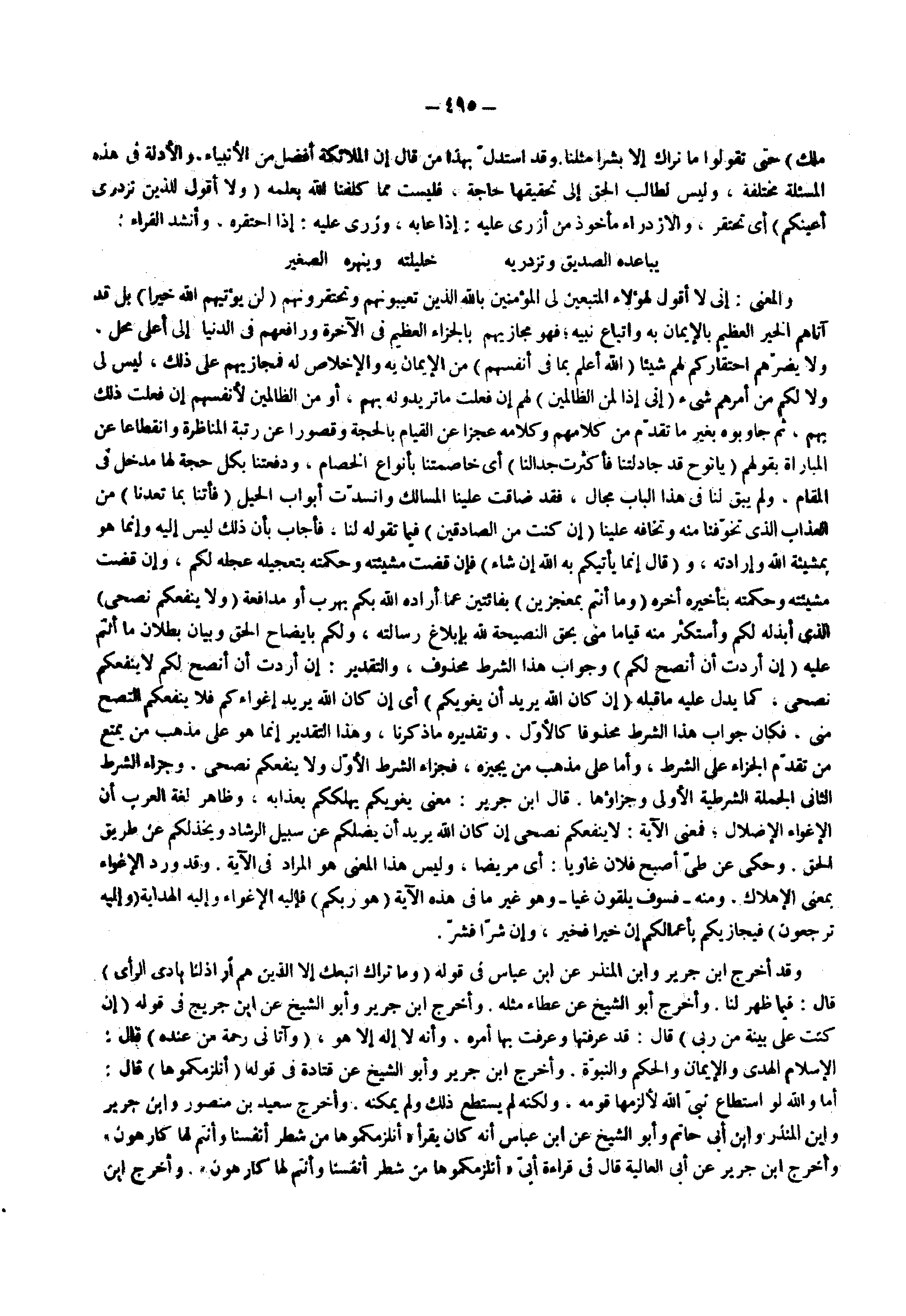 ) ولا ينفعكم نصحي ( الذى أبذله لكم وأستكثر منه قياما مني بحق النصيحة لله بإبلاغ رسالته ولكم بإيضاح الحق وبيان بطلان ما أنتم عليه ) إن أردت أن أنصح لكم ( وجواب هذا الشرط مخذوف والتقدير إن أردت أن أنصح لكم لا ينفعكم نصحي كما يدل عليه ما قبله ) إن كان الله يريد أن يغويكم ( أي إن كان الله يريد إغواءكم فلا ينفعكم النصح مني فكان جواب هذا الشرط محذوفا كالأول وتقديره ما ذكرنا وهذا التقدير إنما هو على مذهب من يمنع من تقدم الجزاء على الشرط وأما على مذهب من يجيزه فجزاء الشرط الأول ولا ينفعكم نصحي وجزاء الشرط الثاني الجملة الشرطية الأولى وجزاؤها قال ابن جرير معنى يغويكم يهلككم بعذابه وظاهر لغة العرب أن الإغواء الإضلال فمعنى الآية لا ينفعكم نصحي إن كان الله يريد أن يضلكم عن سبيل الرشاد ويخذلكم عن طريق الحق وحكى عن طي أصبح فلان غاويا أو مريضا وليس هذا المعنى هو المراد في الآية وقد ورد الإغواء بمعنى الإهلاك ومنه ) فسوف يلقون غيا ( وهو غير ما في هذه الآية ) هو ربكم ( فإليه الإغواء وإليه الهداية ) وإليه ترجعون ( فيجازيكم بأعمالكم إن خيرا فخير وإن شرا فشر