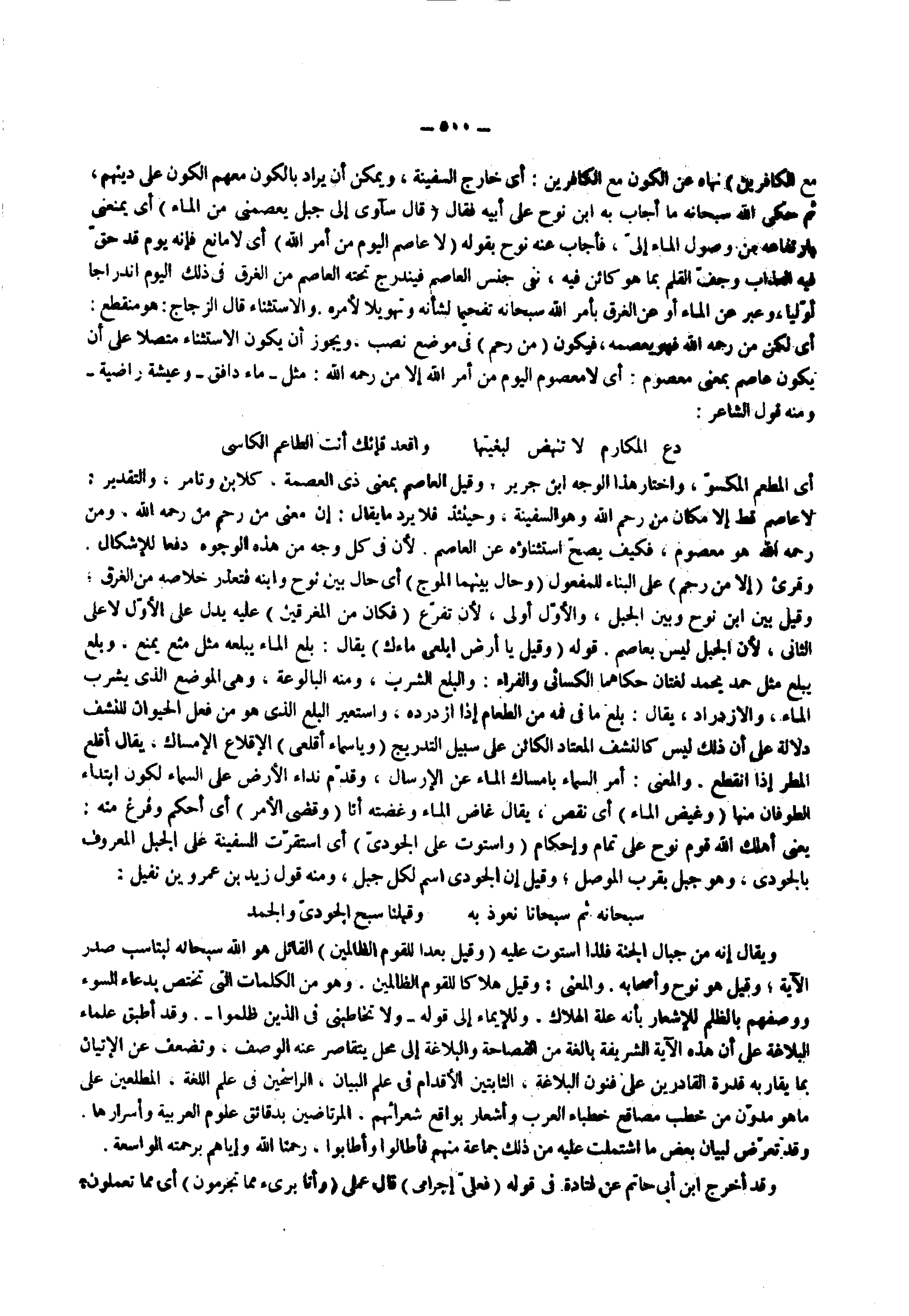 قوله ) وقيل يا أرض ابلعي ماءك ( يقال بلع الماء يبلعه مثل منع يمنع وبلع يبلع مثل حمد يحمد لغتان حكاهما الكسائي والفراء والبلع الشرب ومنه البالوعة وهى الموضع الذى يشرب الماء والازدراد يقال بلع ما في فمه من الطعام إذا ازدرده واستعير البلع الذى هو من فعل الحيوان للنشف دلالة على أن ذلك ليس كالنشف المعتاد الكائن على سبيل التدريج ) ويا سماء أقلعي ( الإقلاع الإمساك يقال أقلع المطر إذا انقطع والمعنى أمر السماء بإمساك الماء عن الإرسال وقدم نداء الأرض على السماء لكون ابتداء الطوفان منها ) وغيض الماء ( أي نقص يقال غاض الماء وغضته أنا ) وقضي الأمر ( أي أحكم وفرغ منه يعني أهلك الله قوم نوح على تمام وإحكام ) واستوت على الجودي ( أي استقرت السفينة على الجبل المعروف بالجودي وهو جبل بقرب الموصل وقيل إن الجودي اسم لكل جبل ومنه قول زيد بن عمرو بن نفيل سبحانه ثم سبحانا نعوذ به