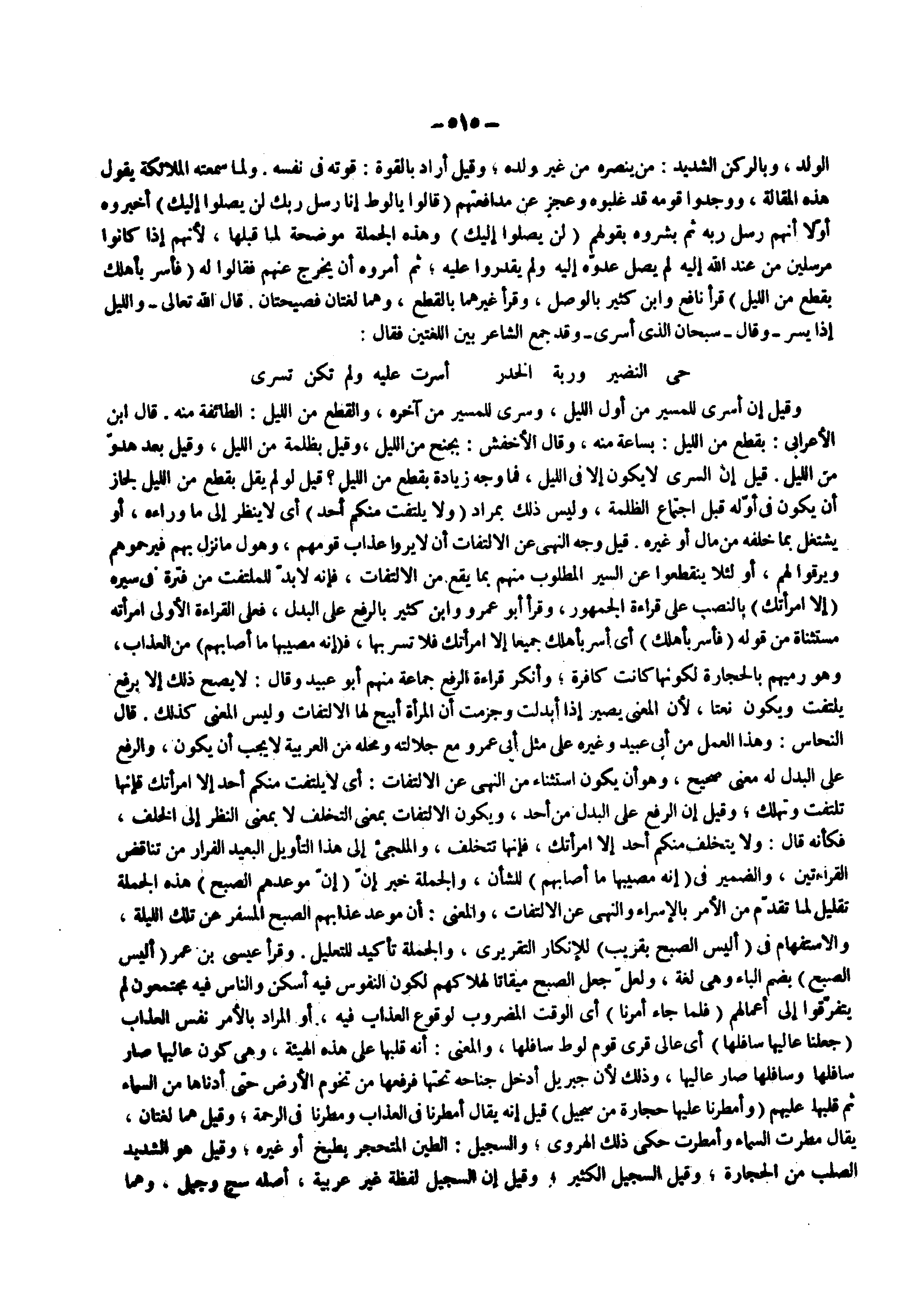 وقيل إن أسرى للمسير من أول الليل وسرى للمسير من آخره والقطع من الليل الطائفة منه قال ابن الأعرابي بقطع من الليل بساعة منه وقال الأخفش بجنح من الليل وقيل بظلمة من الليل وقيل بعد هدو من الليل قيل إن السرى لا يكون إلا في الليل فما وجه زيادة بقطع من الليل قيل لو لم يقل بقطع من الليل لجاز أن يكون في أوله قبل اجتماع الظلمة وليس ذلك بمراد ) ولا يلتفت منكم أحد ( أي لا ينظر إلى ما وراءه أو يشتغل بما خلفه من مال أو غيره قيل وجه النهي عن الالتفات أن لا يروا عذاب قومهم وهول ما نزل بهم فيرحموهم ويرقوا لهم أو لئلا ينقطعوا عن السير المطلوب منهم بما يقع من الالتفات فإنه لا بد للملتفت من فترة في سيره ) إلا امرأتك ( بالنصب على قراءة الجمهور وقرأ أبو عمرو ابن كثير بالرفع على البدل فعلى القراءة الأولى امرأته مستثناة من قوله ) فأسر بأهلك ( أي أسر بأهلك جميعا إلا امرأتك فلا تسر بها ف ) إنه مصيبها ما أصابهم ( من العذاب وهو رميهم بالحجارة لكونها كانت كافرة وأنكر قراءة الرفع جماعة منهم أبو عبيد وقال لا يصح ذلك إلا برفع يلتفت ويكون نعتا لأن المعنى يصير إذا أبدلت وجزمت أن المرأة أبيح لها الالتفات وليس المعنى كذلك قال النحاس وهذا العمل من أبي عبيد وغيره على مثل أبي عمرو مع جلالته ومحله من العربية لا يجب أن يكون والرفع على البدل له معنى صحيح وهو أن يكون استثناء من النهي عن الالتفات أي لا يلتفت منكم أحد إلا امرأتك فإنها تلتفت وتهلك وقيل إن الرفع على البدل من أحد ويكون الالتفات بمعنى التخلف لا بمعنى النظر إلى الخلف فكأنه قال ولا يتخلف منكم أحد إلا امرأتك فإنها تتخلف والملجئ إلى هذا التأويل البعيد الفرار من تناقض القراءتين والضمير في ) إنه مصيبها ما أصابهم ( للشأن والجملة خبر إن ) إن موعدهم الصبح ( هذه الجملة تقليل لما تقدم من الأمر بالإسراء والنهي عن الالتفات والمعنى أن موعد عذابهم الصبح المسفر عن تلك الليلة والاستفهام في ) أليس الصبح بقريب ( للإنكار التقريري والجملة تأكيد للتعليل وقرأ عيسى بن عمر ) أليس الصبح ( بضم الباء وهى لغة ولعل جعل الصبح ميقاتا لهلاكهم لكون النفوس فيه أسكن والناس فيه مجتمعون لم يتفرقوا إلى أعمالهم
