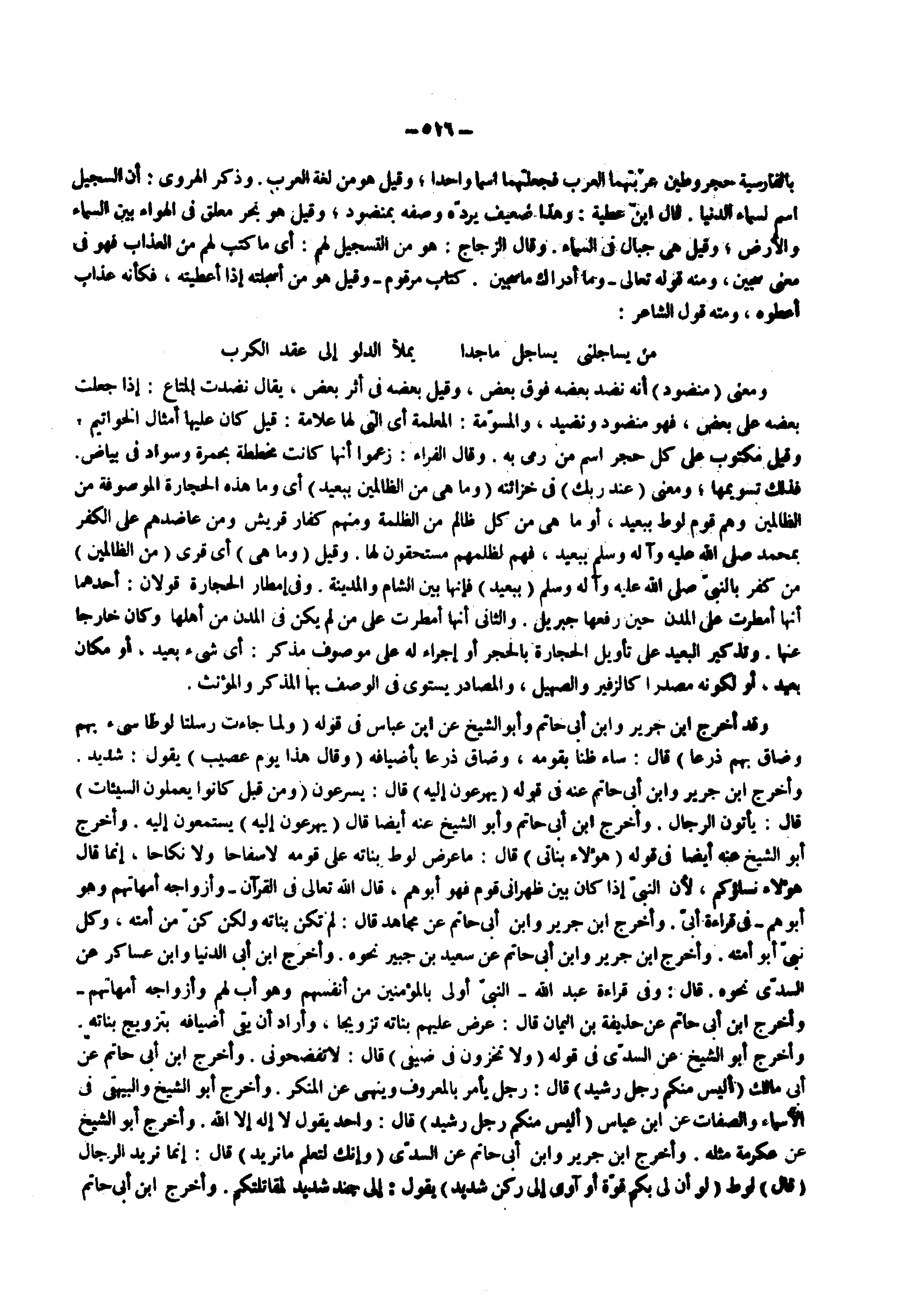بالفارسية حجر وطين عربتهما العرب فجعلتهما اسما واحدا وقيل هو من لغة العرب وذكر الهروي أن السجيل اسم لسماء الدنيا قال ابن عطية وهذا ضعيف يرده وصفه بمنضود وقيل هو بحر معلق في الهواء بين السماء والأرض وقيل هى جبال في السماء وقال الزجاج هو من التسجيل لهم أي ما كتب لهم من العذاب فهو في معني سجين ومنه قوله تعالى ) وما أدراك ما سجين كتاب مرقوم ( وقيل هو من أسجلته إذا أعطيته فكأنه عذاب أعطوه ومنه قول الشاعر من يساجلني يساجل ماجدا