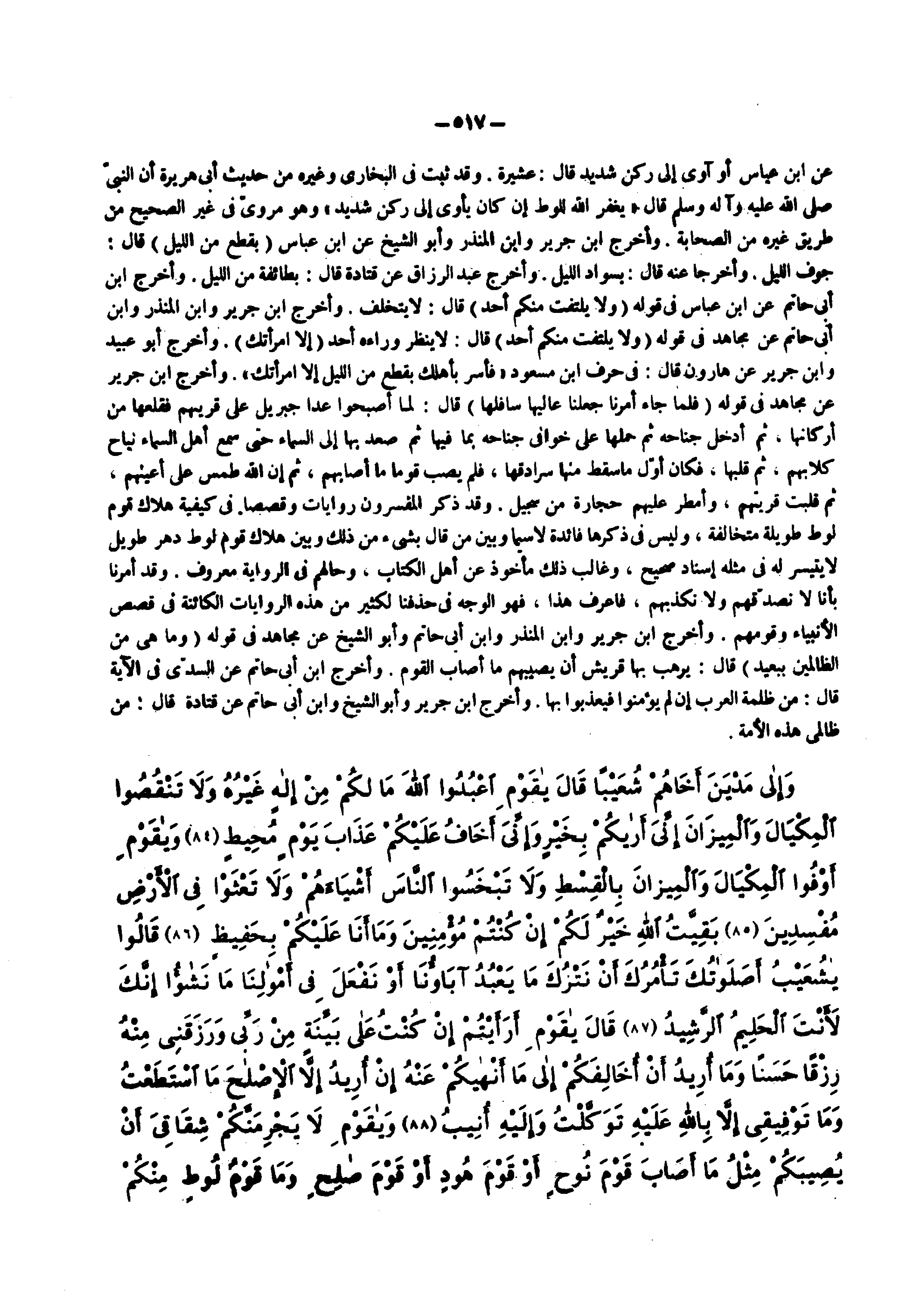 عن ابن عباس أو آوى إلى ركن شديد قال عشيرة وقد ثبت في البخاري وغيره من حديث أبي هريرة أن النبي ( صلى الله عليه وسلم ) قال يغفر الله للوط إن كان يأوي إلى ركن شديد وهو مروي في غير الصحيح من طريق غيره من الصحابة وأخرج ابن جرير وابن المنذر وأبو الشيخ عن ابن عباس ) بقطع من الليل ( قال جوف الليل وأخرجا عنه قال بسواد الليل وأخرج عبد الرزاق عن قتادة قال بطائفة من الليل وأخرج ابن أبي حاتم عن ابن عباس في قوله ) ولا يلتفت منكم أحد ( قال لا يتخلف وأخرج ابن جرير وابن المنذر وابن أبي حاتم عن مجاهد في قوله ) ولا يلتفت منكم أحد ( قال لا ينظر وراءه أحد ) إلا امرأتك ( وأخرج أبو عبيد وابن جرير عن هارون قال في حرف ابن مسعود فأسر بأهلك بقطع من الليل إلا امرأتك وأخرج ابن جرير عن مجاهد في قوله ) فلما جاء أمرنا جعلنا عاليها سافلها ( قال لما أصبحوا عدا جبريل على قريتهم فقلعها من أركانها ثم أدخل جناحه ثم حملها على خوافي جناحه بما فيها ثم صعد بها إلى السماء حتى سمع أهل السماء نباح كلابهم ثم قلبها فكان أول ما سقط منها سرادقها فلم يصب قوما ما أصابهم ثم إن الله طمس على أعينهم ثم قلبت قريتهم وأمطر عليهم حجارة من سجيل وقد ذكر المفسرون روايات وقصصا في كيفية هلاك قوم لوط طويلة متخالفة وليس في ذكرها فائدة لا سيما وبين من قال بشيء من ذلك وبين هلاك قوم لوط دهر طويل لا يتيسر له في مثله إسناد صحيح وغالب ذلك مأخوذ عن أهل الكتاب وحالهم في الرواية معروف وقد أمرنا بأنا لا نصدقهم ولا نكذبهم فاعرف هذا فهو الوجه في حذفنا لكثير من هذه الروايات الكائنة في قصص الأنبياء وقومهم وأخرج ابن جرير وابن المنذر وابن أبي حاتم وأبو الشيخ عن مجاهد في قوله ) وما هي من الظالمين ببعيد ( قال يرهب بها قريش أن يصيبهم ما أصاب القوم وأخرج ابن أبي حاتم عن السدي في الآية قال من ظلمة العرب إن لم يؤمنوا فيعذبوا بها وأخرج ابن جرير وأبو الشيخ وابن أبي حاتم عن قتادة قال من ظالمي هذه الأمة