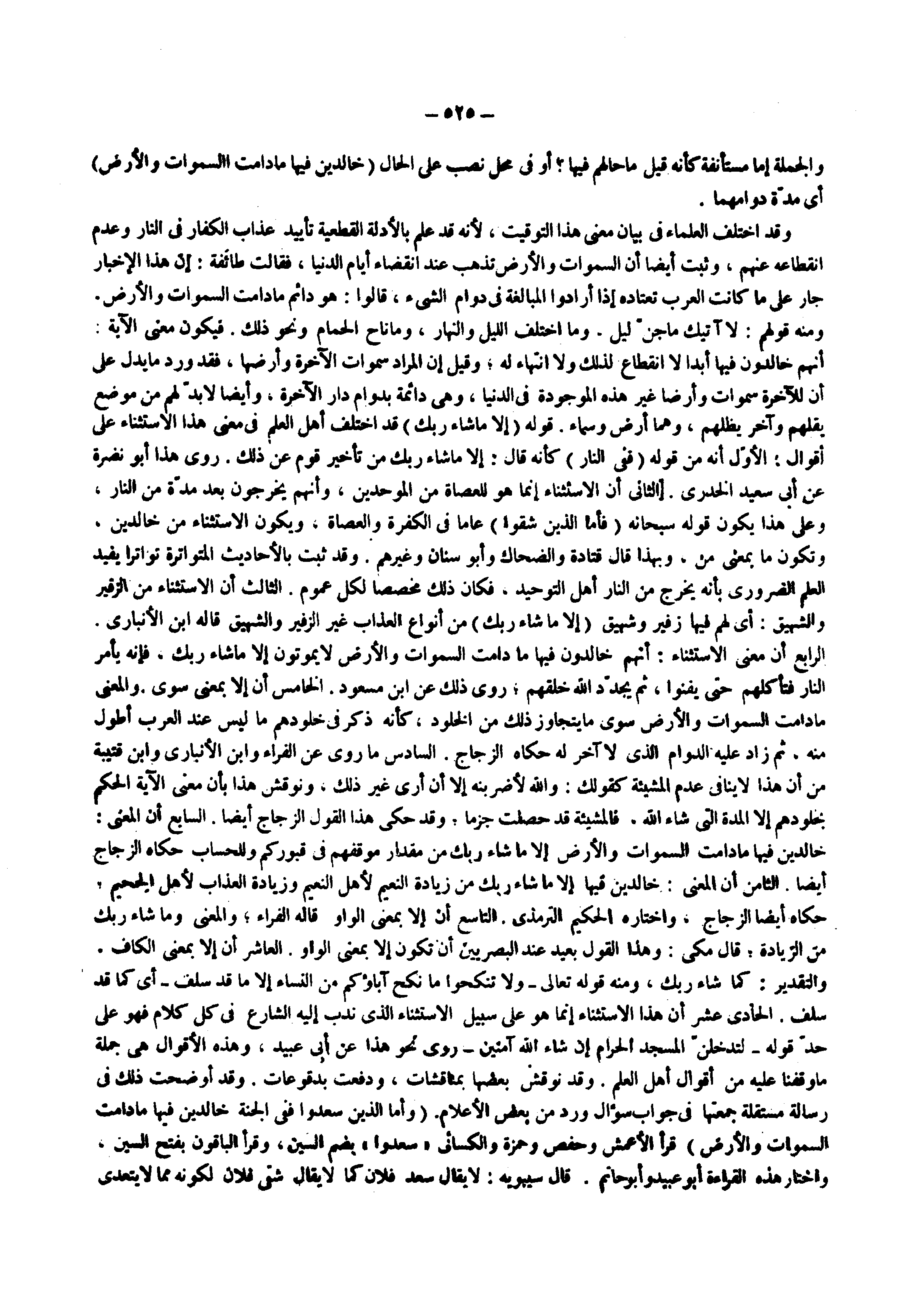 الرابع أن معنى الاستثناء أنهم خالدون فيها ما دامت السموات والأرض لا يموتون إلا ما شاء ربك فإنه يأمر النار فتأكلهم حتى يفنوا ثم يجدد الله خلقهم روى ذلك عن ابن مسعود الخامس أن إلا معنى سوى والمعنى ما دامت السموات والأرض سوى ما يتجاوز ذلك من الخلود كأنه ذكر في خلودهم ما ليس عند العرب أطول منه ثم زاد عليه الدوام الذى لا آخر له حكاه الزجاج السادس ما روى عن الفراء وابن الأنباري وابن قتيبة من أن هذا لا ينافي عدم المشيئة كقولك والله لأضربنه إلا أن أرى غير ذلك ونوقش هذا بأن معنى الآية الحكم بخلودهم إلا المدة التى شاء الله فالمشيئة قد حصلت جزما وقد حكى هذا القول الزجاج أيضا السابع أن المعنى خالدين فيها ما دامت السموات والأرض إلا ما شاء ربك من مقدار موقفهم في قبوركم وللحساب حكاه الزجاج أيضا والثامن أن المعنى خالدين فيها إلا ما شاء ربك من زيادة النعيم لأهل النعيم وزيادة العذاب لأهل الجحيم حكاه أيضا الزجاج واختاره الحكيم الترمذي التاسع أن إلا بمعنى الواو قاله الفراء والمعنى وما شاء ربك من الزيادة قال مكي وهذا القول بعيد عند البصريين أن تكون إلا بمعنى الواو العاشر أن إلا بمعنى الكاف