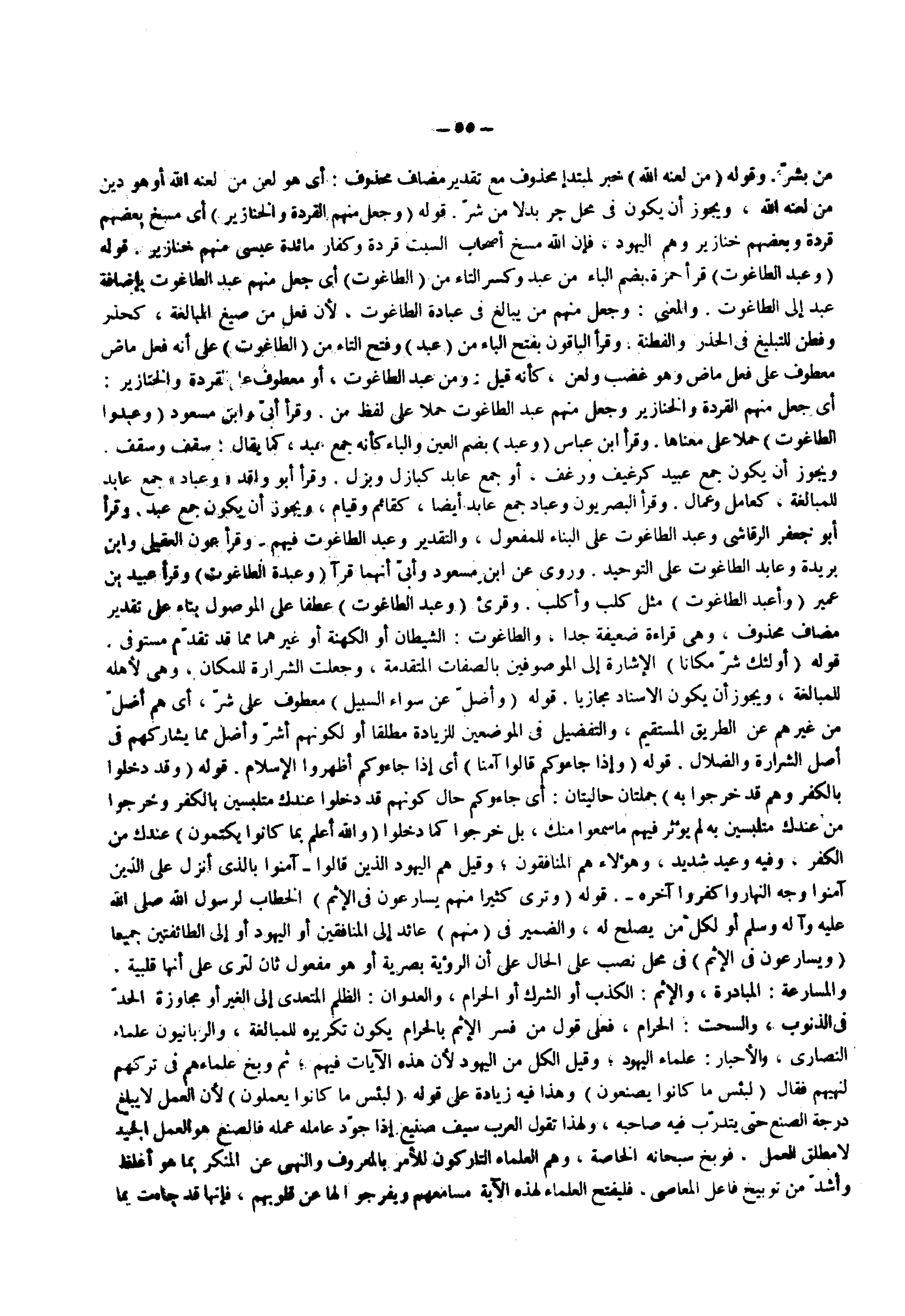 من بشر وقوله ) من لعنه الله ( خبر لمبتدإ محذوف مع تقدير مضاف محذوف أى هو لعن من لعنه الله أو هو دين من لعنه الله ويجوز أن يكون فى محل جر بدلا من شر قوله ) وجعل منهم القردة والخنازير ( أى مسخ بعضهم قردة وبعضهم خنازير وهم اليهود فإن الله مسخ أصحاب السبت قردة وكفار مائدة عيسى منهم خنازير قوله ) وعبد الطاغوت ( قرأ حمزة بضم الباء من عبد وكسر التاء من ) الطاغوت ( أى جعل منهم عبد الطاغوت بإضافة عبد إلى الطاغوت والمعنى وجعل منهم من يبالغ فى عبادة الطاغوت لأن فعل من صيغ المبالغة كحذر وفطن للتبليغ فى الحذر والفطنة وقرأ الباقون بفتح الباء من ) عبد ( وفتح التاء من ) الطاغوت ( على أنه فعل ماض معطوف على فعل ماض وهو غضب ولعن كأنه قيل ومن عبد الطاغوت أو معطوف على القردة والخنازير أي جعل منهم القردة والخنازير وجعل منهم عبد الطاغوت حملا على لفظ من وقرأ أبي وابن مسعود ? وعبدوا الطاغوت ? حملا على معناها وقرأ ابن عباس ) وعبد ( بضم العين والباء كأنه جمع عبد كما يقال سقف وسقف