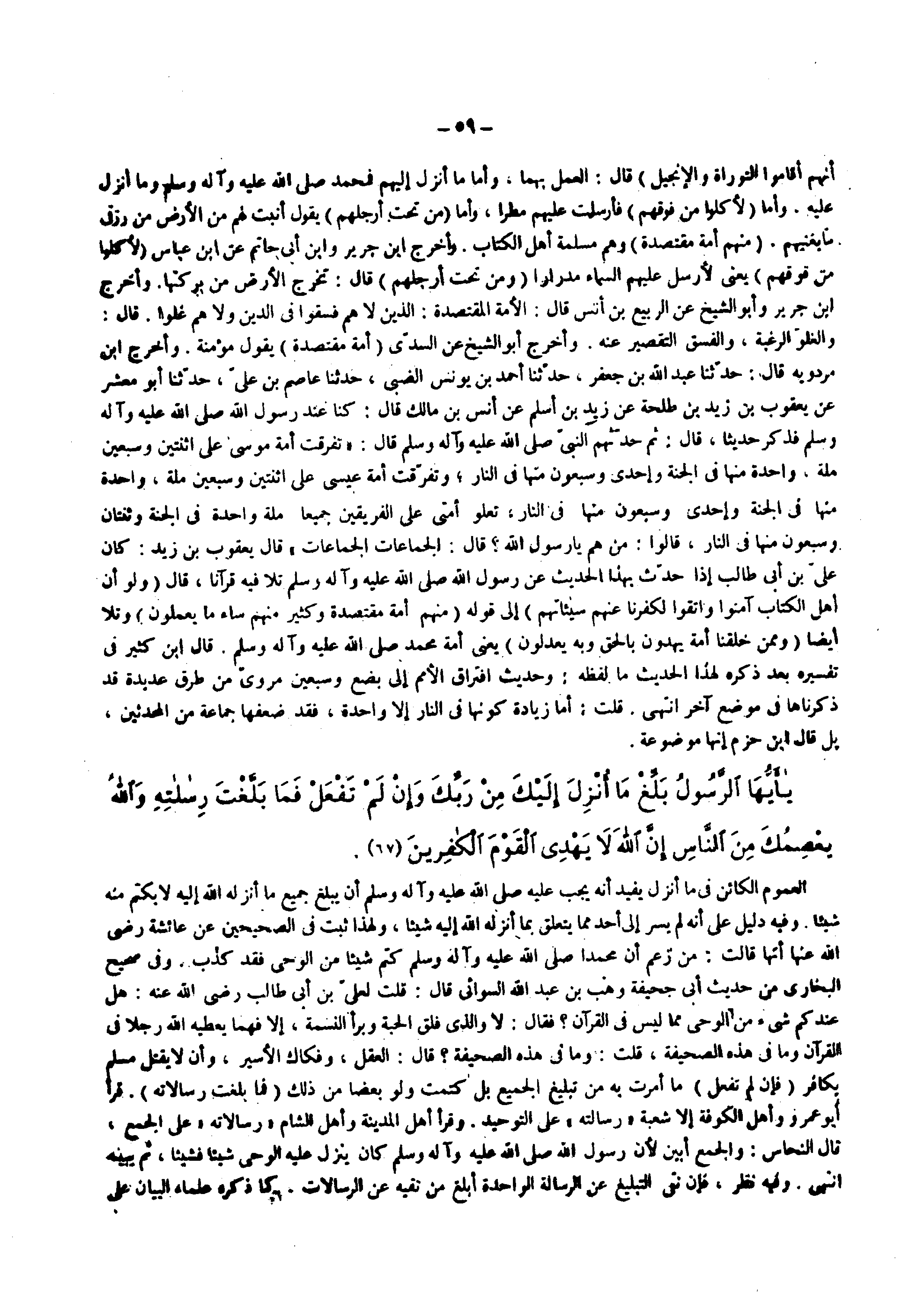 قال العمل بهما وأما ما أنزل إليهم فمحمد ( صلى الله عليه وسلم ) وما أنزل عليه وأما ) لأكلوا من فوقهم ( فأرسلت عليهم مطرا وأما ) ومن تحت أرجلهم ( يقول أنبت لهم من الأرض من رزقي ما يغنيهم ) منهم أمة مقتصدة ( وهم مسلمة وأهل الكتاب وأخرج ابن جرير وابن أبي حاتم عن ابن عباس ) لأكلوا من فوقهم ( يعنى لأرسل عليهم السماء مدرارا ) ومن تحت أرجلهم ( قال تخرج الأرض من بركتها وأخرج ابن جرير وأبو الشيخ عن الربيع بن أنس قال الأمة المقتصدة الذين لا هم فسقوا في الدين ولا هم غلوا قال والغلو الرغبة والفسق التقصير عنه وأخرج أبو الشيخ عن السدى ) أمة مقتصدة ( يقول مؤمنة وأخرج ابن مردويه قال حدثنا عبد الله بن جعفر حدثنا أحمد بن يونس الضبى حدثنا عاصم بن علي حدثنا أبو معشر عن يعقوب بن زيد بن طلحة عن زيد بن أسلم عن أنس بن مالك قال كنا عند رسول الله ( صلى الله عليه وسلم ) فذكر حديثا قال ثم حدثهم النبي ( صلى الله عليه وسلم ) قال تفرقت أمة موسى على اثنتين وسبعين ملة واحدة منها فى الجنة وإحدى وسبعون منها فى النار وتفرقت أمة عيسى على اثنتين وسبعين ملة واحدة منها في الجنة وإحدى وسبعون منها في النار تعلو أمتي على الفريقين جميعا ملة واحدة في الجنة وثنتان وسبعون في النار قالوا من هم يا رسول الله قال الجماعات الجماعات قال يعقوب بن زيد كان علي بن أبي طالب إذا حدث بهذا الحديث عن رسول الله ( صلى الله عليه وسلم ) تلا فيه قرآنا قال ) ولو أن أهل الكتاب آمنوا واتقوا لكفرنا عنهم سيئاتهم ( إلى قوله ) منهم أمة مقتصدة وكثير منهم ساء ما يعملون ( وتلا أيضا ) وممن خلقنا أمة يهدون بالحق وبه يعدلون ( يعنى أمة محمد ( صلى الله عليه وسلم ) قال ابن كثير فى تفسيره بعد ذكره لهذا الحديث ما لفظه وحديث افتراق الأمم إلى بضع وسبعين مروى من طرق عديدة قد ذكرناها فى موضع آخر انتهى قلت أما زيادة كونها فى النار إلا واحدة فقد ضعفها جماعة من المحدثين بل قال ابن حزم إنها موضوعة