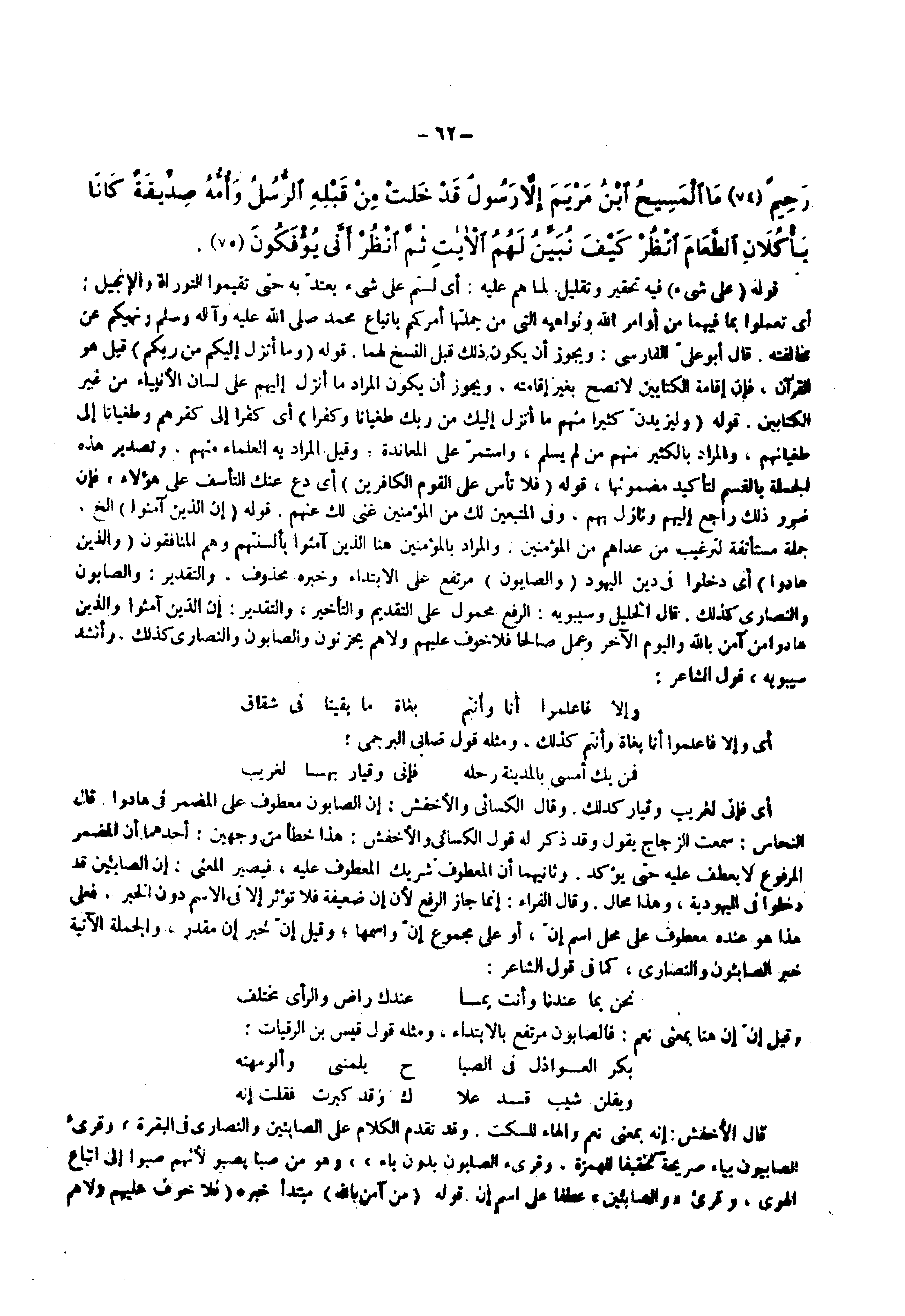 أي فإنى لغريب وقيار كذلك وقال الكسائي والأخفش إن الصابون معطوف على المضمر في هادوا قال النحاس سمعت الزجاج يقول وقد ذكر له قول الكسائي والأخفش هذا خطأ من وجهين أحدهما أن المضمر المرفوع لا يعطف عليه حتى يؤكد وثانيهما أن المعطوف شريك المعطوف عليه فيصير المعنى إن الصابئين قد دخلوا فى اليهودية وهذا محال وقال الفراء إنما جاز الرفع لأن إن ضعيفة فلا تؤثر إلا فى الاسم دون الخبر فعلى هذا هو عنده معطوف على محل اسم إن أو على مجموع إن واسمها وقيل إن خبر إن مقدر والجملة الآتية خبر الصابئون والنصارى كما فى قول الشاعر نحن بما عندنا وأنت بما