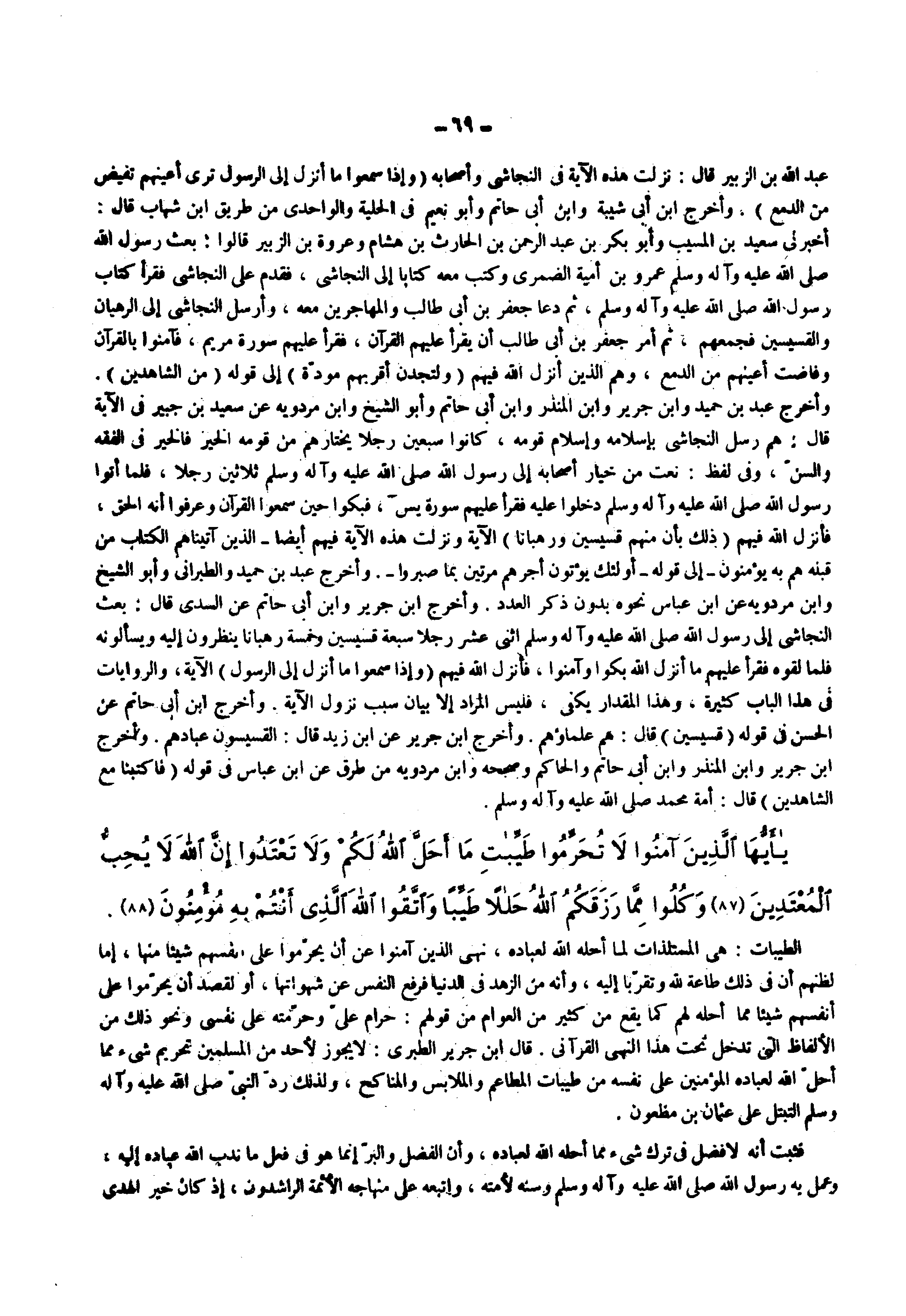 عبد الله بن الزبير قال نزلت هذه الآية في النجاشي وأصحابه ) وإذا سمعوا ما أنزل إلى الرسول ترى أعينهم تفيض من الدمع ( وأخرج ابن أبي شيبة وابن أبي حاتم وأبو نعيم في الحلية والواحدي من طريق ابن شهاب قال أخبرني سعيد بن المسيب وأبو بكر بن عبد الرحمن بن الحارث بن هشام وعروة بن الزبير قالوا بعث رسول الله ( صلى الله عليه وسلم ) عمرو بن أمية الضمري وكتب معه كتابا إلى النجاشي فقدم عل النجاشي فقرأ كتاب رسول الله ( صلى الله عليه وسلم ) ثم دعا جعفر بن أبي طالب والمهاجرين معه وأرسل النجاشي إلى الرهبان والقسيسين فجمعهم ثم أمر جعفر بن أبي طالب أن يقرأ عليهم القرآن فقرأ عليهم سورة مريم فآمنوا بالقرآن وفاضت أعينهم من الدمع وهم الذين أنزل الله فيهم ) ولتجدن أقربهم مودة ( إلى قوله ) من الشاهدين (