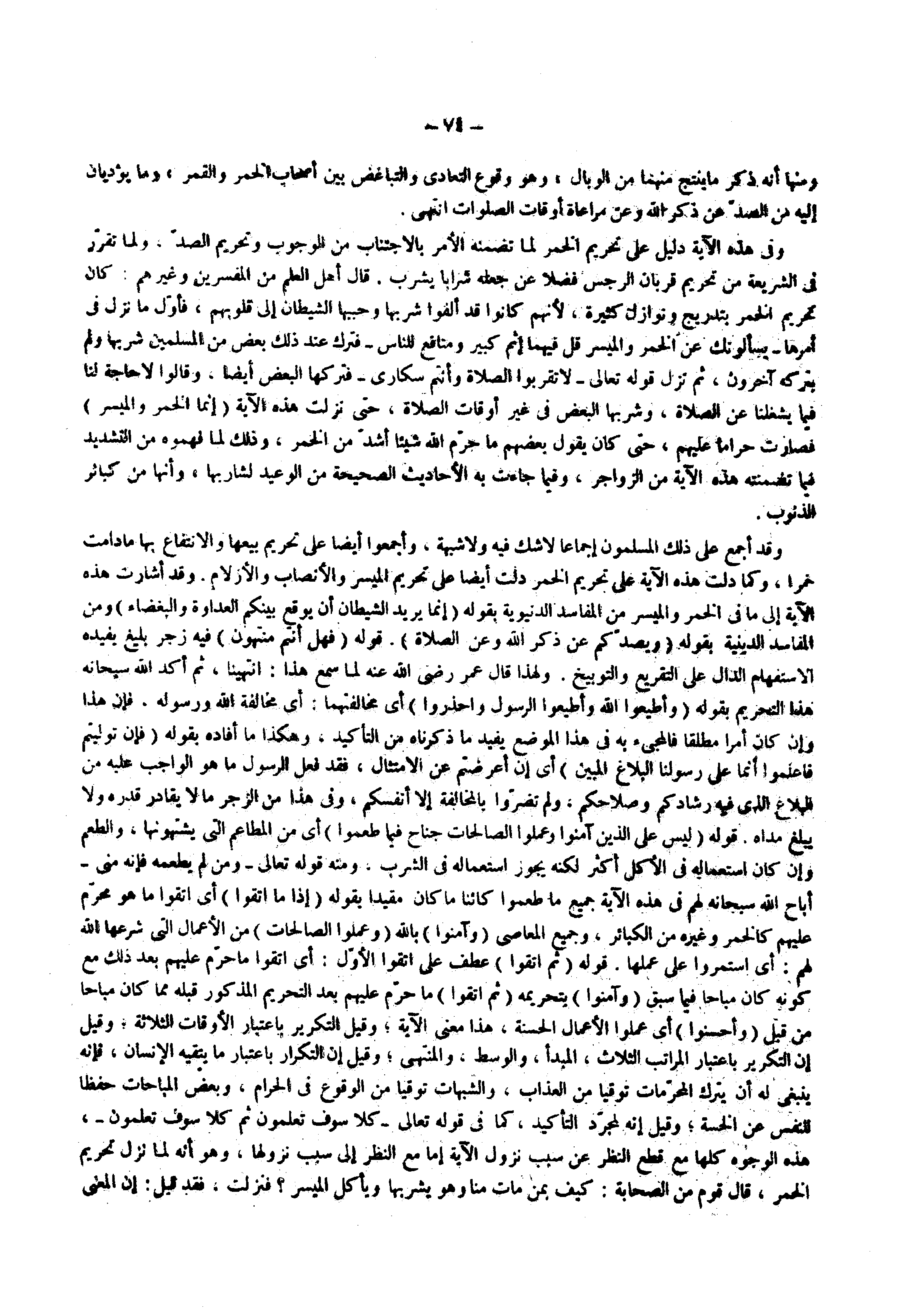 وفى هذه الآية دليل على تحريم الخمر لما تضمنه الأمر بالاجتناب من الوجوب وتحريم الصد ولما تقرر في الشريعة من تحريم قربان الرجس فضلا عن جعله شرابا يشرب قال أهل العلم من المفسرين وغيرهم كان تحريم الخمر بتدريج ونوازل كثيرة لأنهم كانوا قد ألفوا شربها وحببها الشيطان إلى قلوبهم فأول ما نزل في أمرها ) يسألونك عن الخمر والميسر قل فيهما إثم كبير ومنافع للناس ( فترك عند ذلك بعض من المسلمين شربها ولم يتركه آخرون ثم نزل قوله تعالى ) لا تقربوا الصلاة وأنتم سكارى ( فتركها البعض أيضا وقالوا لا حاجة لنا فيما يشغلنا عن الصلاة وشربها البعض في غير أوقات الصلاة حتى نزلت هذه الآية ) إنما الخمر والميسر ( فصارت حراما عليهم حتى كان يقول بعضهم ما حرم الله شيئا أشد من الخمر وذلك لما فهموه من التشديد فيما تضمنته هذه الآية من الزواجر وفيما جاءت به الأحاديث الصحيحة من الوعيد لشاربها وأنها من كبائر الذنوب