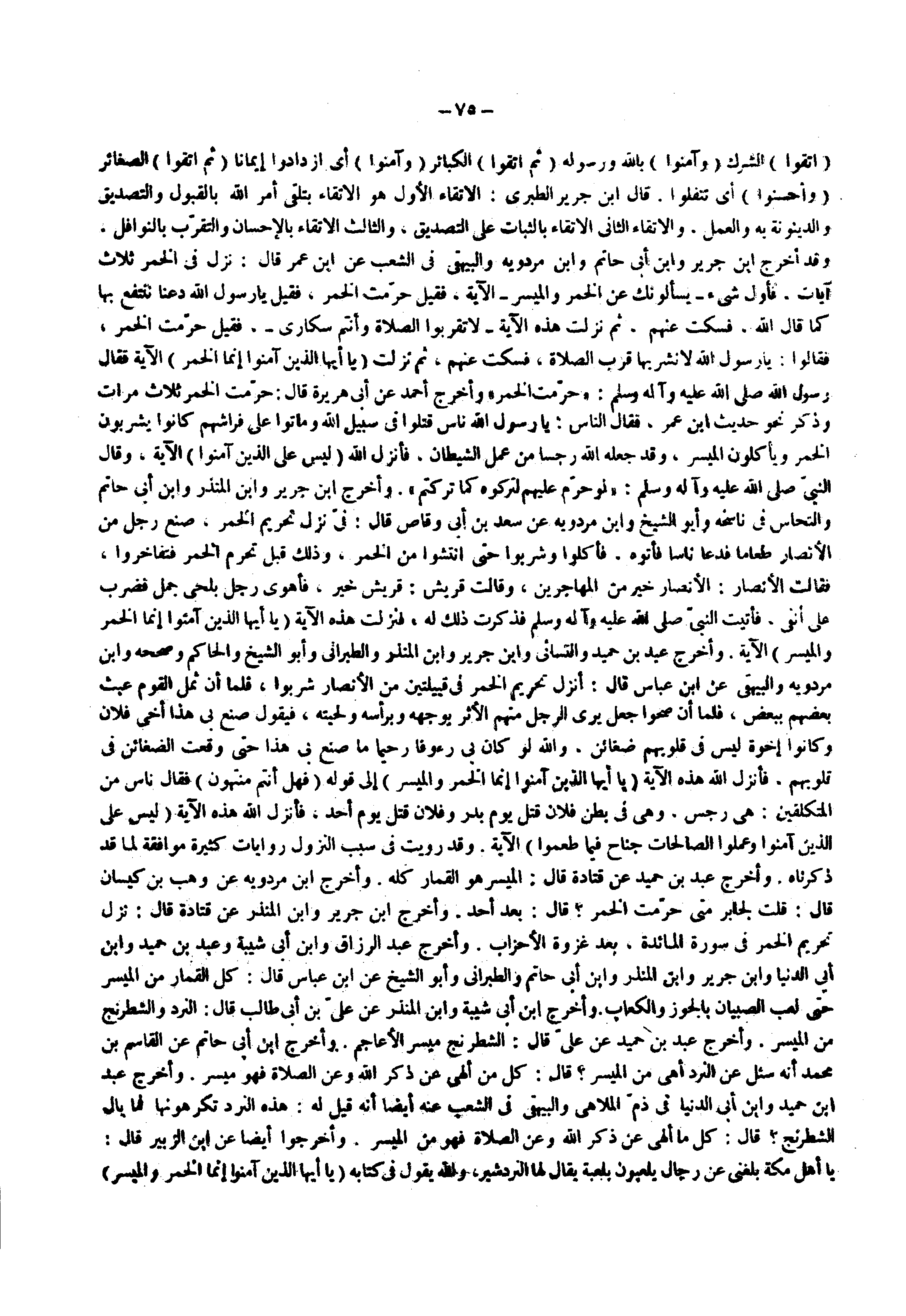 وقد أخرج ابن جرير وابن أبي حاتم وابن مردويه والبيهقي في الشعب عن ابن عمر قال نزل في الخمر ثلاث آيات فأول شيء ) يسألونك عن الخمر والميسر ( الآية فقيل حرمت الخمر فقيل يا رسول الله دعنا ننتفع بها كما قال الله فسكت عنهم ثم نزلت هذه الآية ) لا تقربوا الصلاة وأنتم سكارى ( فقيل حرمت الخمر فقالوا يا رسول الله لا نشربها قرب الصلاة فسكت عنهم ثم نزلت ) يا أيها الذين آمنوا إنما الخمر ( الآية فقال رسول الله ( صلى الله عليه وسلم ) حرمت الخمر وأخرج أحمد عن أبي هريرة قال حرمت الخمر ثلاث مرات وذكر نحو حديث ابن عمر فقال الناس يا رسول الله ناس قتلوا في سبيل الله وماتوا على فراشهم كانوا يشربون الخمر ويأكلون الميسر وقد جعله الله رجسا من عمل الشيطان فأنزل الله ) ليس على الذين آمنوا ( الآية وقال النبي ( صلى الله عليه وسلم ) لو حرم عليهم لتركوه كما تركتم وأخرج ابن جرير وابن المنذر وابن أبي حاتم والنحاس في ناسخه وأبو الشيخ وابن مردويه عن سعد بن أبي وقاص قال في نزل تحريم الخمر صنع رجل من الأنصار طعاما فدعا ناسا فأتوه فأكلوا وشربوا حتى انتشوا من الخمر وذلك قبل تحرم الخمر فتفاخروا فقالت الأنصار الأنصار خير من المهاجرين وقالت قريش قريش خير فأهوى رجل بلحي جمل فضرب على أنفي فأتيت النبي ( صلى الله عليه وسلم ) فذكرت ذلك له فنزلت هذه الآية ) يا أيها الذين آمنوا إنما الخمر والميسر ( الآية وأخرج عبد بن حميد والنسائي وابن جرير وابن المنذر والطبراني وأبو الشيخ والحاكم وصححه وابن مردويه والبيهقي عن ابن عباس قال أنزل تحريم الخمر في قبيلتين من الأنصار شربوا فلما أن ثمل القوم عبث بعضهم ببعض فلما أن صحوا جعل يرى الرجل منهم الأثر بوجهه وبرأسه ولحيته فيقول صنع بي هذا أخي فلان وكانوا إخوة ليس في قلوبهم ضغائن والله لو كان بي رءوفا رحيما ما صنع بي هذا حتى وقعت الضغائن في قلوبهم فأنزل الله هذه الآية ) يا أيها الذين آمنوا إنما الخمر والميسر ( إلى قوله ) فهل أنتم منتهون ( فقال ناس من المتكلفين هي رجس وهي في بطن فلان قتل يوم بدر وفلان قتل يوم أحد فأنزل الله هذه الآية ) ليس على الذين آمنوا وعملوا الصالحات جناح فيما طعموا ( الآية وقد رويت في سبب النزول روايات كثيرة موافقة لما قد ذكرناه وأخرج عبد بن حميد عن قتادة قال الميسر هو القمار كله وأخرج ابن مردويه عن وهب بن كيسان قال قلت لجابر متى حرمت الخمر قال بعد أحد وأخرج ابن جرير وابن المنذر عن قتادة قال نزل تحريم الخمر في سورة المائدة بعد غزوة الأحزاب وأخرج عبد الرزاق وابن أبي شيبة وعبد بن حميد وابن أبي الدنيا وابن جرير وابن المنذر وابن أبي حاتم والطبراني وأبو الشيخ عن ابن عباس قال كل القمار من الميسر حتى لعب الصبيان بالجوز والكعاب وأخرج ابن أبي شيبة وابن المنذر عن علي بن أبي طالب قال النرد والشطرنج من الميسر وأخرج عبد بن حميد عن علي قال الشطرنج ميسر الأعاجم وأخرج ابن أبي حاتم عن القاسم بن محمد أنه سئل عن النرد أهي من الميسر قال كل من ألهى عن ذكر الله وعن الصلاة فهو من ميسر وأخرج عبد ابن حميد وابن أبي الدنيا في ذم الملاهي والبيهقي في الشعب عنه أيضا أنه قيل له هذه النرد تكرهونها فما بال الشطرنج قال كل ما ألهى عن ذكر الله وعن الصلاة فهو من الميسر وأخرجوا أيضا عن ابن الزبير قال يا أهل مكة بلغني عن رجال يلعبون بلعبة يقال لها النردشير والله يقول في كتابه ) يا أيها الذين آمنوا إنما الخمر والميسر (