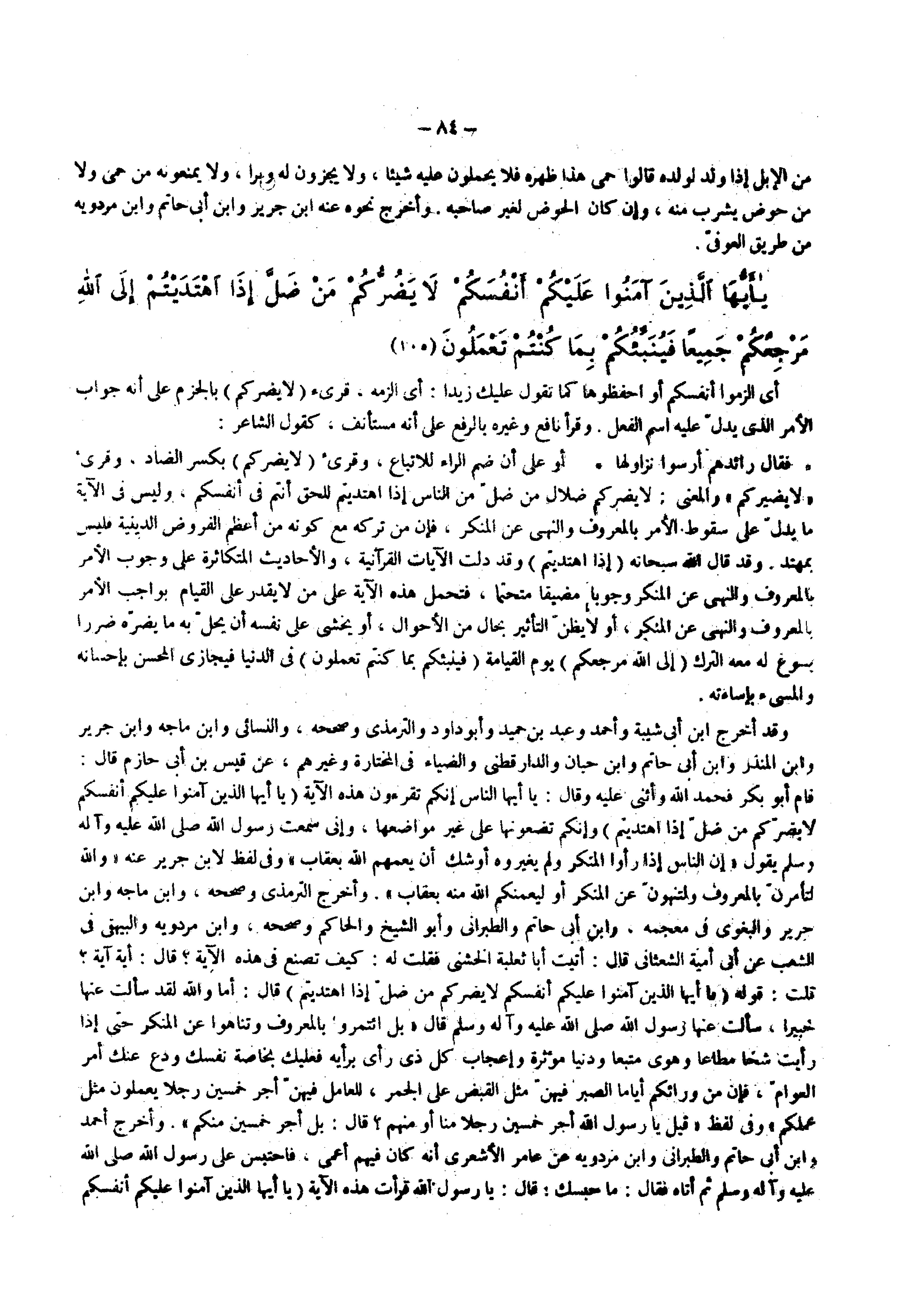 وقد أخرج ابن أبي شيبة وأحمد وعبد بن حميد وأبو داود والترمذي وصححه والنسائي وابن ماجه وابن جرير وابن المنذر وابن أبي حاتم وابن حبان والدارقطني والضياء في المختارة وغيرهم عن قيس بن أبي حازم قال قام أبو بكر فحمد الله وأثنى عليه وقال يا أيها الناس إنكم تقرءون هذه الآية ) يا أيها الذين آمنوا عليكم أنفسكم لا يضركم من ضل إذا اهتديتم ( وإنكم تضعونها على غير مواضعها وإني سمعت رسول الله ( صلى الله عليه وسلم ) يقول إن الناس إذا رأوا المنكر ولم يغيروه أو شك أن يعمهم الله بعقاب وفى لفظ لابن جرير عنه والله لتأمرن بالمعروف ولتنهون عن المنكر أو ليعمنكم الله منه بعقاب وأخرج الترمذي وصححه وابن ماجه وابن جرير والبغوي في معجمه وابن أبي حاتم والطبراني وأبو الشيخ والحاكم وصححه وابن مردويه والبيهقي في الشعب عن أبي أمية الشعثاني قال أتيت أبا ثعلبة الخشني فقلت له كيف تصنع في هذه الآية قال أية آية قلت قوله ) يا أيها الذين آمنوا عليكم أنفسكم لا يضركم من ضل إذا اهتديتم ( قال أما والله لقد سألت عنها خبيرا سألت عنها رسول الله ( صلى الله عليه وسلم ) قال بل ائتمروا بالمعروف وتناهوا عن المنكر حتى إذا رأيت شحا مطاعا وهوى متبعا ودنيا مؤثرة وإعجاب كل ذي رأى برأيه فعليك بخاصة نفسك ودع عنك أمر العوام فإن من ورائكم أياما الصبر فيهن مثل القبض على الجمر للعامل فيهن أجر خمسين رجلا يعملون مثل عملكم وفى لفظ قيل يا رسول الله أجر خمسين رجلا منا أو منهم قال بل أجر خمسين منكم وأخرج أحمد وابن أبي حاتم والطبراني وابن مردويه عن عامر الأشعري أنه كان فيهم أعمى فاحتبس على رسول الله ( صلى الله عليه وسلم ) ثم أتاه فقال ما حبسك قال يا رسول الله قرأت هذه الآية ) أيها الذين آمنوا عليكم أنفسكم لا يضركم من ضل إذا اهتديتم (