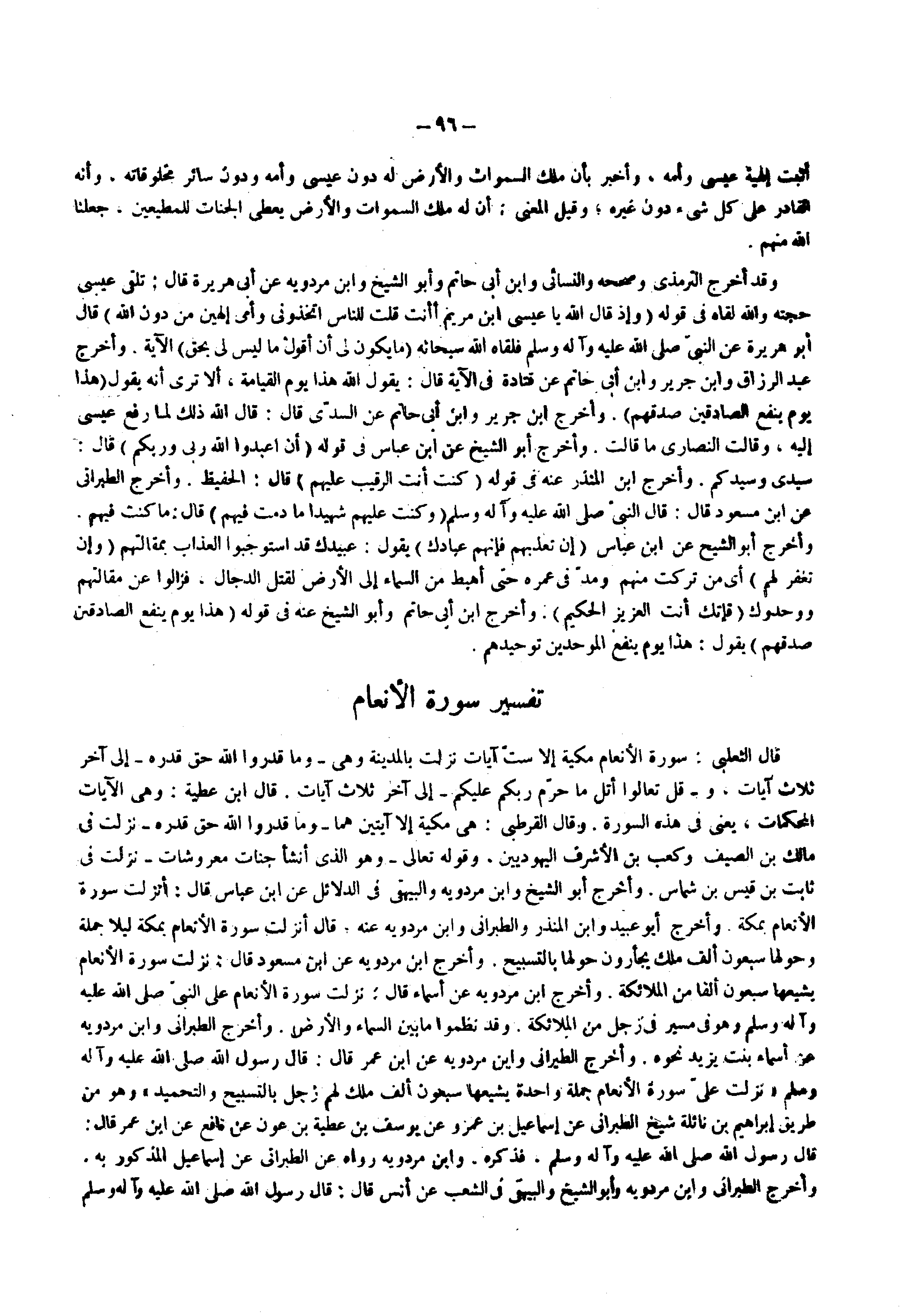 قال الثعلبي سورة الأنعام مكية إلا ست آيات نزلت بالمدينة وهي ) وما قدروا الله حق قدره ( إلى آخر ثلاث آيات و ) قل تعالوا أتل ما حرم ربكم عليكم ( إلى آخر ثلاث آيات قال ابن عطية وهي الآيات المحكمات يعني فى هذه السورة وقال القرطبي هي مكية إلا آيتين هما ) وما قدروا الله حق قدره ( نزلت في مالك بن الصيف وكعب بن الأشرف اليهوديين وقوله تعالى ) وهو الذي أنشأ جنات معروشات ( نزلت في ثابت بن قيس بن شماس وأخرج أبو الشيخ وابن مردويه والبيهقي في الدلائل عن ابن عباس قال أنزلت سورة الأنعام بمكة وأخرج أبو عبيد وابن المنذر والطبراني وابن مردويه عنه قال أنزلت سورة الأنعام بمكة ليلا جملة وحولها سبعون ألف ملك يجأرون حولها بالتسبيح وأخرج ابن مردويه عن ابن مسعود قال نزلت سورة الأنعام يشيعها سبعون ألفا من الملائكة وأخرج ابن مردويه عن أسماء قال نزلت سورة الأنعام على النبي ( صلى الله عليه وسلم ) وهو في مسير في زجل من الملائكة وقد نظموا ما بين السماء والأرض وأخرج الطبراني وابن مردويه عن أسماء بنت يزيد نحوه وأخرج الطبراني وابن مردويه عن ابن عمر قال قال رسول الله ( صلى الله عليه وسلم ) نزلت على سورة الأنعام جملة واحدة يشيعها سبعون ألف ملك لهم زجل بالتسبيح والتحميد وهو من طريق إبراهيم بن نائلة شيخ الطبراني عن إسماعيل بن عمرو عن يوسف بن عطية بن عون عن نافع عن ابن عمر قال قال رسول الله ( صلى الله عليه وسلم ) فذكره وابن مردويه رواه عن الطبراني عن إسماعيل المذكور به وأخرج الطبراني وابن مردويه وأبو الشيخ والبيهقي في الشعب عن أنس قال قال رسول الله ( صلى الله عليه وسلم )
