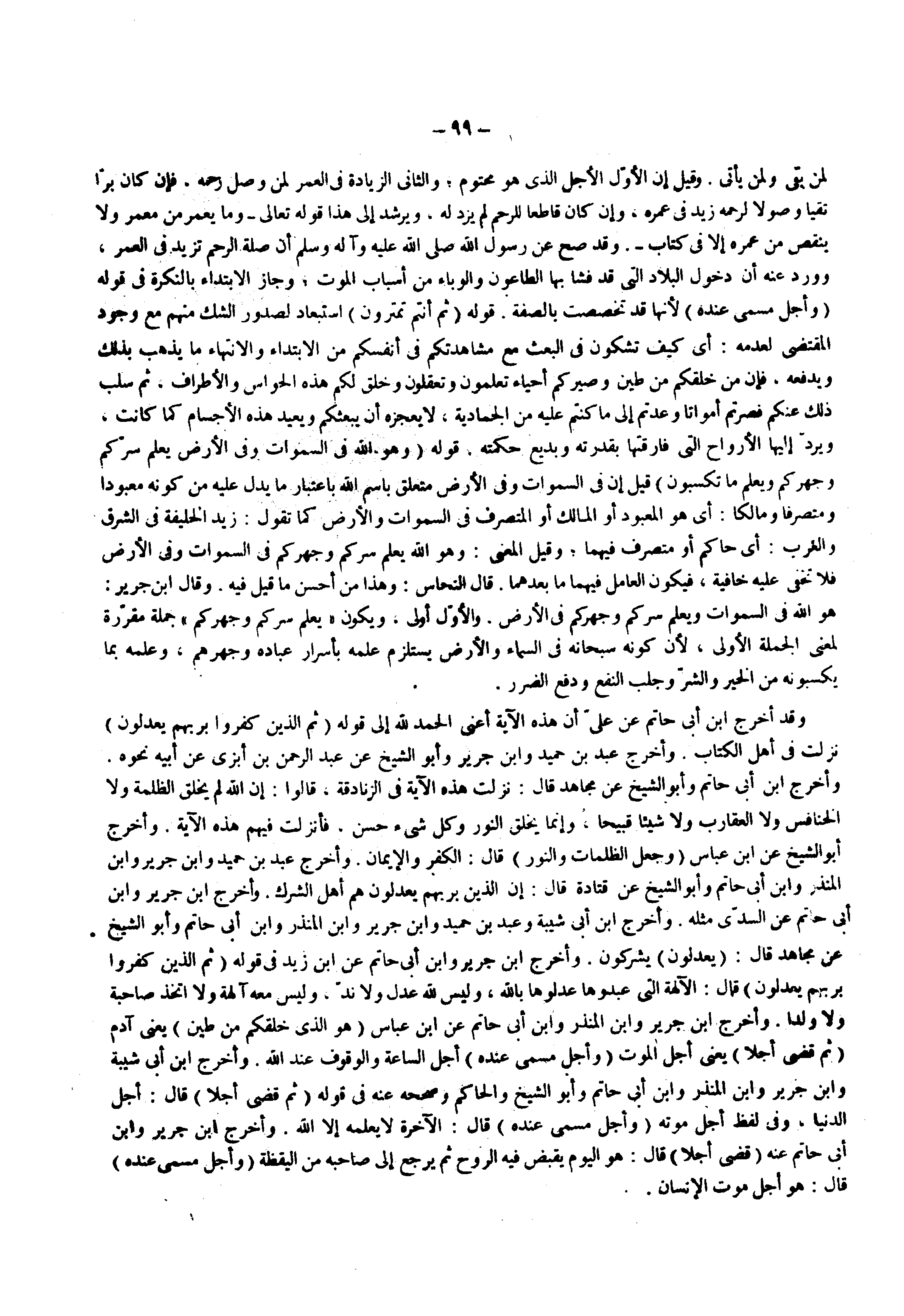 لمن بقى ولمن يأتي وقيل إن الأول الأجل الذى هو محتوم والثاني الزيادة في العمر لمن وصل رحمه فإن كان برا تقيا وصولا لرحمه زيد في عمره وإن كان قاطعا للرحم لم يزد له ويرشد إلى هذا قوله تعالى ) وما يعمر من معمر ولا ينقص من عمره إلا في كتاب ( وقد صح عن رسول الله ( صلى الله عليه وسلم ) أن صلة الرحم تزيد في العمر وورد عنه أن دخول البلاد التى قد فشا بها الطاعون والوباء من أسباب الموت وجاز الابتداء بالنكرة فى قوله ) وأجل مسمى عنده ( لأنها قد تخصصت بالصفة قوله ) ثم أنتم تمترون ( استبعاد لصدور الشك منهم مع وجود المقتضى لعدمه أي كيف تشكون فى البعث مع مشاهدتكم فى أنفسكم من الابتداء والانتهاء ما يذهب بذلك ويدفعه فإن من خلقكم من طين وصيركم أحياء تعلمون وتعقلون وخلق لكم هذه الحواس والأطراف ثم سلب ذلك عنكم فصرتم أمواتا وعدتم إلى ما كنتم عليه من الجماديه لا يعجزه أن يبعثكم ويعيد هذه الأجسام كما كانت ويرد إليها الأرواح التى فارقتها بقدرته وبديع حكمته