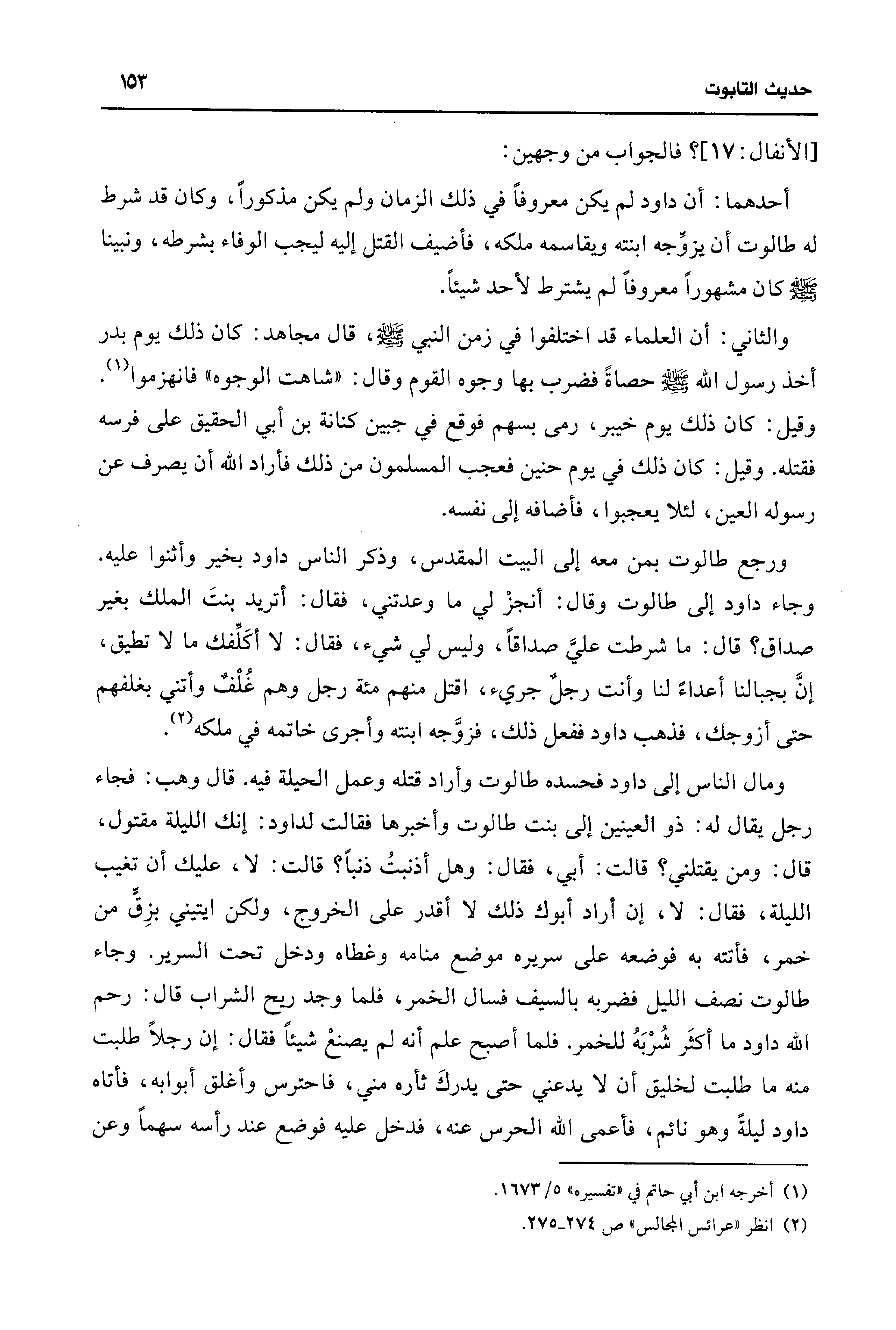 أحدهما: أن داود لم يكن معروفًا في ذلك الزمان ولم يكن مذكورًا، وكان قد شرط له طالوت أن يزوِّجه ابنته ويقاسمه ملكه، فأضيف القتل إليه ليجب الوفاء بشرطه، ونبينا - صلى الله عليه وسلم - كان مشهورًا معروفًا لم يشترط لأحد شيئًا.