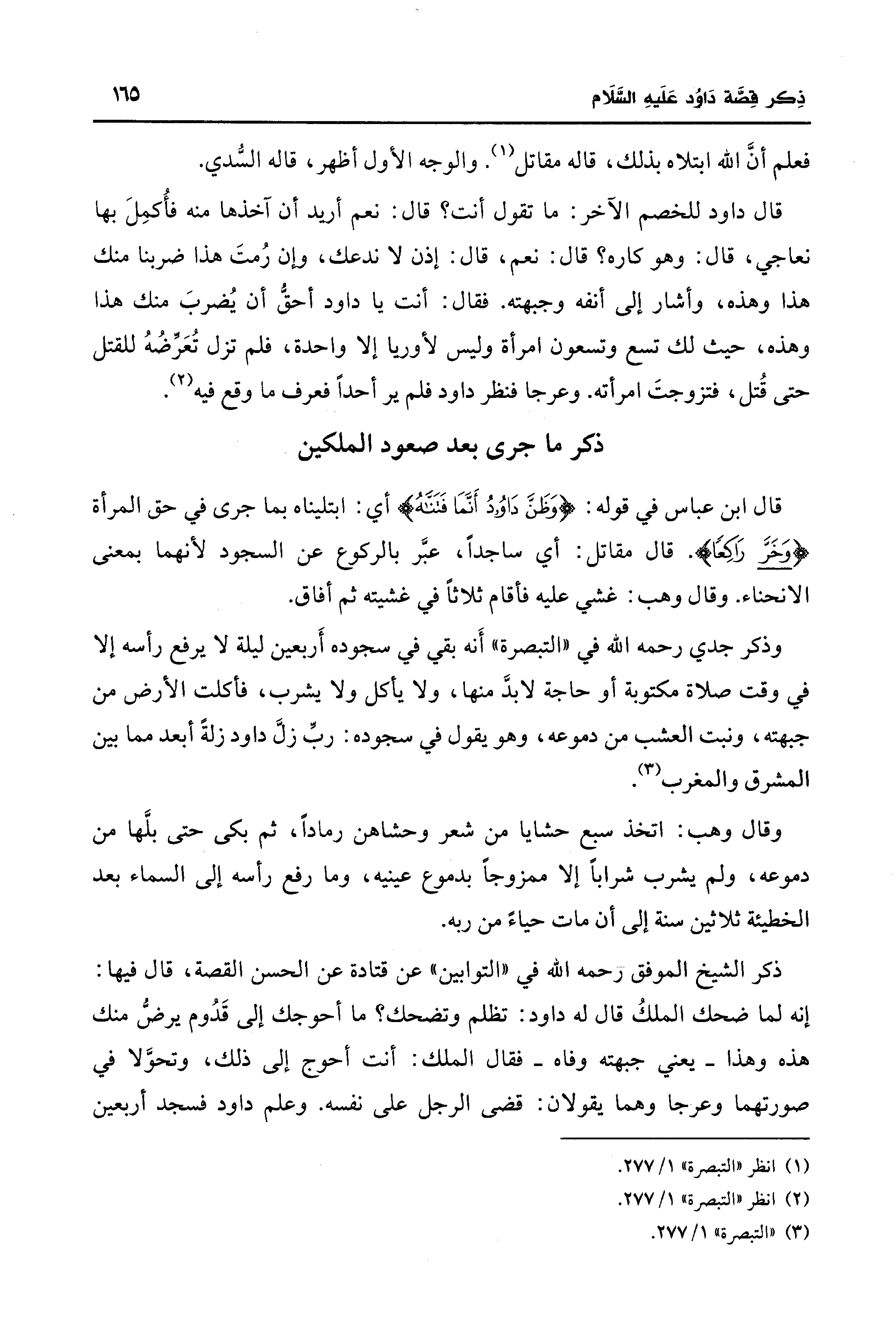 وذكر جدي رحمه الله في "التبصرة" أَنه بقي في سجوده أَربعين ليلة لا يرفع رأسه إلا في وقت صلاة مكتوبة أو حاجة لابدَّ منها، ولا يأكل ولا يشرب، فأكلت الأرض من جبهته، ونبت العشب من دموعه، وهو يقول في سجوده: ربِّ زلَّ داود زلةً أبعد مما بين المشرق والمغرب (¬3).