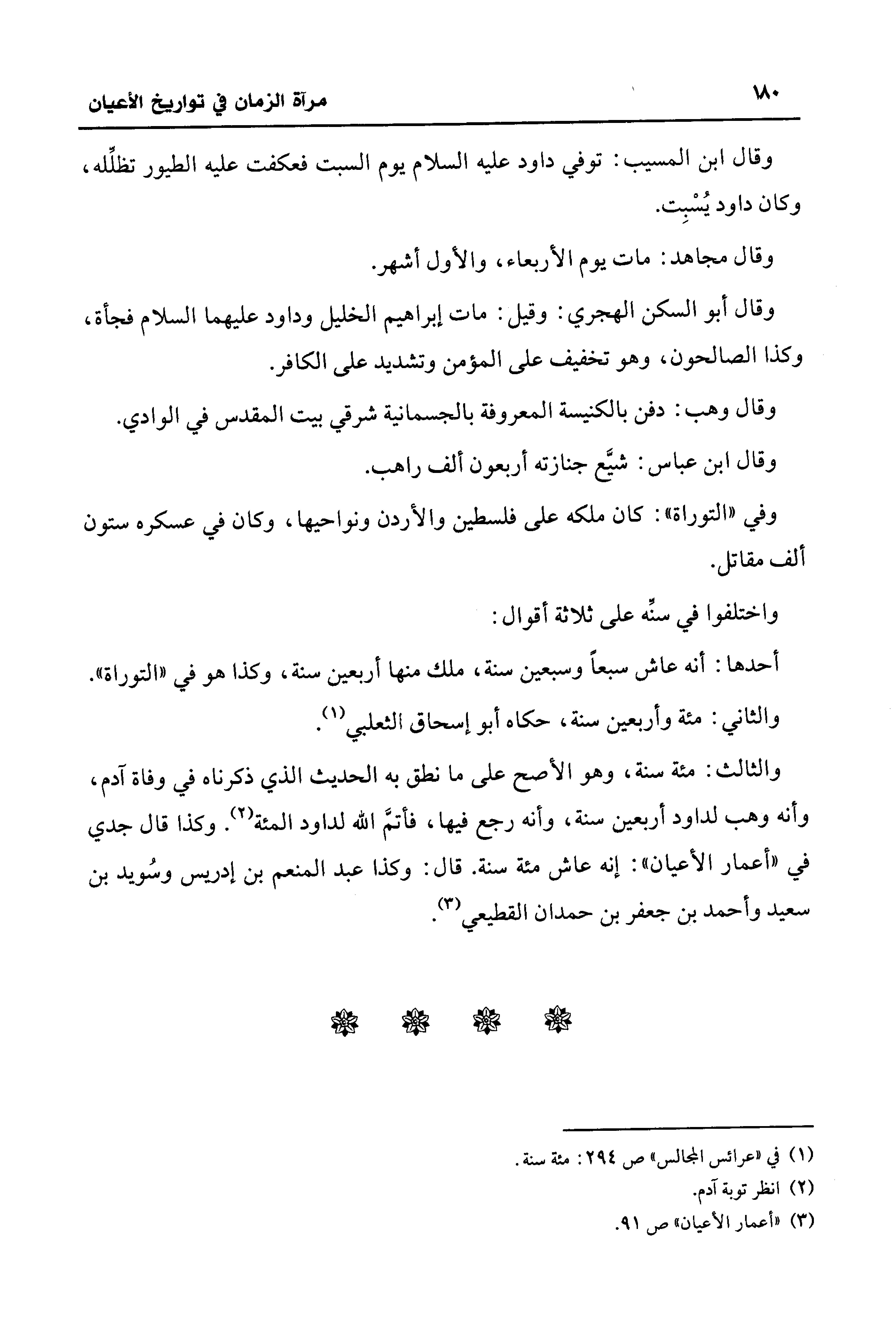 والثالث: مئة سنة، وهو الأصح على ما نطق به الحديث الذي ذكرناه في وفاة آدم، وأنه وهب لداود أربعين سنة، وأنه رجع فيها، فأتمَّ الله لداود المئة (¬2). وكذا قال جدي في "أعمار الأعيان": إنه عاش مئة سنة. قال: وكذا عبد المنعم بن إدريس وسُويد بن سعيد وأحمد بن جعفر بن حمدان القطيعي (¬3).