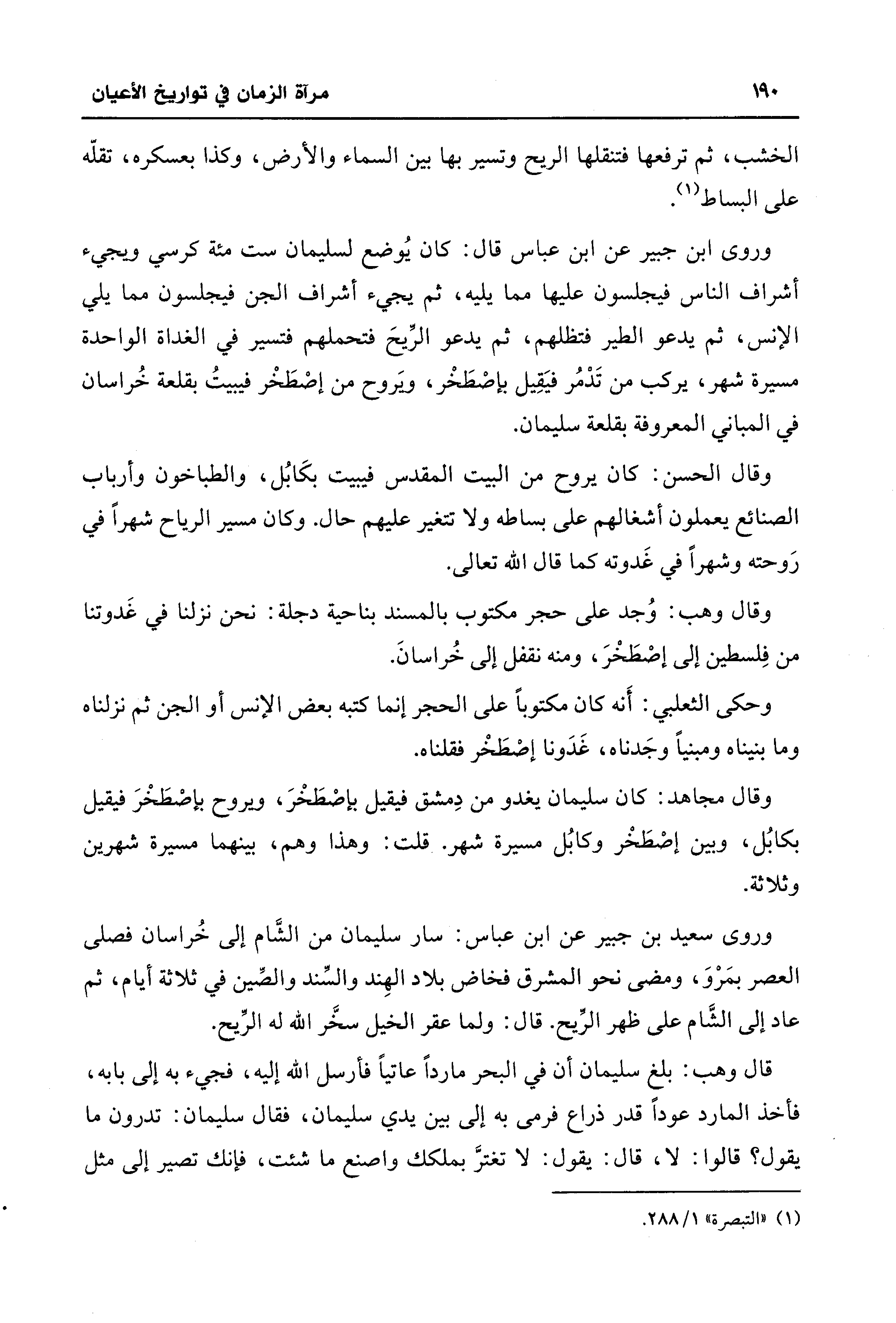 وروى ابن جبير عن ابن عباس قال: كان يُوضع لسليمان ست مئة كرسي ويجيء أشراف الناس فيجلسون عليها مما يليه، ثم يجيء أشراف الجن فيجلسون مما يلي الإنس، ثم يدعو الطير فتظلهم، ثم يدعو الرِّيحَ فتحملهم فتسير في الغداة الواحدة مسيرة شهر، يركب من تَدْمُر فيَقِيل بإصْطَخْر، وَيروح من إصْطَخْر فيبيتُ بقلعة خُراسان في المباني المعروفة بقلعة سليمان.