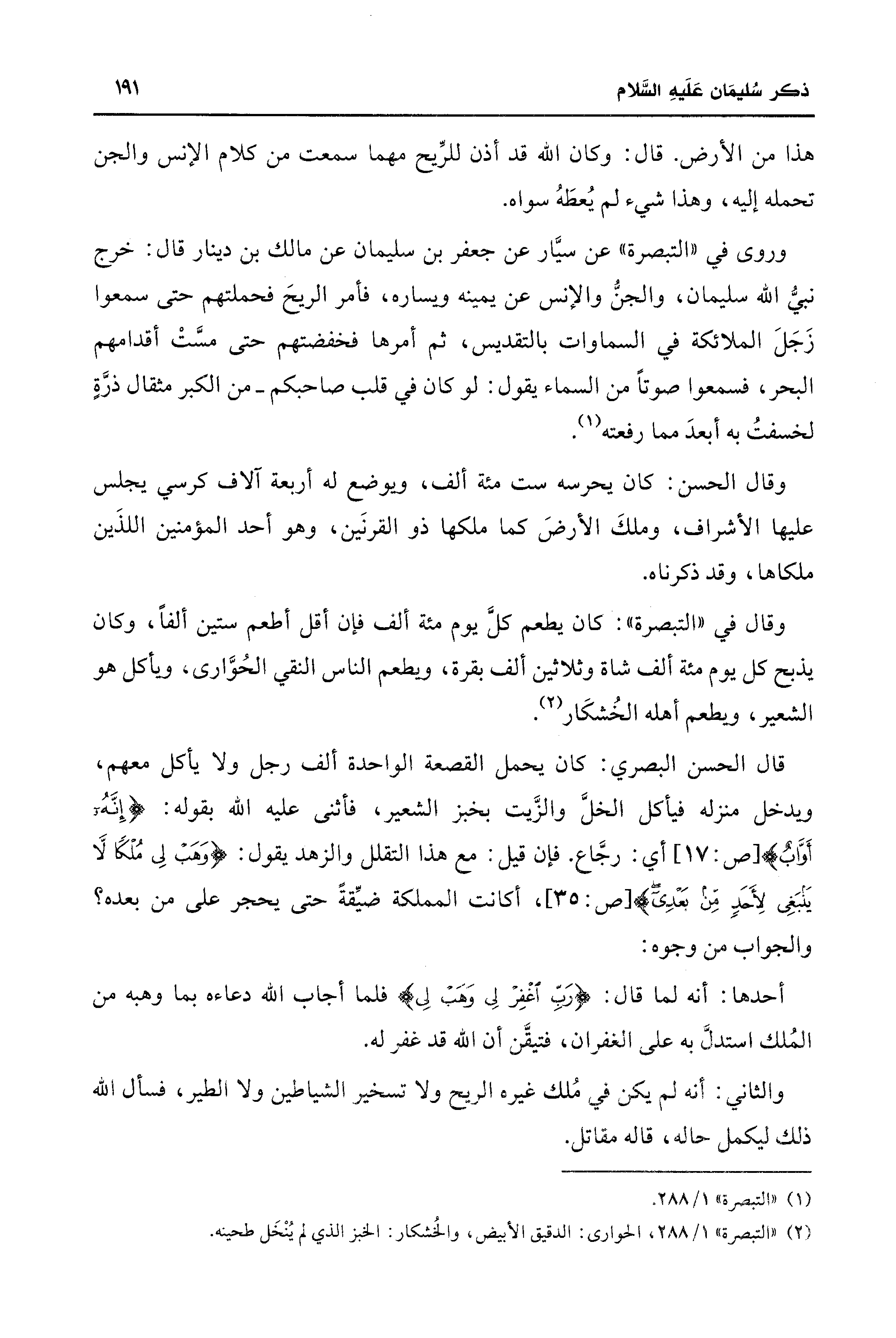 وروى في "التبصرة" عن سيَّار عن جعفر بن سليمان عن مالك بن دينار قال: خرج نبيُّ الله سليمان، والجن والإنس عن يمينه ويساره، فأمر الريحَ فحملتهم حتى سمعوا زَجَلَ الملائكة في السماوات بالتقديس، ثم أمرها فخفضتهم حتى مسَّتْ أقدامهم البحر، فسمعوا صوتًا من السماء يقول: لو كان في قلب صاحبكم- من الكبر مثقال ذرَّةٍ لخسفتُ به أبعدَ مما رفعته (¬1).