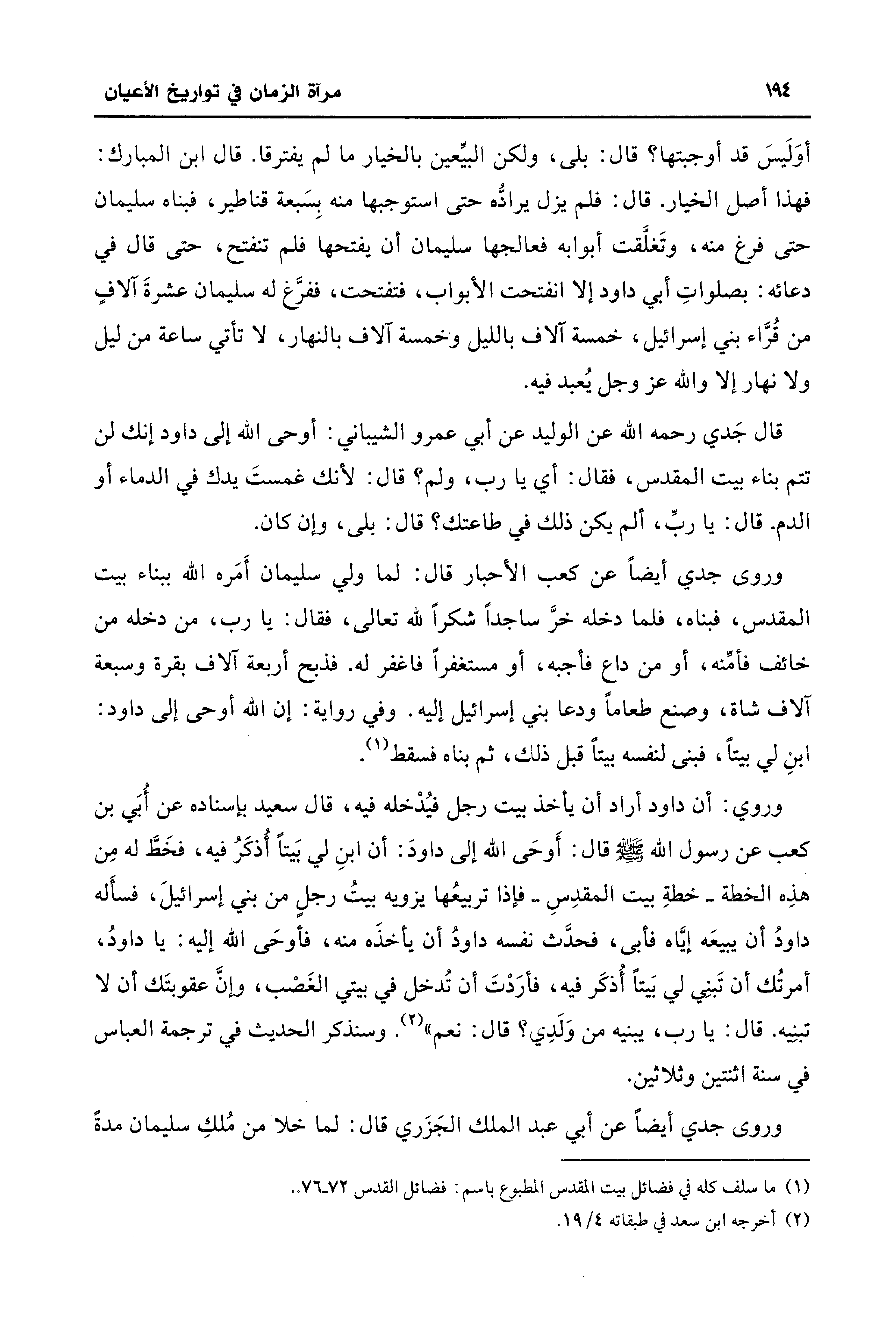 أولَيسَ قد أوجبتها؟ قال: بلى، ولكن البيِّعين بالخيار ما لم يفترقا. قال ابن المبارك: فهذا أصل الخيار. قال: فلم يزل يرادُّه حتى استوجبها منه بِسَبعة قناطير، فبناه سليمان حتى فرغ منه، وتَغلَّقت أبوابه فعالجها سليمان أن يفتحها فلم تنفتح، حتى قال في دعائه: بصلواتِ أبي داود إلا انفتحت الأبواب، فتفتحت، ففرَّغ له سليمان عشرةَ آلافٍ من قُرَّاء بني إسرائيل، خمسة آلاف بالليل وخمسة آلاف بالنهار، لا تأتي ساعة من ليل ولا نهار إلا والله عز وجل يُعبد فيه.