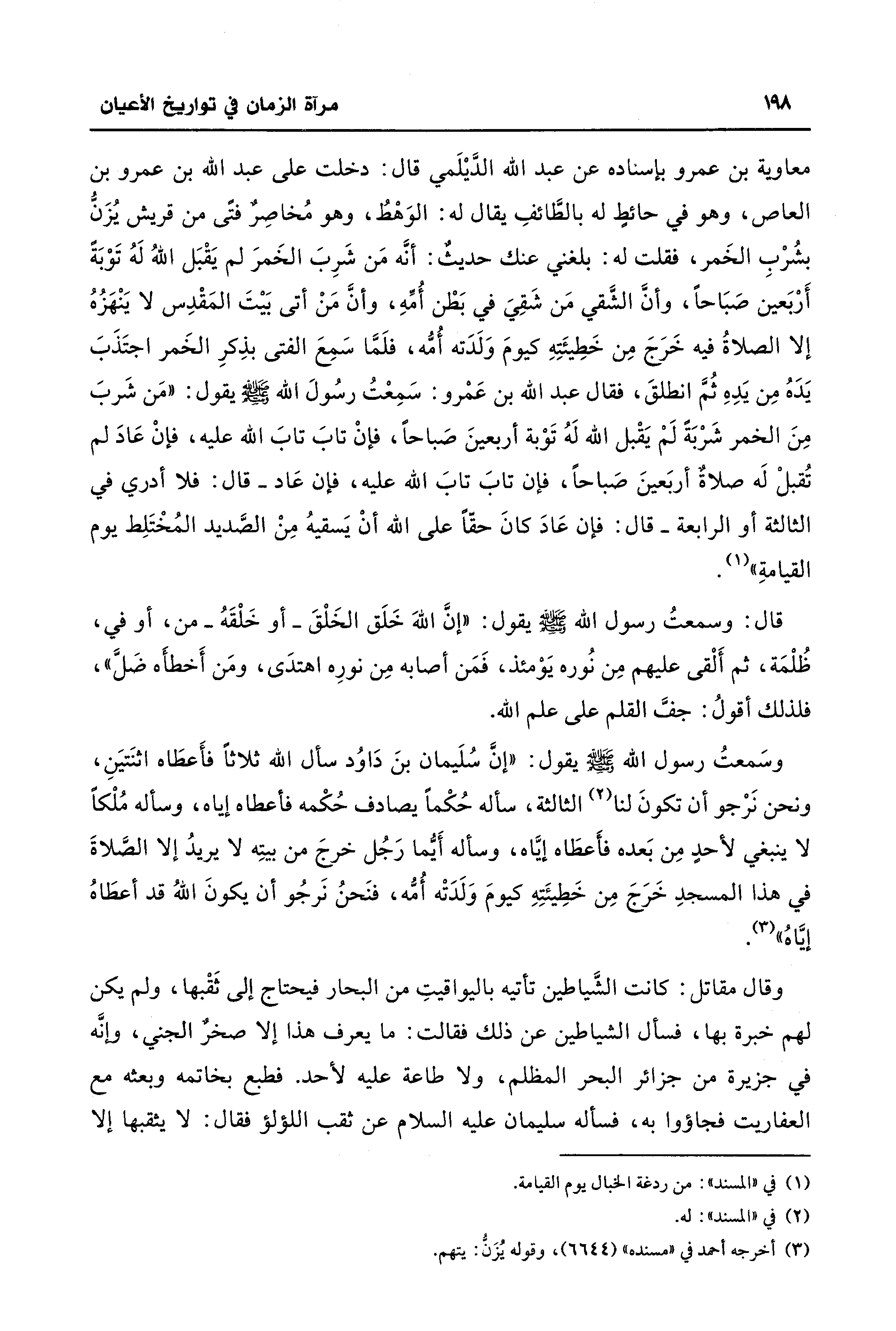 معاوية بن عمرو بإسناده عن عبد الله الدَّيْلَمي قال: دخلت على عبد الله بن عمرو بن العاص، وهو في حائطٍ له بالطَّائفِ يقال له: الوَهْطُ، وهو مُخاصِرٌ فتًى من قريش يُزَنُّ بشُربِ الخَمر، فقلت له: بلغني عنك حديثٌ: أنَّه مَن شَرِبَ الخَمرَ لم يَقْبَل اللهُ لَهُ تَوْبَةً أَربَعين صَبَاحًا، وأنَّ الشَّقي مَن شَقِيَ في بَطْن أُمِّهِ، وأنَّ مَنْ أتى بَيْتَ المَقْدِس لا يَنْهزُهُ إلا الصلاةُ فيه خَرَجَ مِن خَطِيئَتِهِ كيومَ وَلَدَته أُمُّه، فلَمَّا سَمِعَ الفتى بذِكرِ الخَمر اجتَذَبَ يَدَهُ مِن يَدهِ ثُمَّ انطلقَ، فقال عبد الله بن عَمرو: سَمِعْتُ رسُولَ الله - صلى الله عليه وسلم - يقول: "مَن شَربَ مِنَ الخمر شَربَةً لَمْ يَقْبل الله لَهُ تَوْبة أربعينَ صَباحًا، فإنْ تابَ تابَ الله عليه، فإنْ عَادَ لم تُقبلْ لَه صلا أربَعينَ صَباحًا، فإن تابَ تابَ الله عليه، فإن عَاد- قال: فلا أدري في الثالثة أو الرابعة- قال: فإن عَادَ كانَ حقًا على الله أنْ يَسقيهُ مِنْ الصَّديد المُخْتَلِط يوم القيامةِ" (¬1).