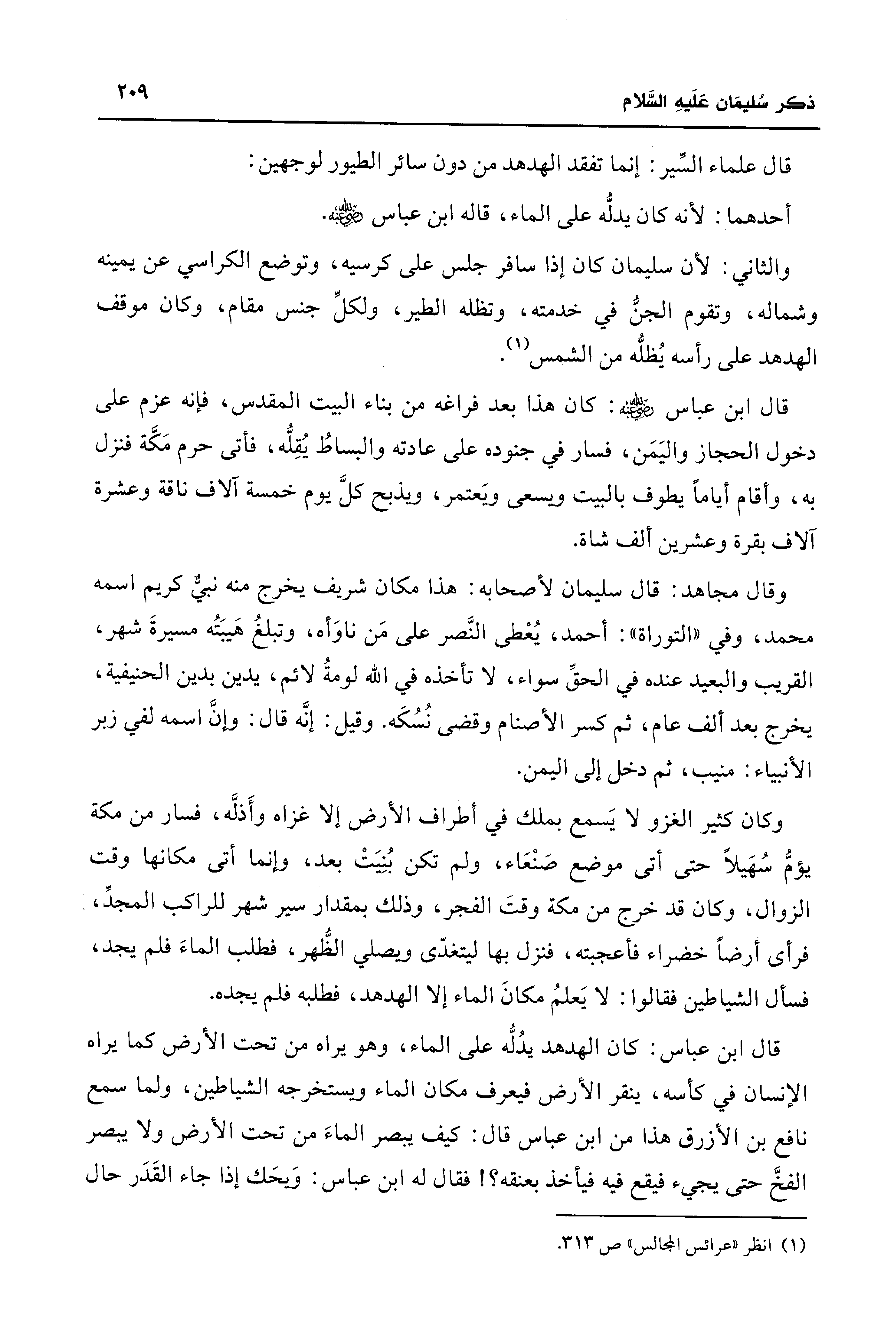 وقال مجاهد: قال سليمان لأصحابه: هذا مكان شريف يخرج منه نبيٌّ كريم اسمه محمد، وفي "التوراة": أحمد، يُعْطى النَّصر على مَن ناوَأه، وتبلغُ هيبَتُه مسيرةَ شهر، القريب والبعيد عنده في الحقِّ سواء، لا تأخذه في الله لومةُ لائم، يدين بدين الحنيفية، يخرج بعد ألف عام، ثم كسر الأصنام وقضى نُسُكَه. وقيل: إنَّه قال: وإنَّ اسمه لفي زبر الأنبياء: منيب، ثم دخل إلى اليمن.