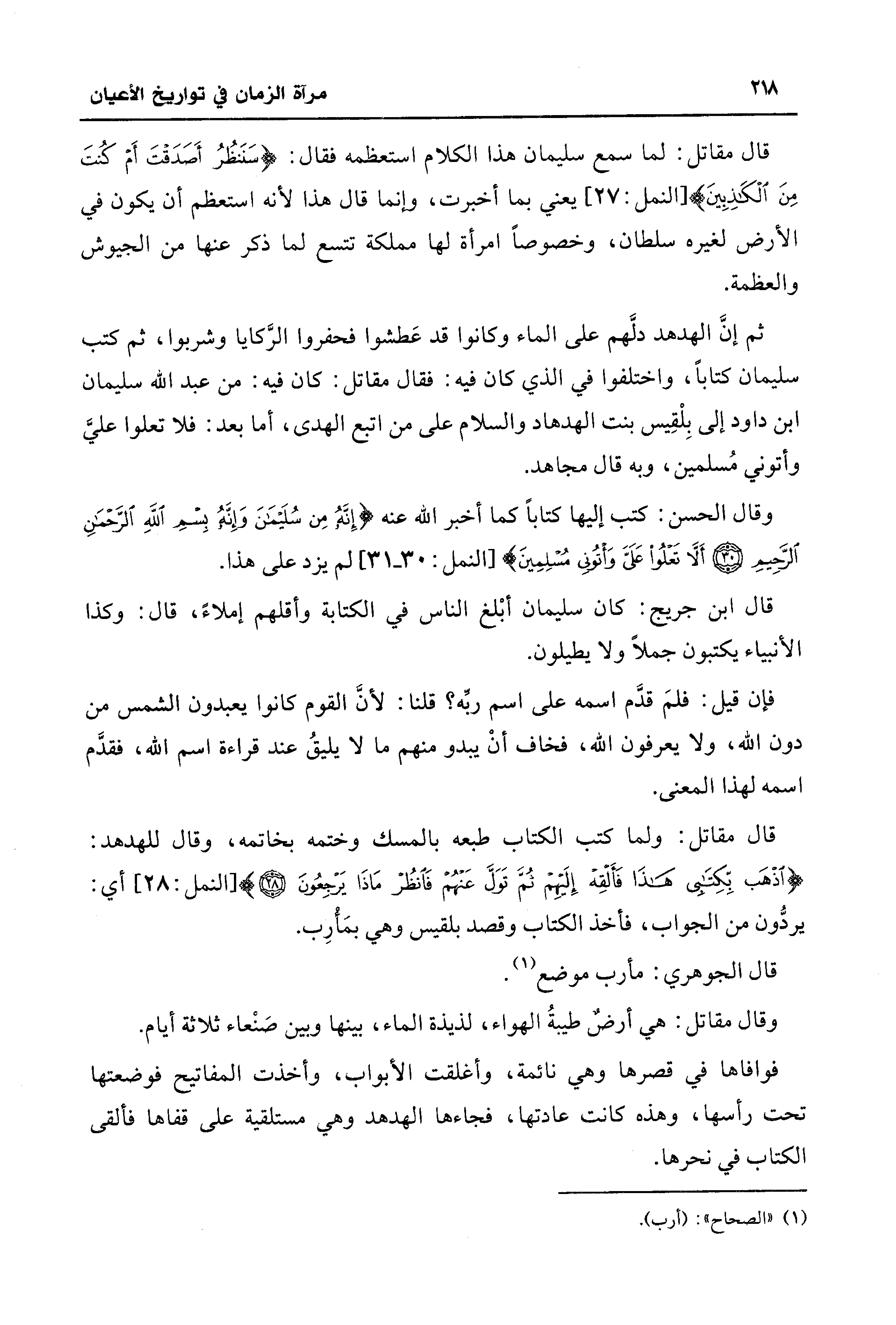 ثم إنَّ الهدهد دلَّهم على الماء وكانوا قد عَطشوا فحفروا الرَّكايا وشربوا، ثم كتب سليمان كتابًا، واختلفوا في الذي كان فيه: فقال مقاتل: كان فيه: من عبد الله سليمان ابن داود إلى بِلْقِيس بنت الهدهاد والسلام على من اتبع الهدى، أما بعد: فلا تعلوا عليَّ وأتوني مُسلمين، وبه قال مجاهد.