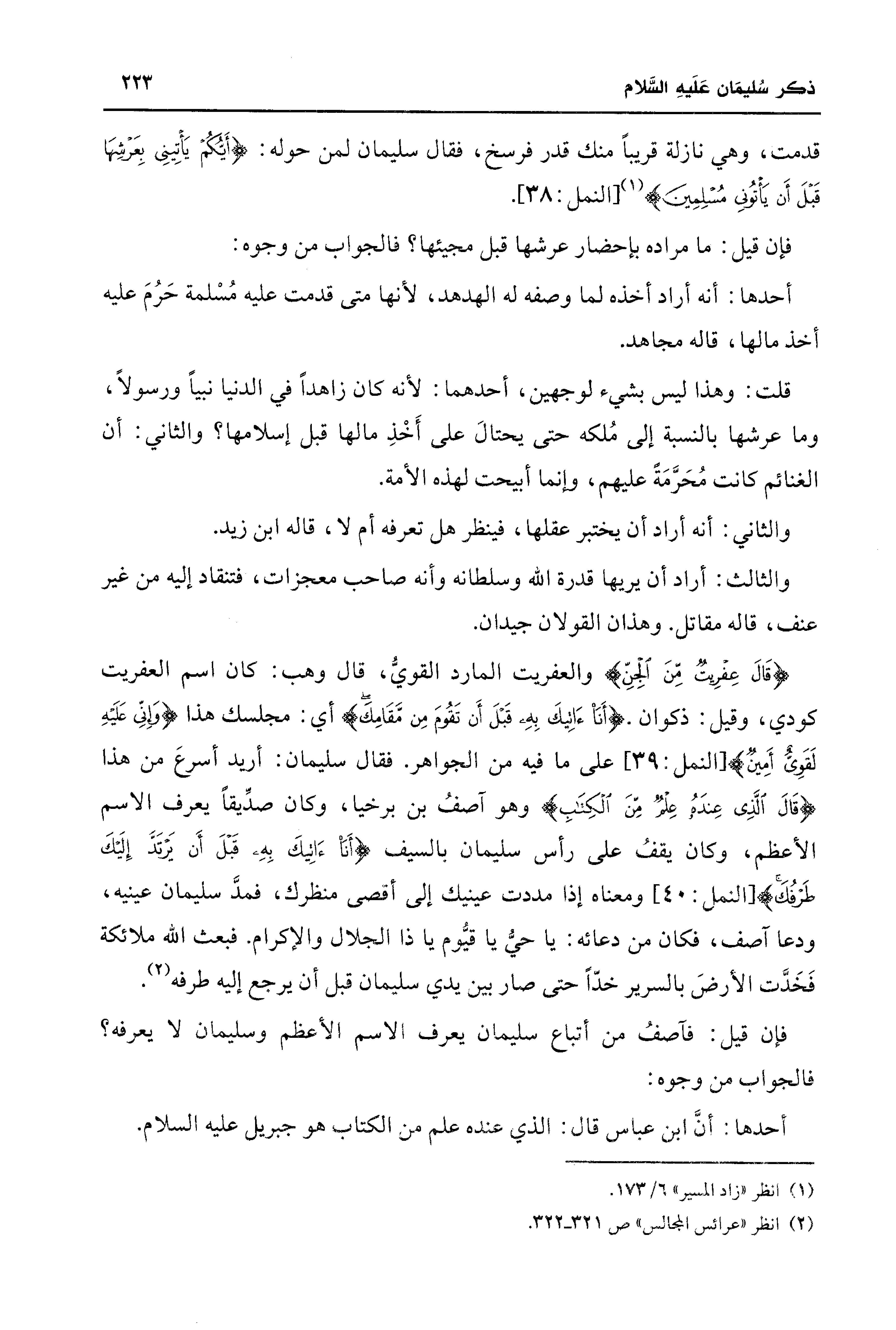 {قَالَ عِفْرِيتٌ مِنَ الْجِنِّ} والعفريت المارد القويُّ، قال وهب: كان اسم العفريت كودي، وقيل: ذكوان. {أَنَا آتِيكَ بِهِ قَبْلَ أَنْ تَقُومَ مِنْ مَقَامِكَ} أي: مجلسك هذا {وَإِنِّي عَلَيْهِ لَقَوِيٌّ أَمِينٌ} [النمل: 39] على ما فيه من الجواهر. فقال سليمان: أريد أسرعَ من هذا {قَالَ الَّذِي عِنْدَهُ عِلْمٌ مِنَ الْكِتَابِ} وهو آصفُ بن برخيا، وكان صدِّيقًا يعرف الاسم الأعظم، وكان يقفُ على رأس سليمان بالسيف {أَنَا آتِيكَ بِهِ قَبْلَ أَنْ يَرْتَدَّ إِلَيْكَ طَرْفُكَ} [النمل: 40] ومعناه إذا مددت عينيك إلى أقصى منظرك، فمدَّ سليمان عينيه، ودعا آصف، فكان من دعائه: يا حيُّ يا قيُّوم يا ذا الجلال والإكرام. فبعث الله ملائكة فَخَدَّت اللأرضَ بالسرير خدًّا حتى صار بين يدي سليمان قبل أن يرجع إليه طرفه (¬2).