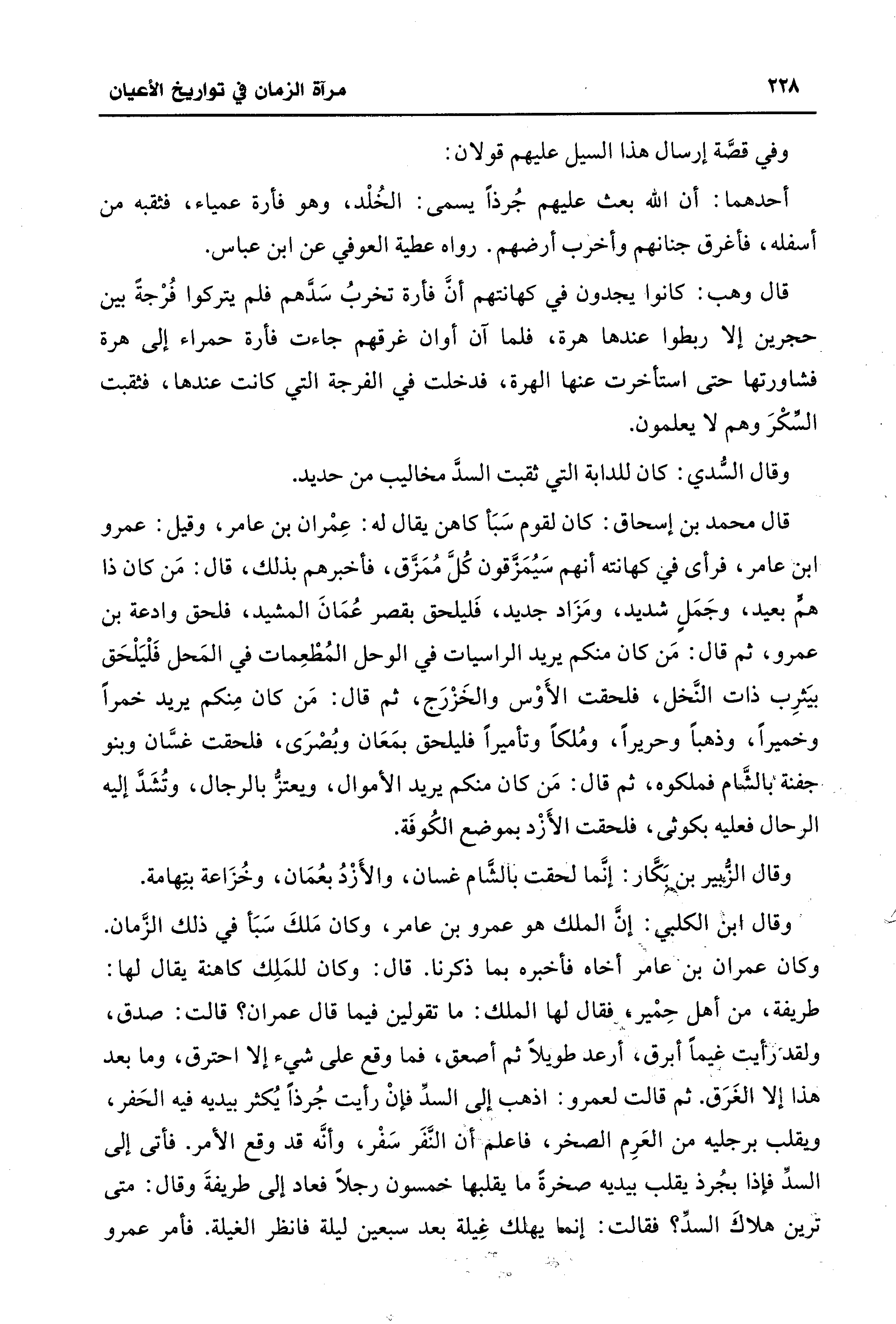 وقال ابن الكلبي: إنَّ الملك هو عمرو بن عامر، وكان مَلكَ سَبَأ في ذلك الزَّمان. وكان عمران بن عامر أخاه فأخبره بما ذكرنا. قال: وكان للمَلِك كاهنة يقال لها: طريفة، من أهل حِمْير، فقال لها الملك: ما تقولين فيما قال عمران؟ قالت: صدق، ولقد رأيت غيمًا أبرق، أرعد طويلًا ثم أصعق، فما وقع على شيء إلا احترق، وما بعد هذا إلا الغَرَق. ثم قالت لعمرو: اذهب إلى السدِّ فإنْ رأيت جُرذًا يُكثر بيديه فيه الحَفر، ويقلب برجليه من العَرِم الصخر، فاعلم أن النَّفَر سَفْر، وأنَّه قد وقع الأمر. فأتى إلى السدِّ فإذا بجُرذ يقلب بيديه صخرةً ما يقلبها خمسون رجلًا فعاد إلى طريفةَ وقال: متى ترين هلاكَ السدِّ؟ فقالت: إنما يهلك غِيلة بعد سبعين ليلة فانظر الغيلة. فأمر عمرو