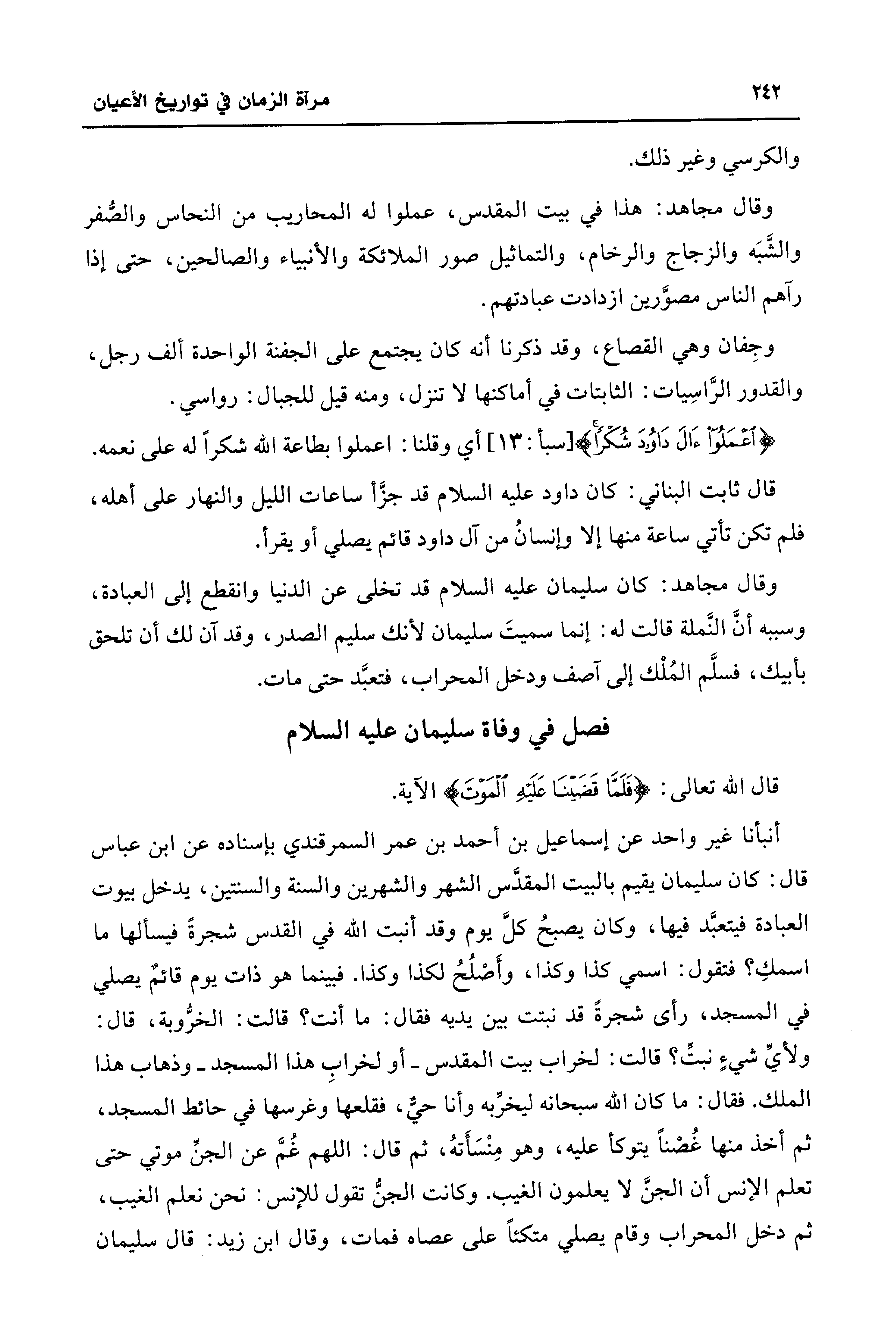 أنبأنا غير واحد عن إسماعيل بن أحمد بن عمر السمرقندي بإسناده عن ابن عباس قال: كان سليمان يقيم بالبيت المقدَّس الشهر والشهرين والسنة والسنتين، يدخل بيوت العبادة فيتعبَّد فيها، وكان يصبحُ كلَّ يوم وقد أنبت الله في القدس شجرةً فيسألها ما اسمكِ؟ فتقول: اسمي كذا وكذا، وأَصْلُحُ لكذا وكذا. فبينما هو ذات يوم قائمٌ يصلي في المسجد، رأى شجرةً قد نبتت بين يديه فقال: ما أنت؟ قالت: الخرُّوبة، قال: ولأيِّ شيءٍ نبتِّ؟ قالت: لخراب بيت المقدس- أو لخرابِ هذا المسجد- وذهاب هذا الملك. فقال: ما كان الله سبحانه ليخرِّبه وأنا حيٌّ، فقلعها وغرسها في حائط المسجد، ثم أخذ منها غُصْنًا يتوكأ عليه، وهو مِنْسَأَتهُ، ثم قال: اللهم غُمَّ عن الجنِّ موتي حتى تعلم الإنس أن الجنَّ لا يعلمون الغيب. وكانت الجنُّ تقول للإنس: نحن نعلم الغيب، ثم دخل المحراب وقام يصلي متكئًا على عصاه فمات، وقال ابن زيد: قال سليمان