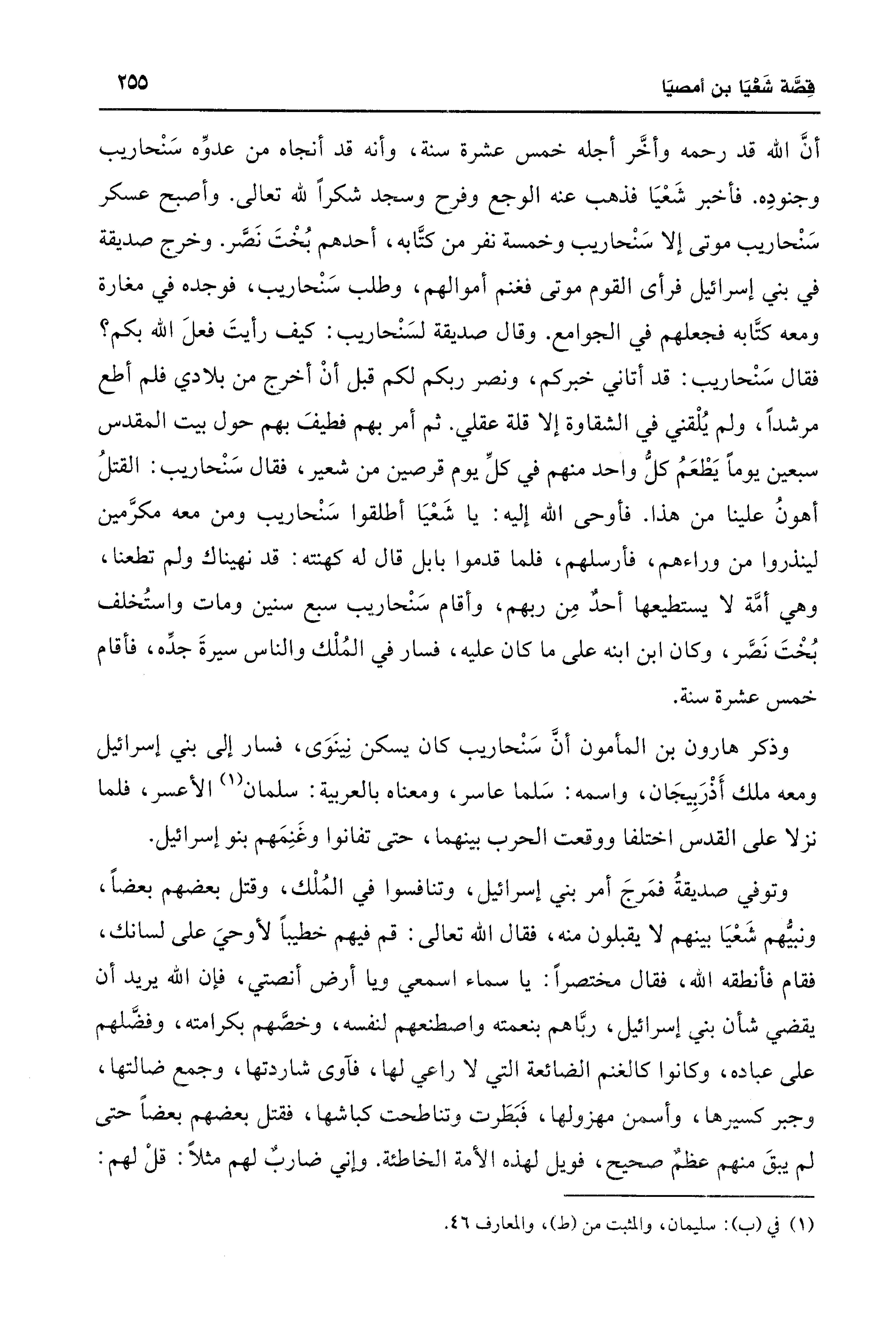 أنَّ الله قد رحمه وأخَّر أجله خمس عشرة سنة، وأنه قد أنجاه من عدوِّه سَنْحاريب وجنودِه. فأخبر شَعْيَا فذهب عنه الوجع وفرح وسجد شكرًا لله تعالى. وأصبح عسكر سَنْحاريب موتى إلا سَنْحاريب وخمسة نفر من كتَّابه، أحدهم بُخْتَ نَصَّر. وخرج صديقة في بني إسرائيل فرأى القوم موتى فغنم أموالهم، وطلب سَنْحاريب، فوجده في مغارة ومعه كتَّابه فجعلهم في الجوامع. وقال صديقة لسَنْحاريب: كيف رأيتَ فعلَ الله بكم؟ فقال سَنْحاريب: قد أتاني خبركم، ونصر ربكم لكم قبل أنْ أخرج من بلادي فلم أطع مرشدًا، ولم يُلْقني في الشقاوة إلا قلة عقلي. ثم أمر بهم فطيفَ بهم حول بيت المقدس سبعين يومًا يَطْعَمُ كل واحد منهم في كلِّ يوم قرصين من شعير، فقال سَنْحاريب: القتلُ أهونُ علينا من هذا. فأوحى الله إليه: يا شَعْيَا أطلقوا سَنْحاريب ومن معه مكرَّمين لينذروا من وراءهم، فأرسلهم، فلما قدموا بابل قال له كهنته: قد نهيناك ولم تطعنا، وهي أمَّة لا يستطيعها أحدٌ مِنْ ربهم، وأقام سَنْحاريب سبع سنين ومات واستُخلف بُخْتَ نَصَّر، وكان ابن ابنه على ما كان عليه، فسار في المُلْك والناس سيرةَ جدِّه، فأقام خمس عشرة سنة.